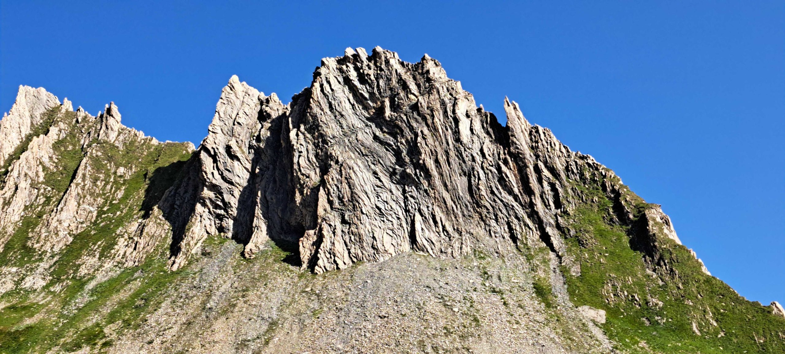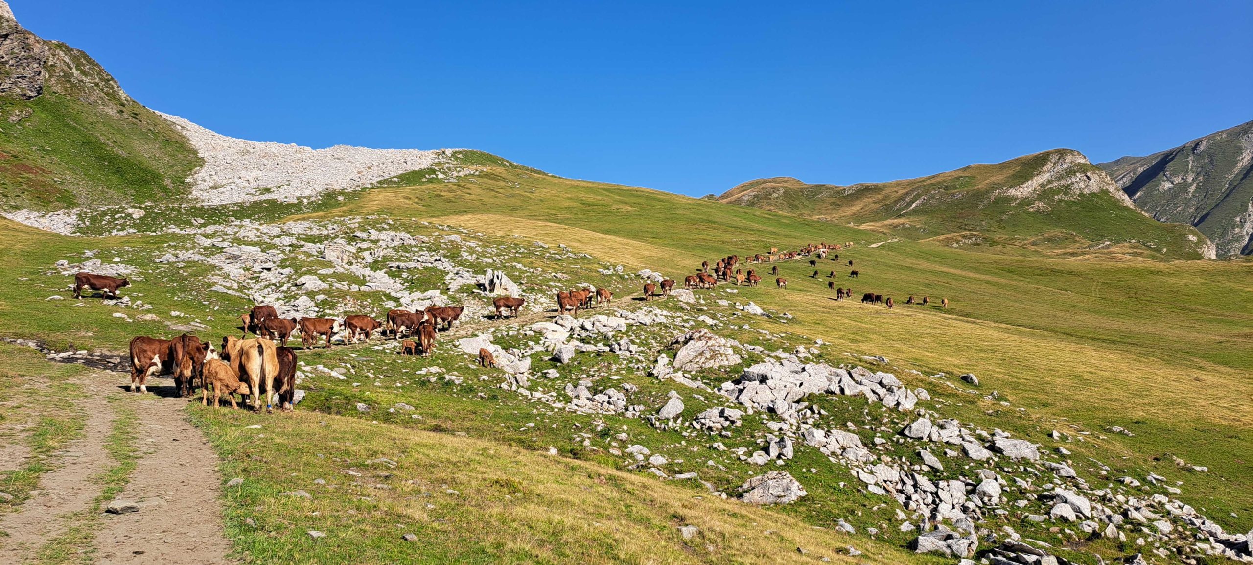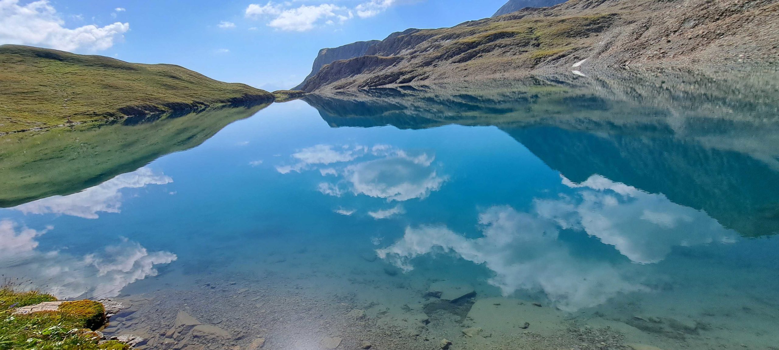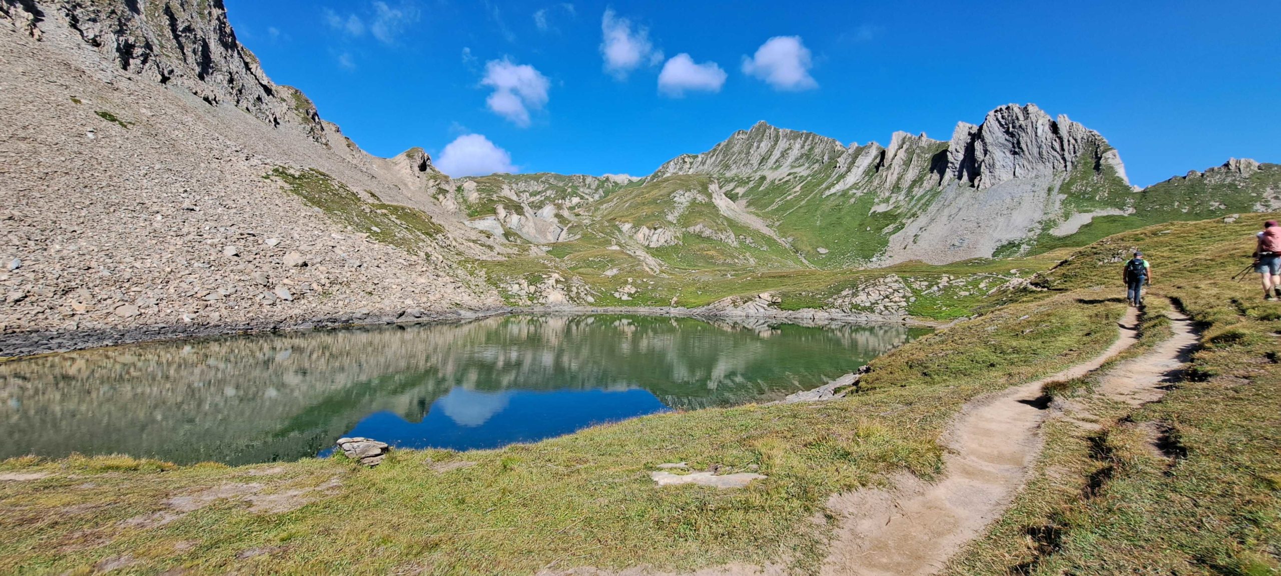 La pente est régulière mais soutenue. Le paysage est magnifique avec des sommets très mineraux autour de nous. Nous arrivons aux 5 lacs, l’Esola, le Riondet, le Cornu, le Verdet et le dernier, le lac Noir. Tous se suivent et rivalisent en beauté avec les reflets de nuages et montagnes dans des eaux turquoises. Après le passage du col de la Forclaz, où la vue est sublime, derniers efforts pour arriver sous le col de la Nova où nous décidons de faire notre halte gastronomique. Nous restons un peu circonspect devant le risque que prennent quelques randonneurs à cheminer sur des crêtes abruptes au dessus de nous, bon pas envie de les imiter. Nous sommes à 2650 mètres et le soleil tape dur, point d’ombre pour se protéger.