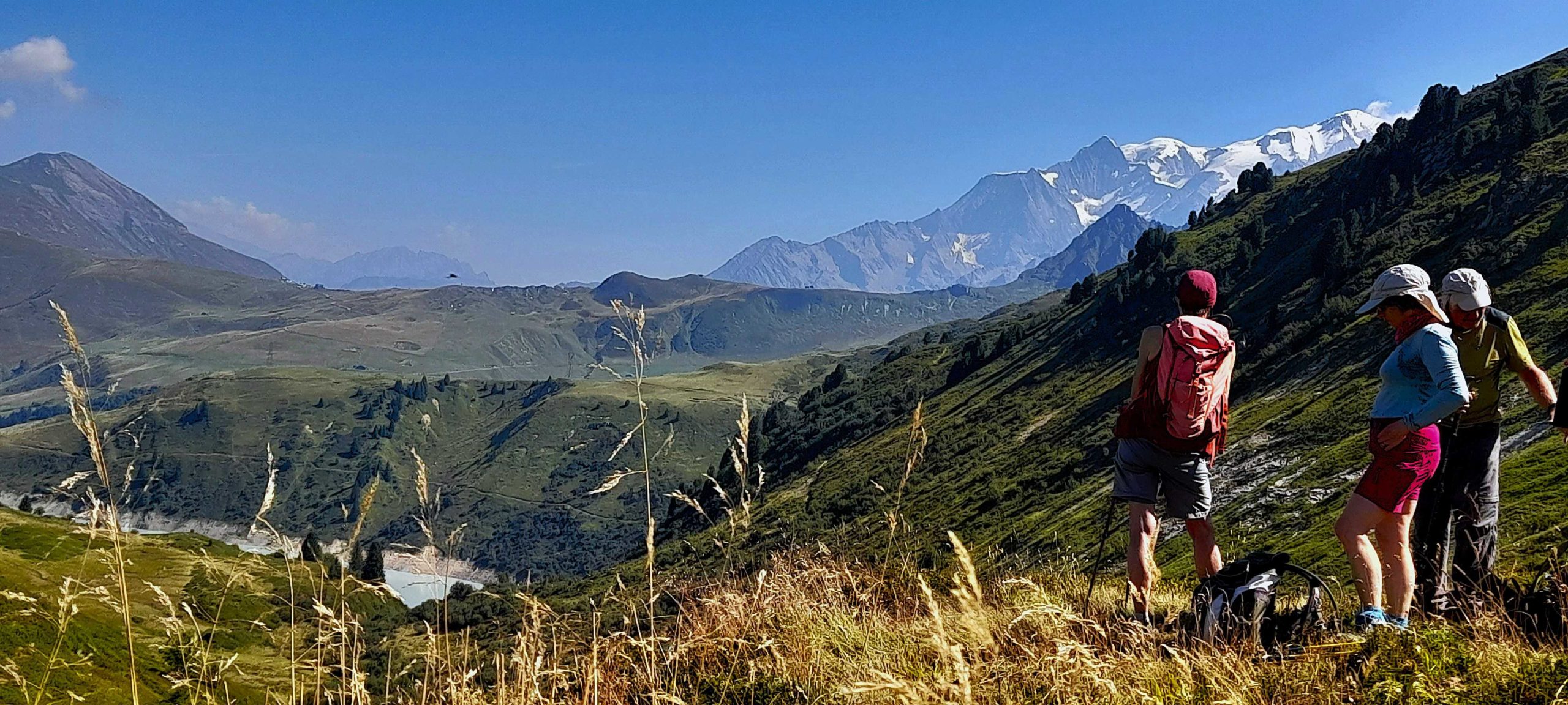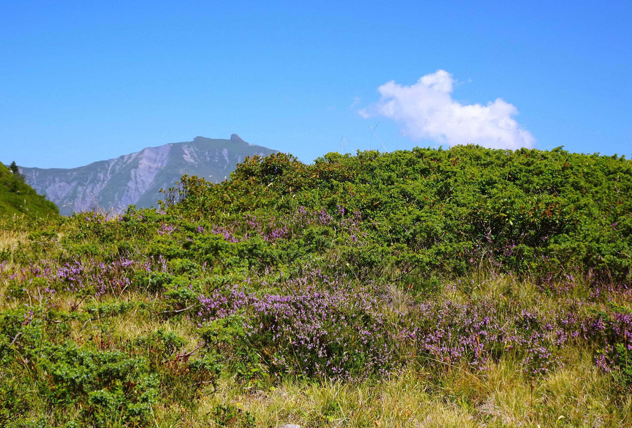 A partir de là, c’est une vue ouverte sur le Mt Blanc et le sentier s’adoucit sur une prairie colorée par les bruyères, en ce moment. Direction Plans de la Mouille Nord & Sud (1954m) et se poser devant cette belle fenêtre qui s’ouvre à nous.