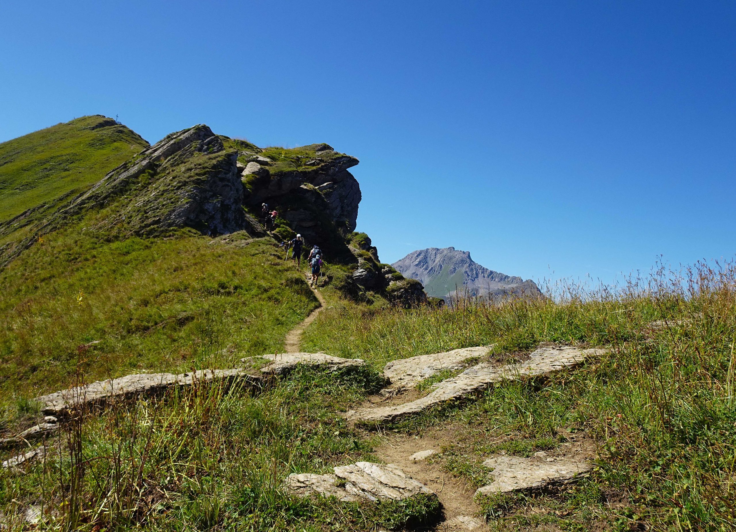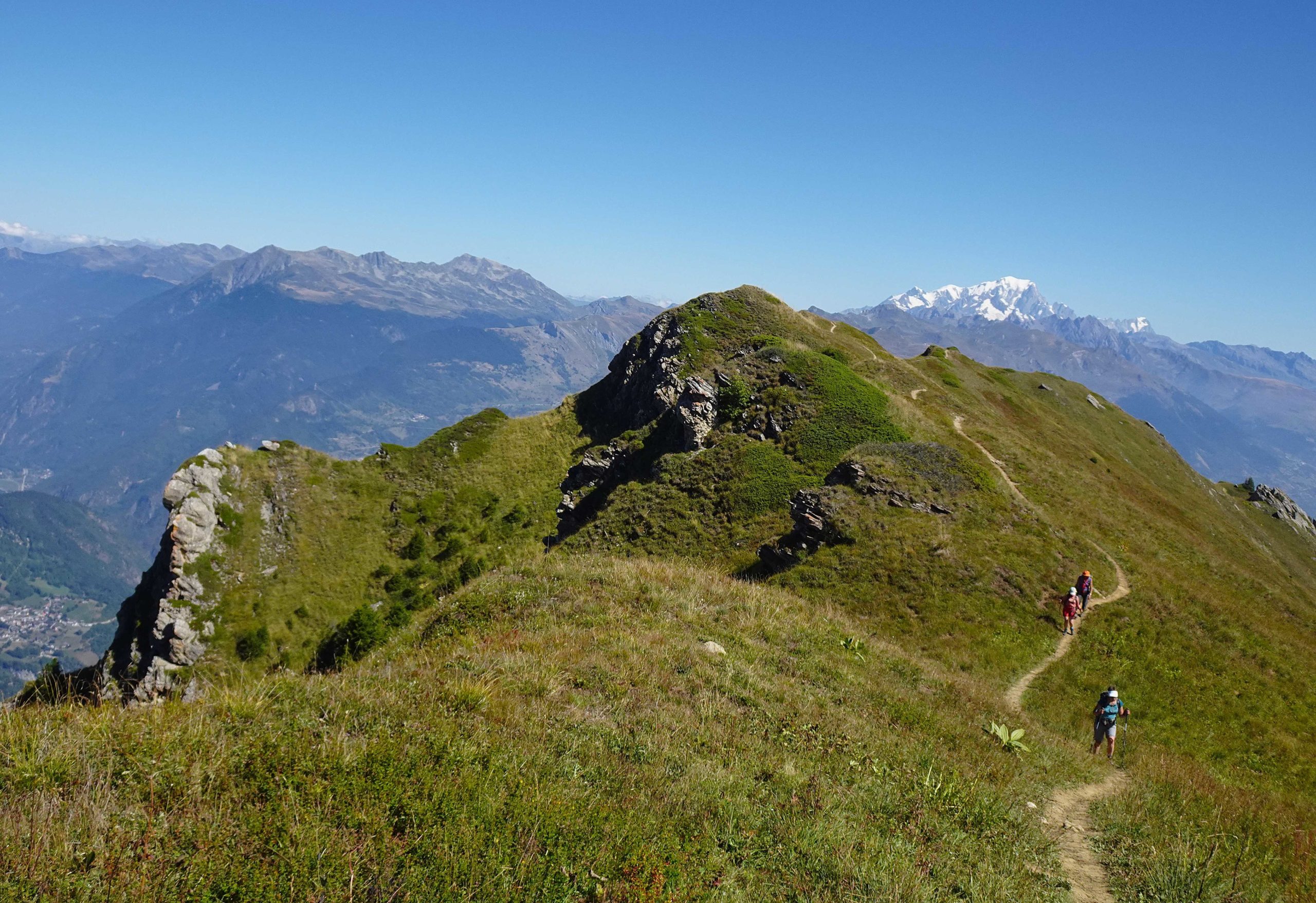 La montée est progressive et régulière et le dernier passage en crête nous fait découvrir un superbe panorama, avec le Mont Blanc qui nous accompagne tout le long.