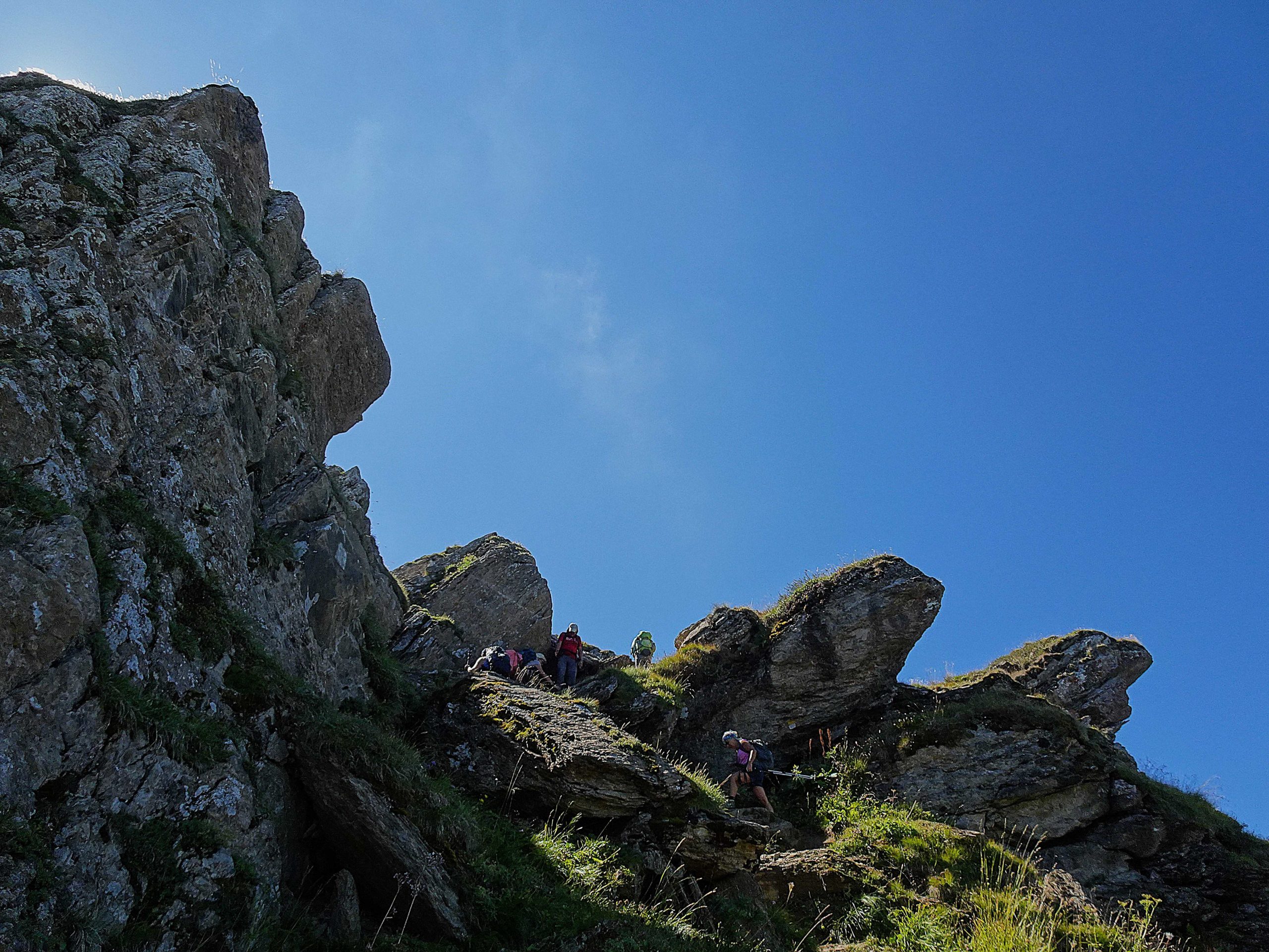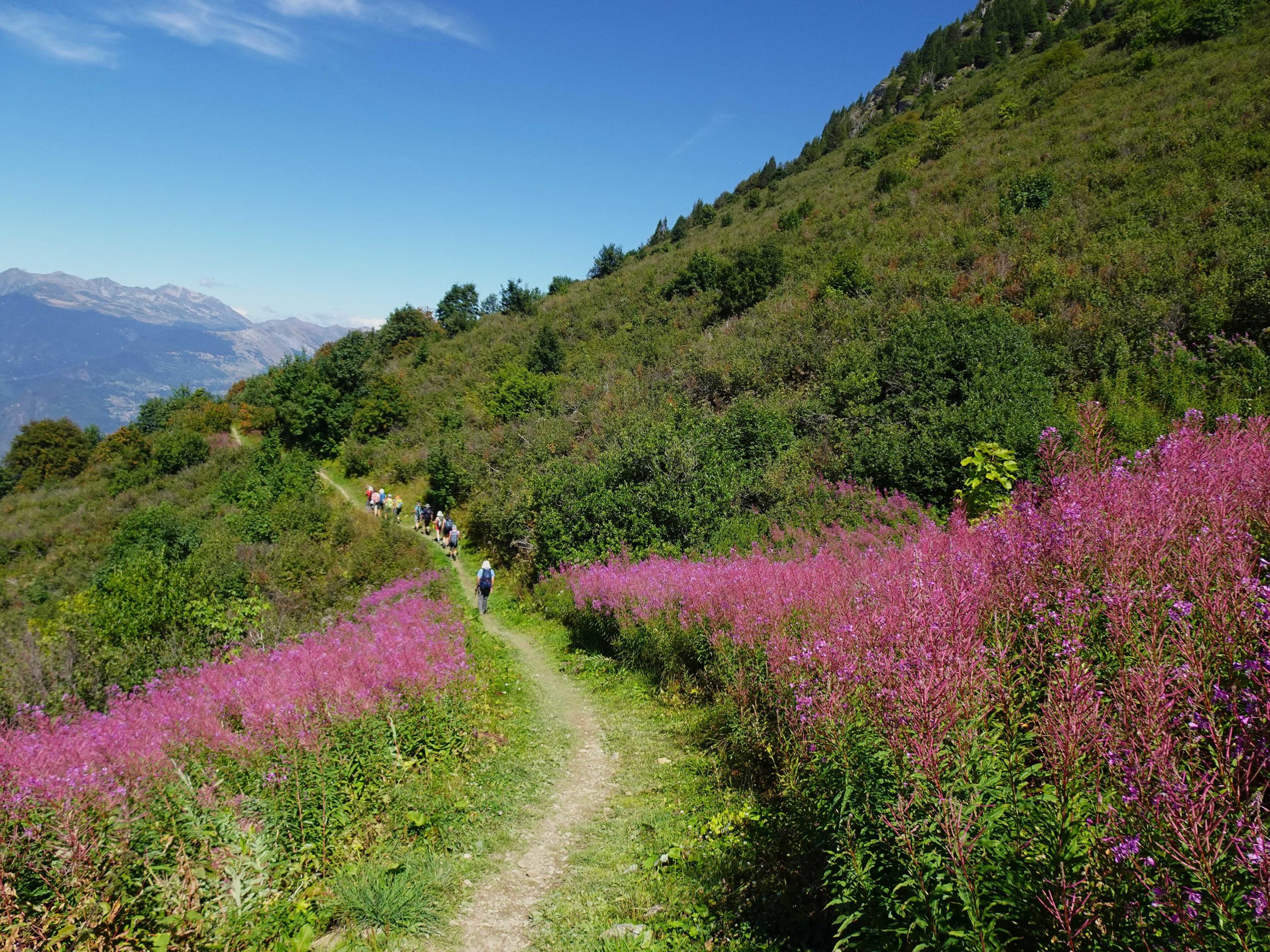 La descente est un peu plus raide, avec des passages câblés sans difficulté. Le retour se fait par une piste en balcon avec une vue très dégagée…et des framboisiers que nous picorons tout le long.