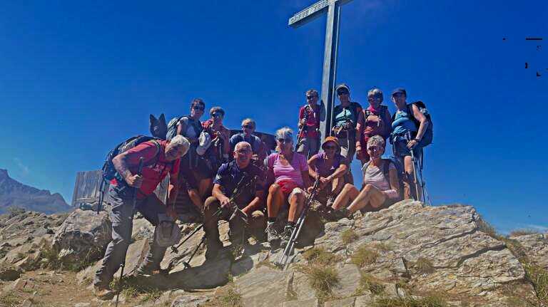 Belle croix au sommet, nous pique niquons à l’aise, en découvrant le Grand pic de la Lauzière à l’ouest, le Cheval noir, Valmorel à nos pieds, et à l’est, la vallée des Belleville qui remonte jusqu’aux Ménuires et Val Thorens dans la brume.
