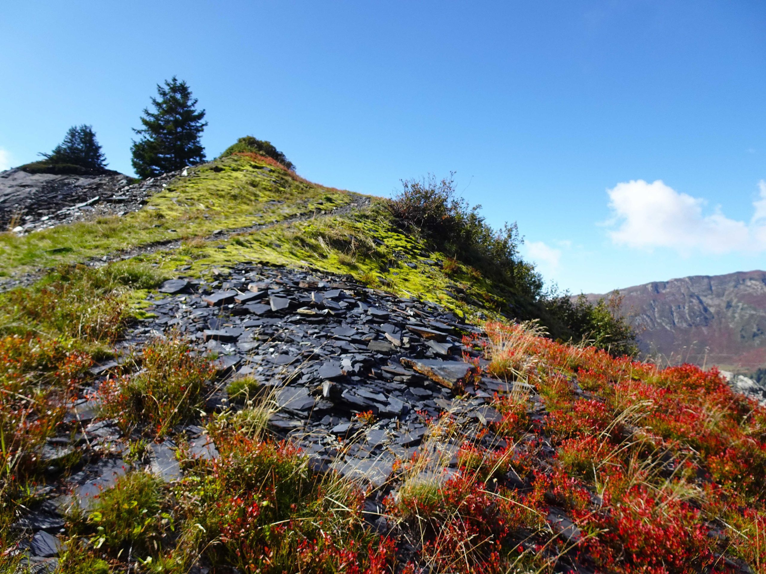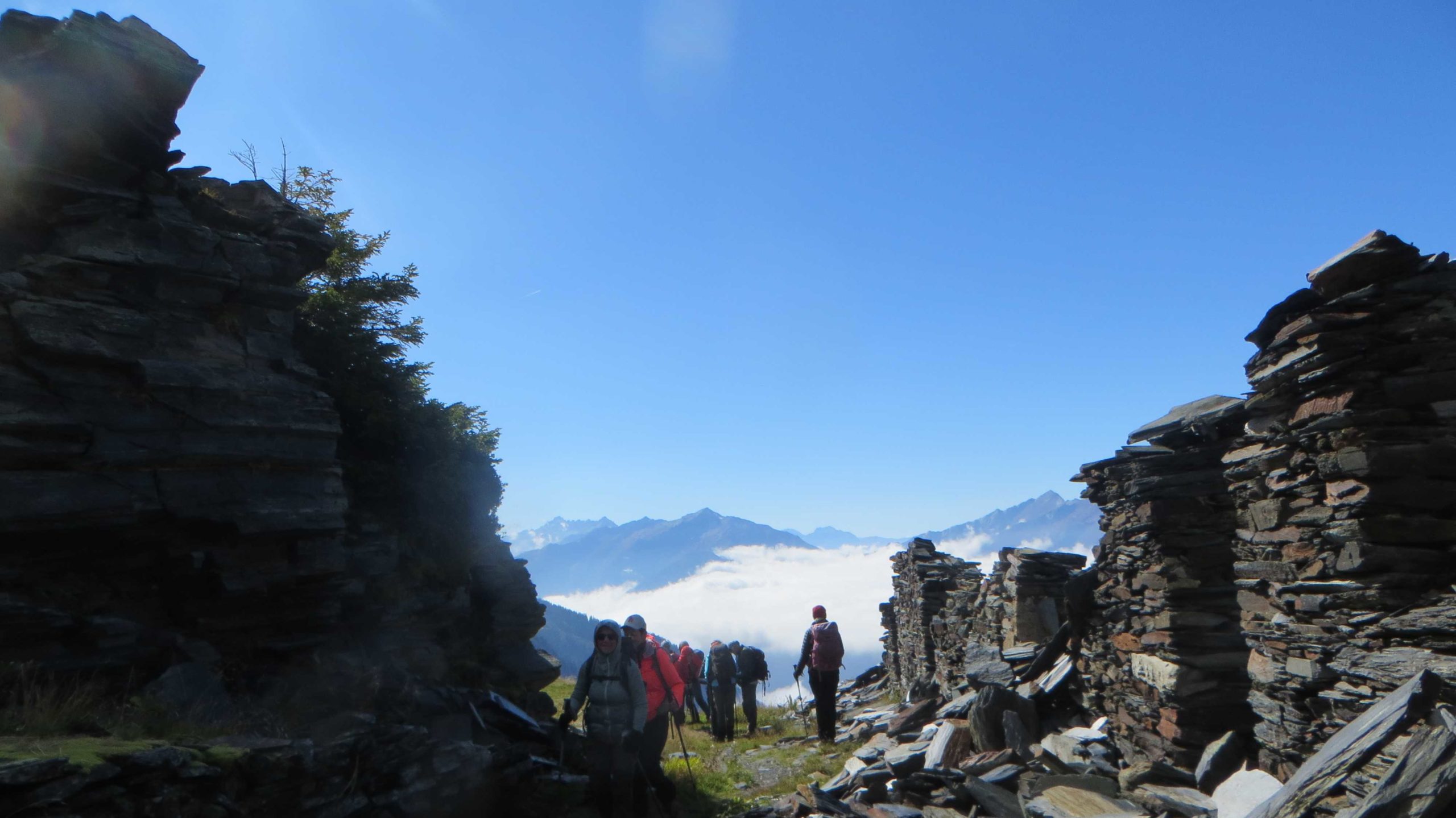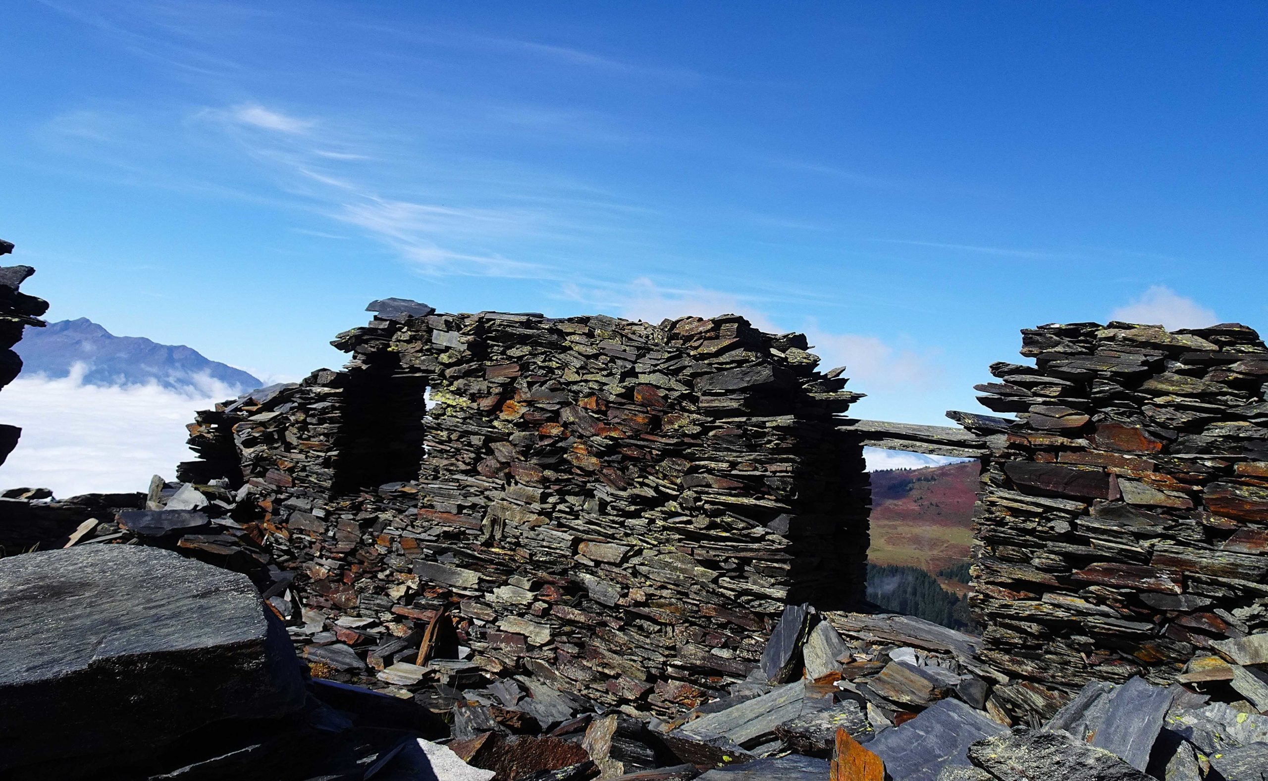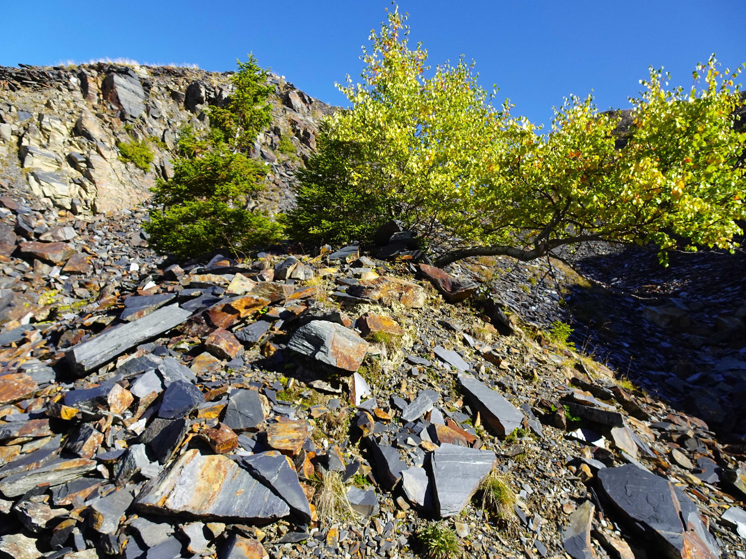 Après cette pause, direction à flanc de côteau vers les ardoisières de la Bâthie (1990m) – très modestes comparativement à celles de Cevins, malgré un temps prospère. Au sol, de belles plaques d’ardoise en témoignent.