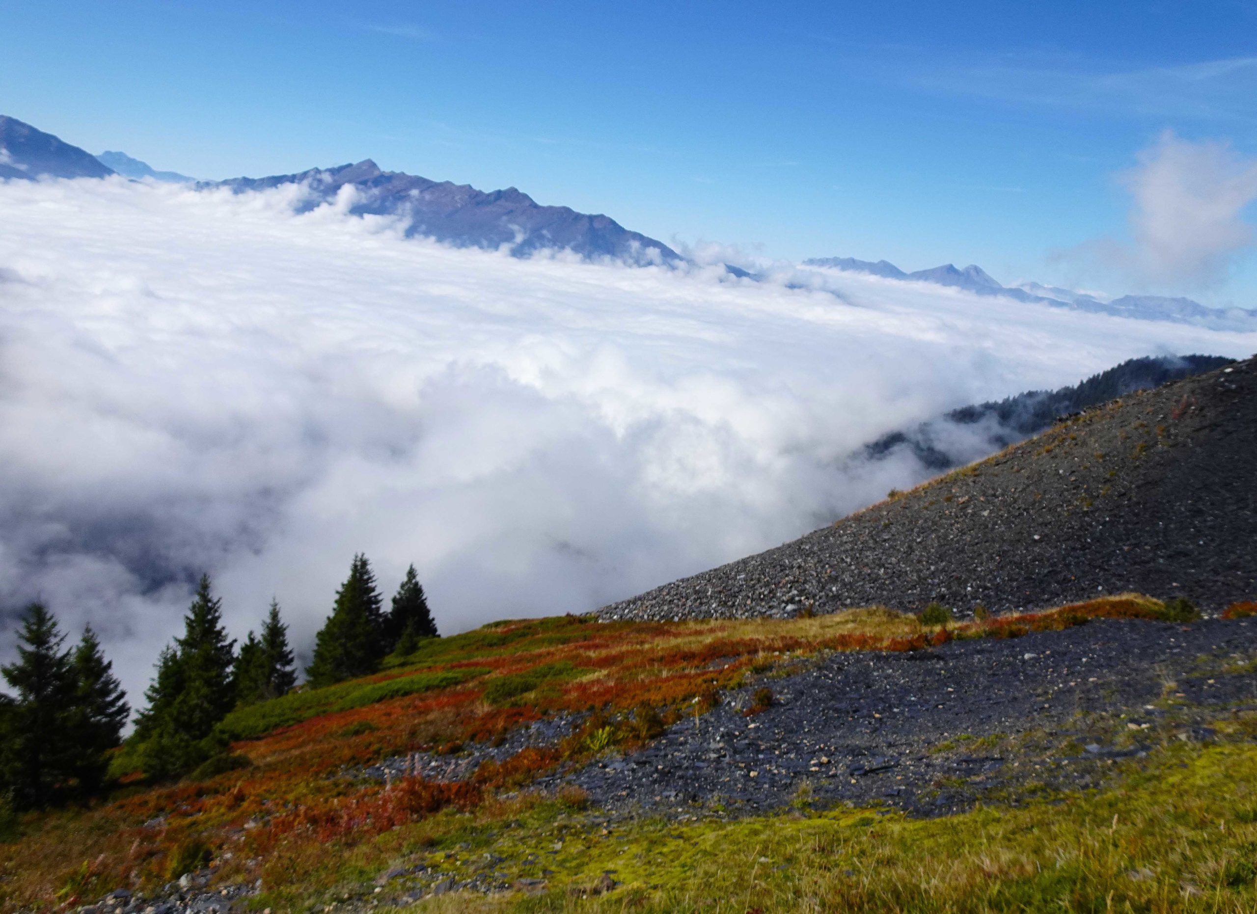 Le salon de jardin, fait d’ardoises, nous invite à déjeuner sur place ! Très belle vue sur les sommets flottant au-dessus d’une écharpe de brume. Le contraste est saisissant, le bleu du ciel, le sol noir, herbes vertes ou myrtilliers rougeoyants !