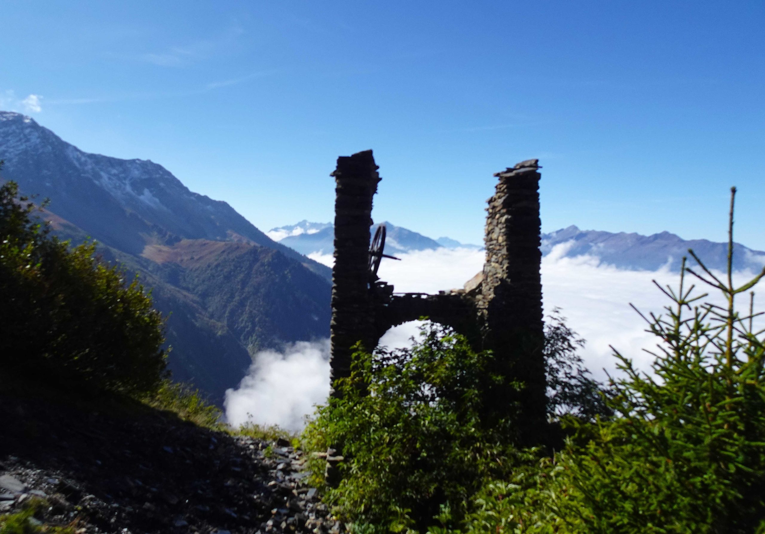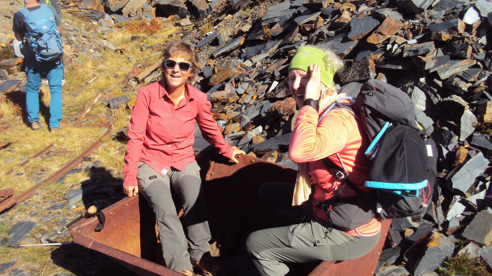 Après 2 Heures de marche nous atteignons la Têtes des Chappes, sentier qui mène aux ardoisières de Cevins. (1965m) De jolis fragments schisteux noirs contrastant avec les herbes sèches annoncent l’arrivée proche de l’ancienne exploitation avec ses vestiges laissés sur place…rails, vagonnet où les filles se feront un plaisir de grimper dedans ! Un treuil, permettant l’acheminement des blocs est encore sur place, sans oublier les bâtiments qui subsistent – où logeaient les mineurs. De beaux restes, une jolie palette de couleurs qui nous font mesurer leur qualité. Elles auraient couvert le palais du Louvre ! Exploitation ayant débuté au XVIe siècle, pour s’achever en 1950 – devant les difficultés d’extraction.