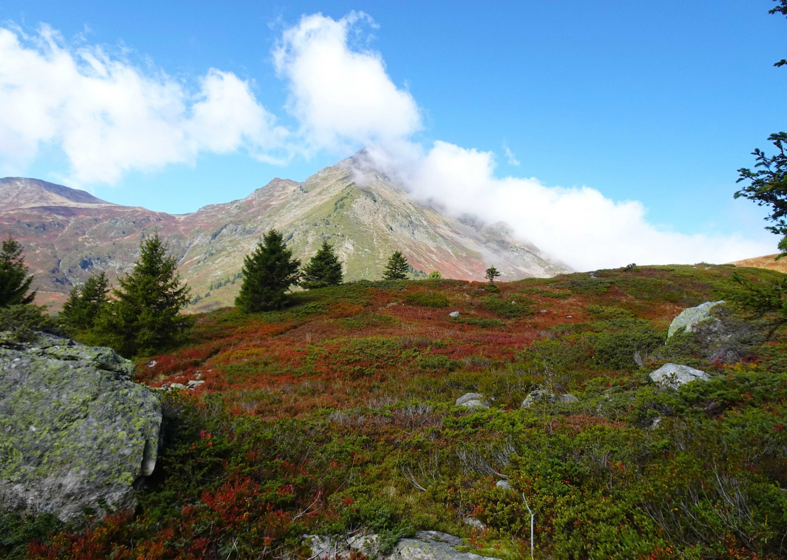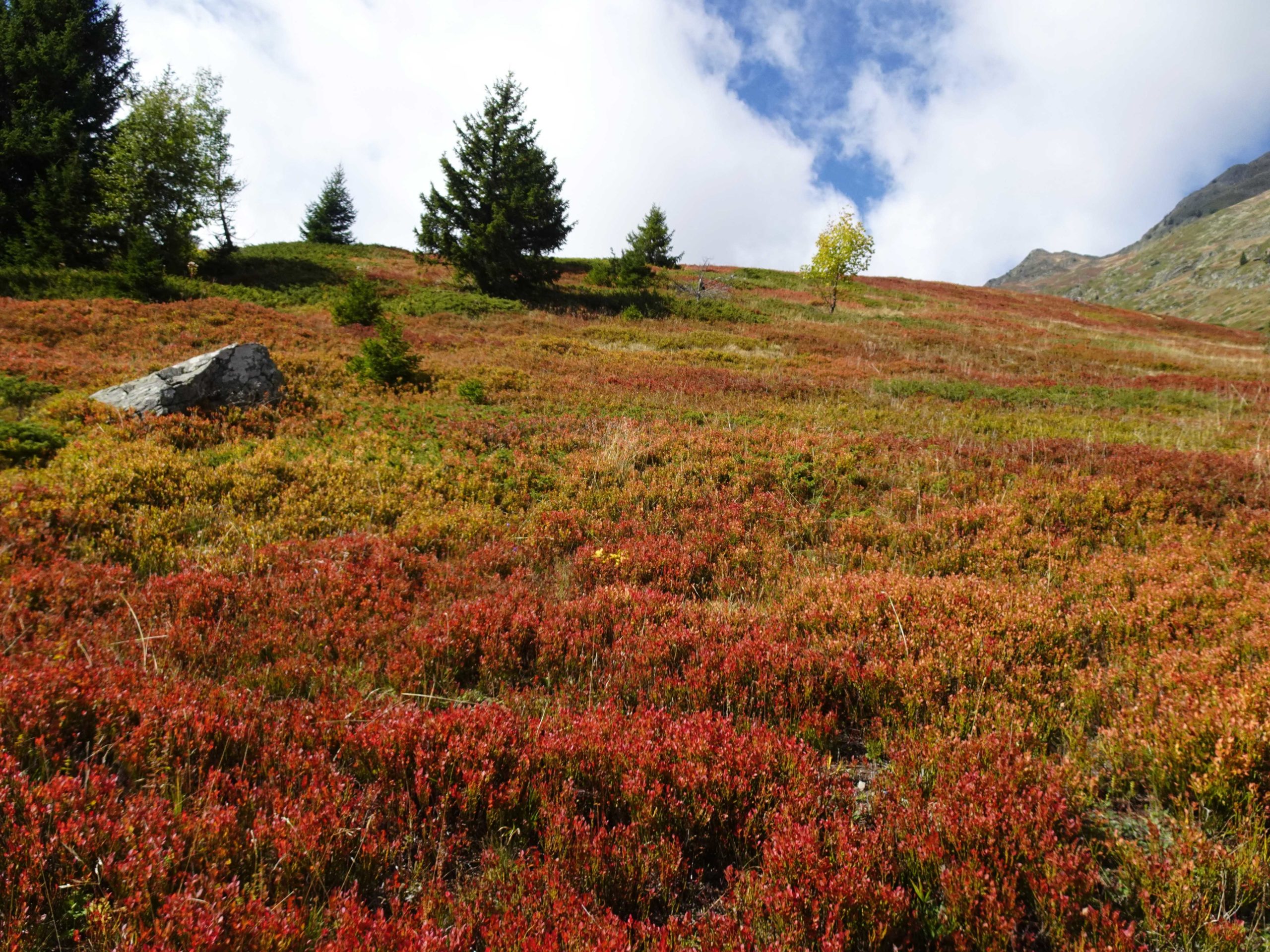 Nous nous dirigeons vers le Col & Croix de la Bâthie (1839m), traversant les myrtilliers, encore remplis de baies tardives que nous tentons de grapiller en avançant.