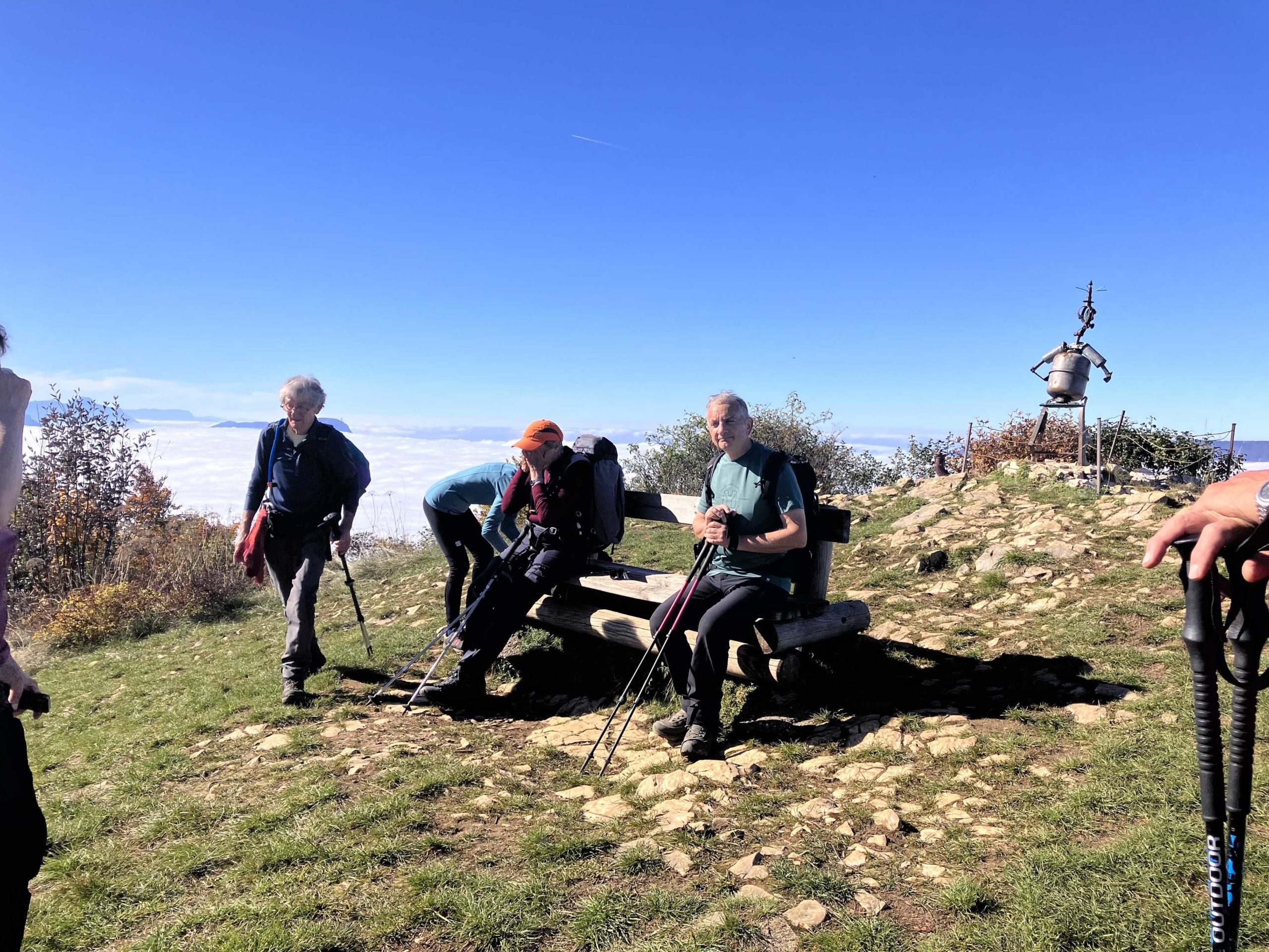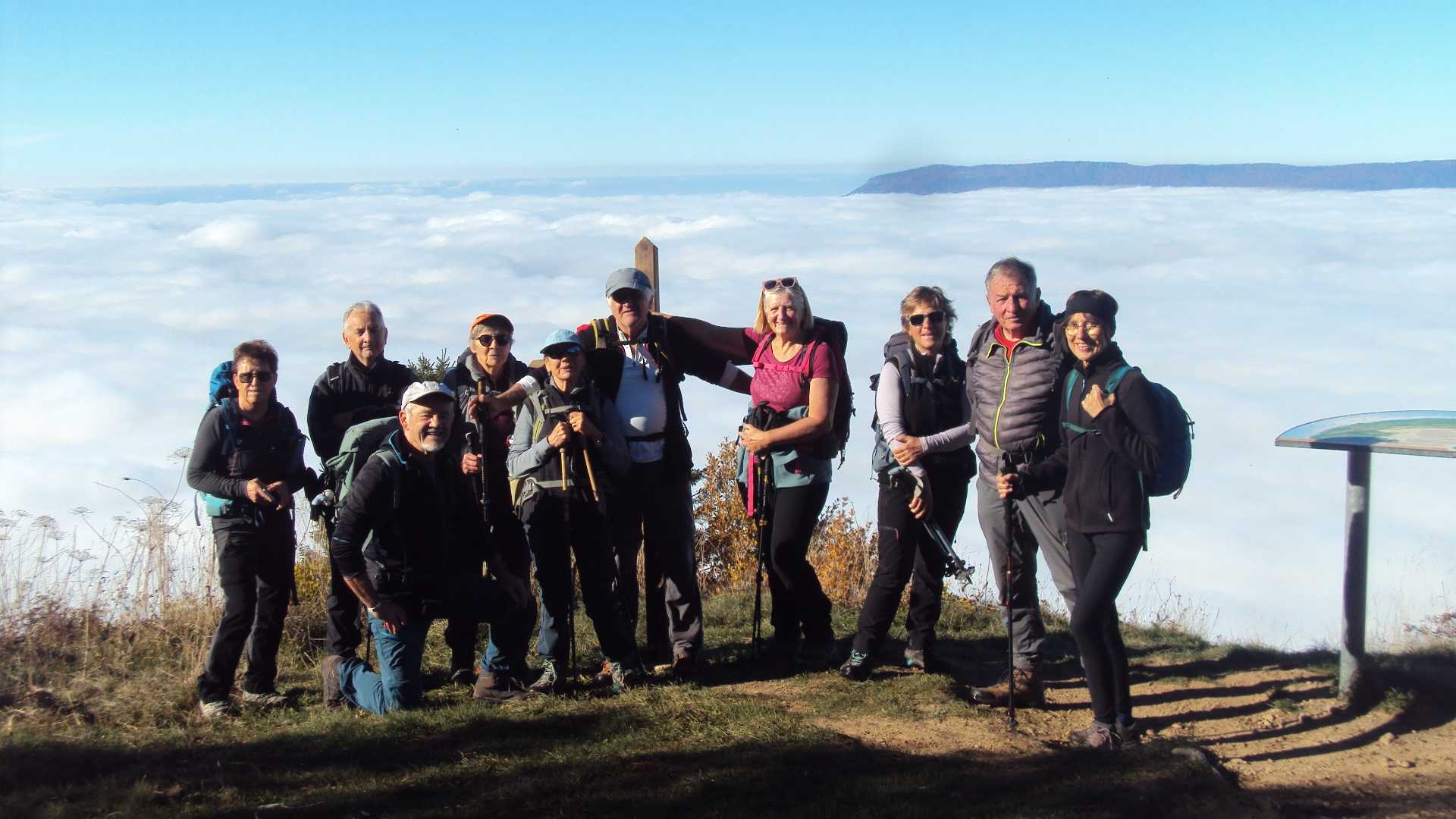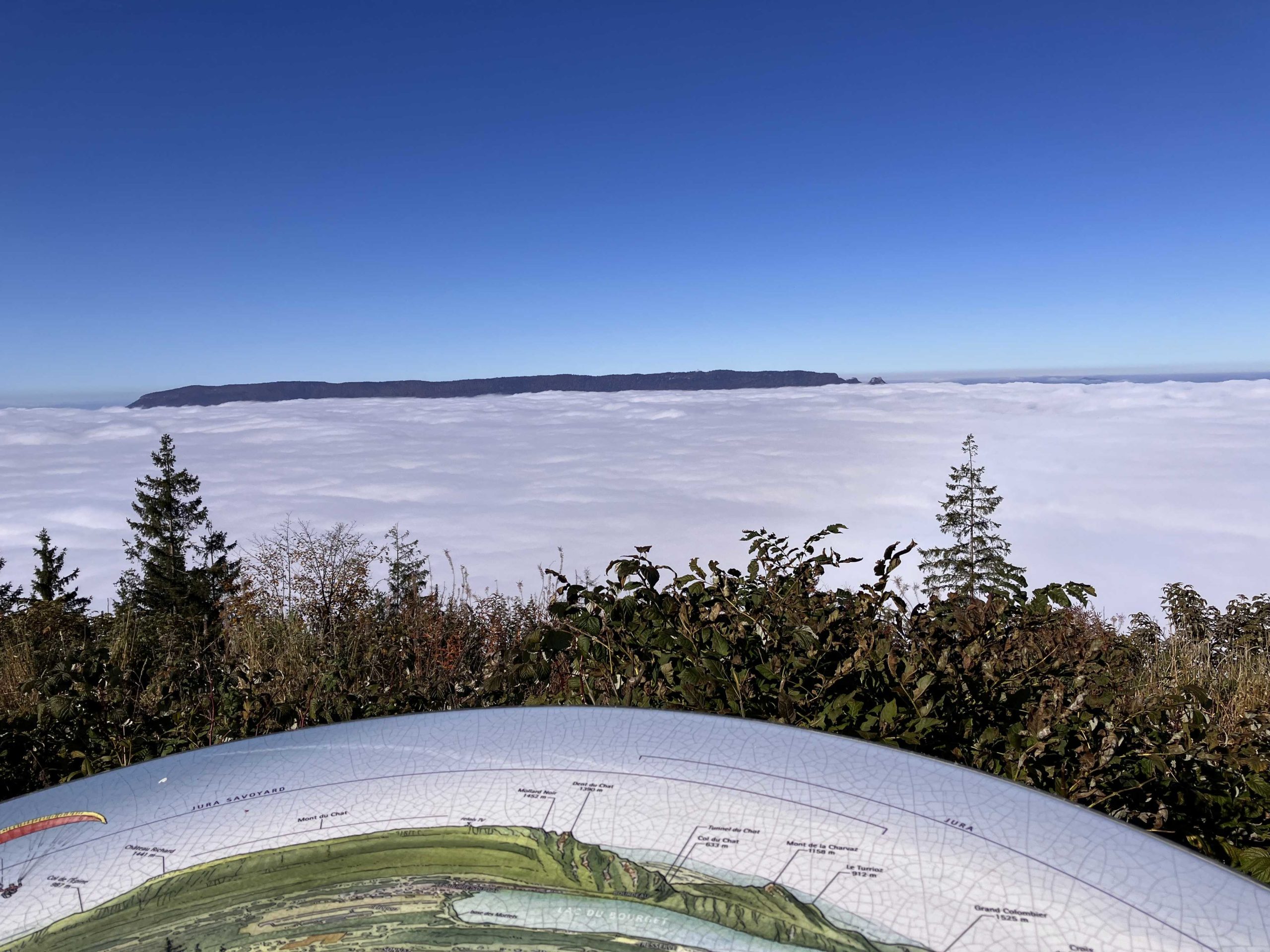 Arrivés au belvédère d’Orionde à environ 1550 m, l’équipe se précipite vers la table d’orientation pour admirer le paysage. D’après la carte une vue imprenable sur le lac du Bourget.