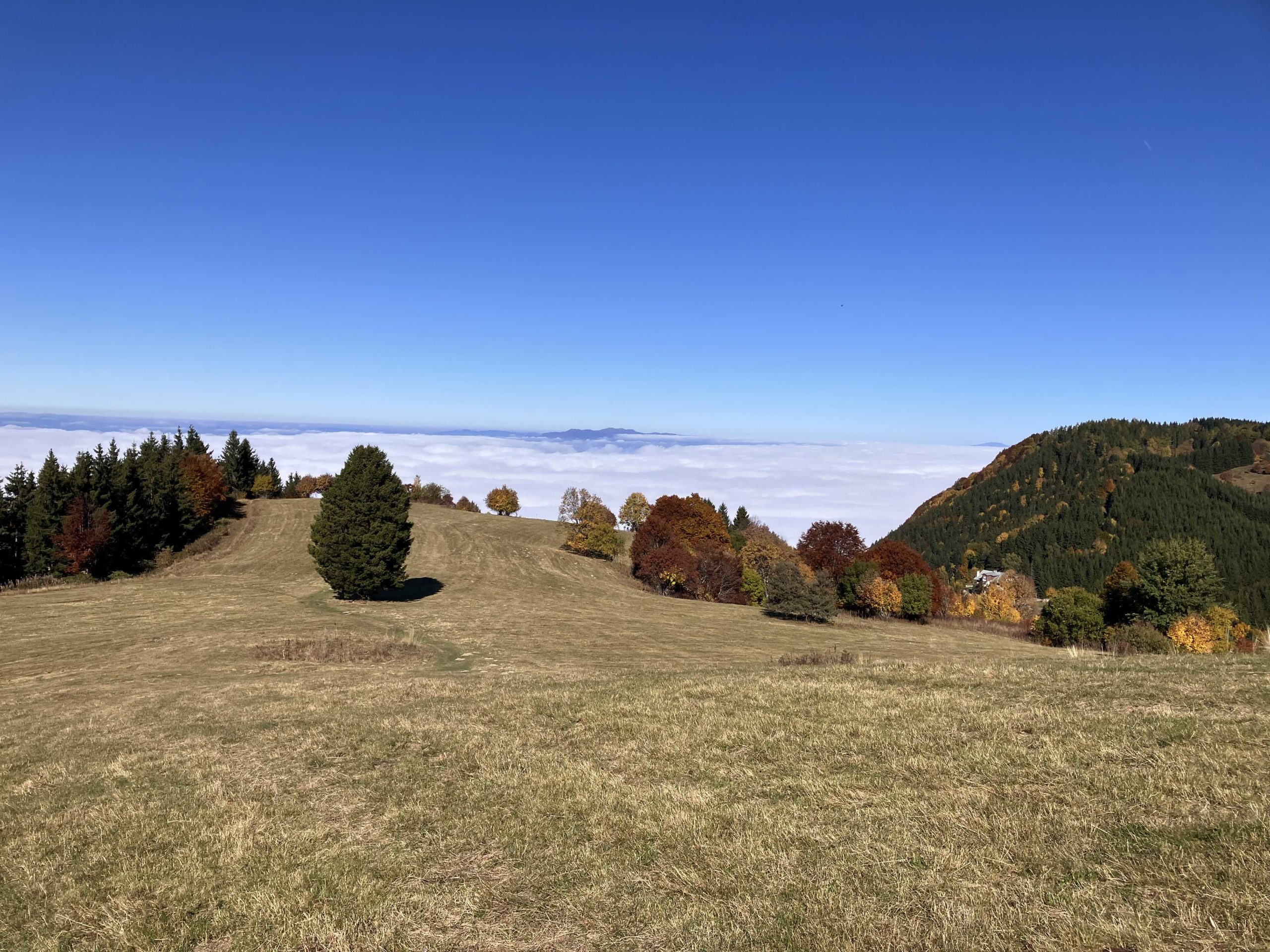 Hélas, c’est une immense mer de nuage qui recouvre l’ensemble du paysage. Un peu déçu, mais toujours motivés, nous progressons vers le col de Sire situé à 1400 m.