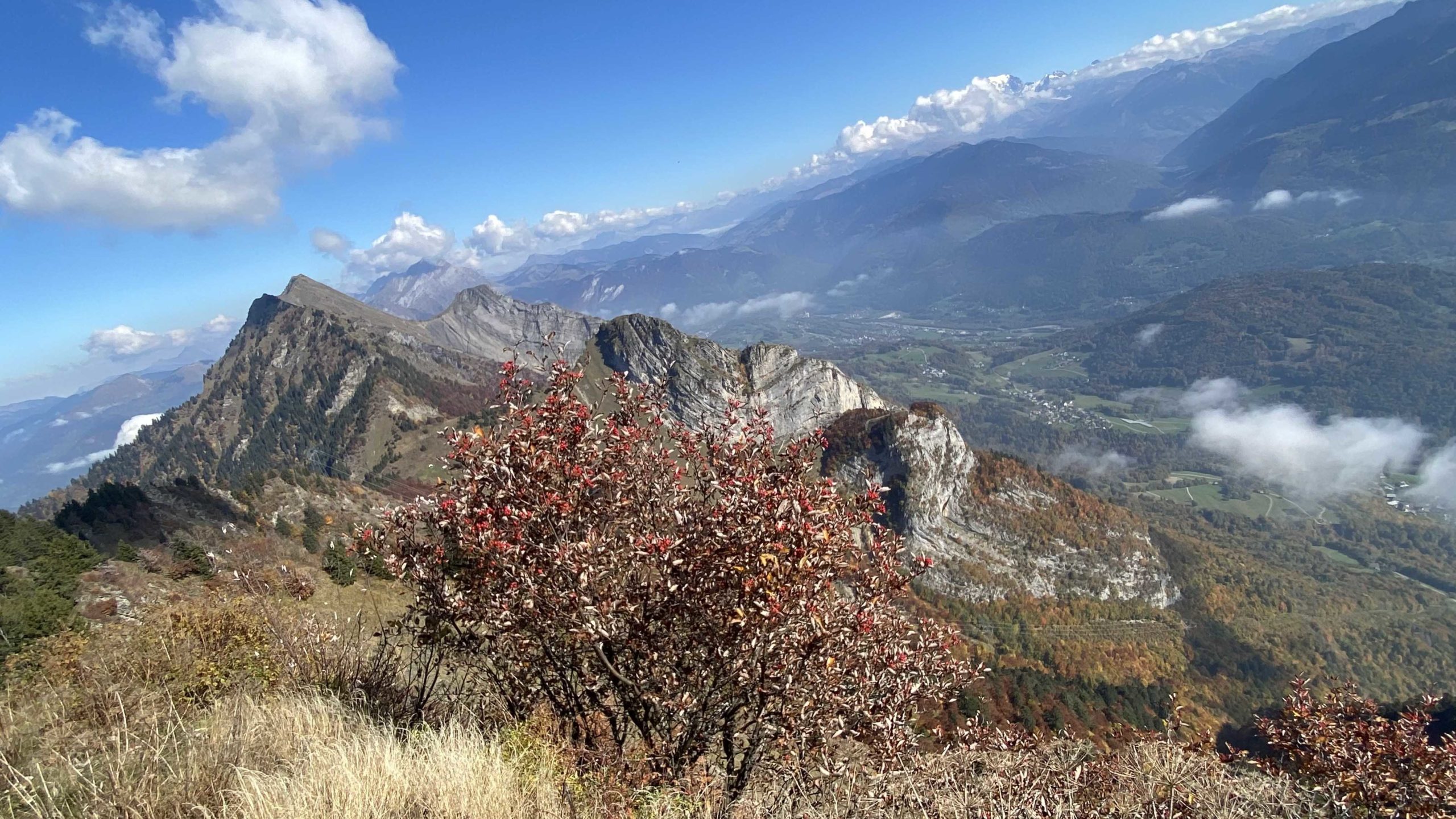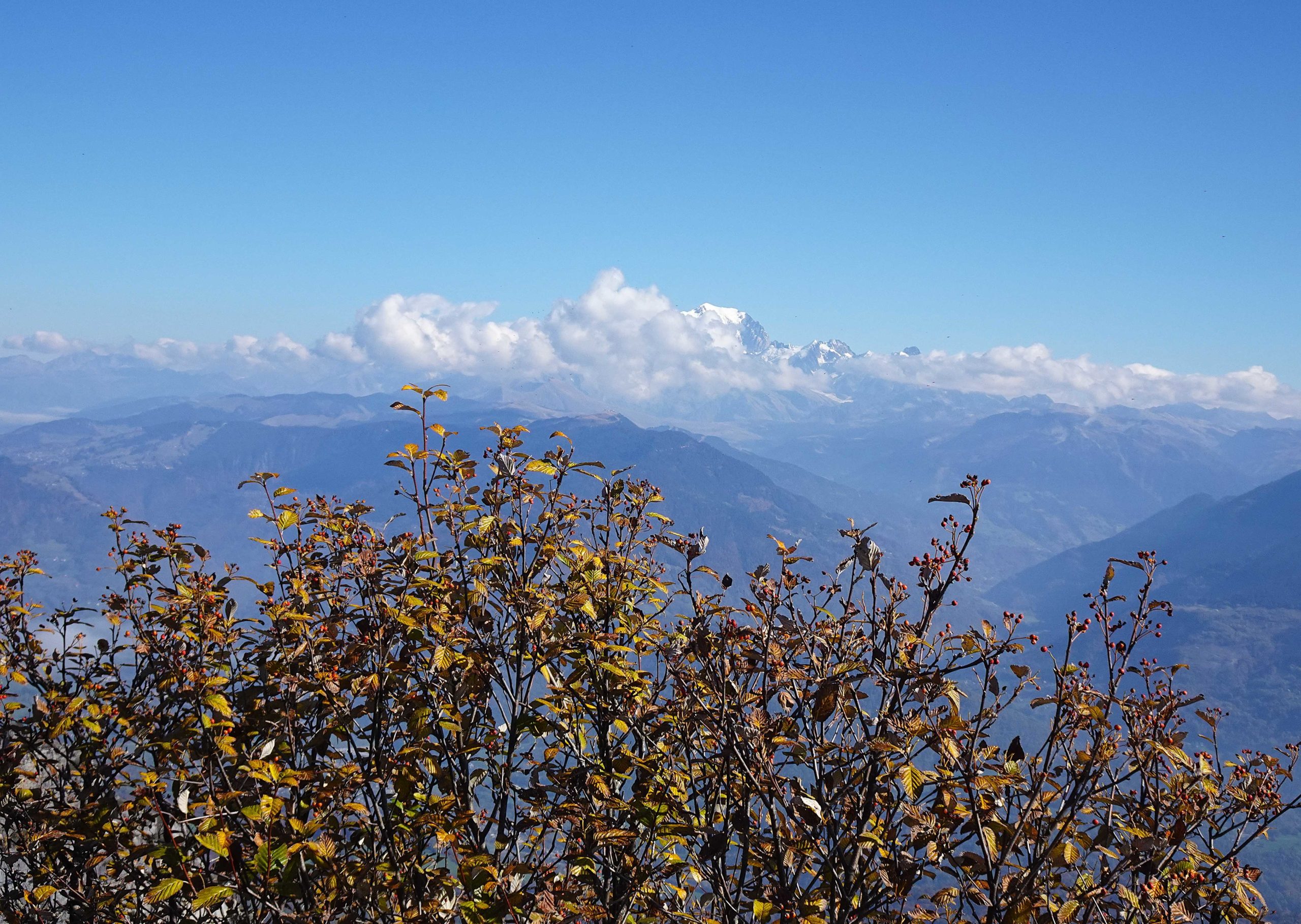 Nous reconnaissons La Combe de Savoie, les Bauges, le Beaufortain, Belledonne, Annecy et son lac sont sous les nuages, au loin nous devinons La Chartreuse, le Granier, et le Mont Blanc réussit quelques instants à se découvrir !
