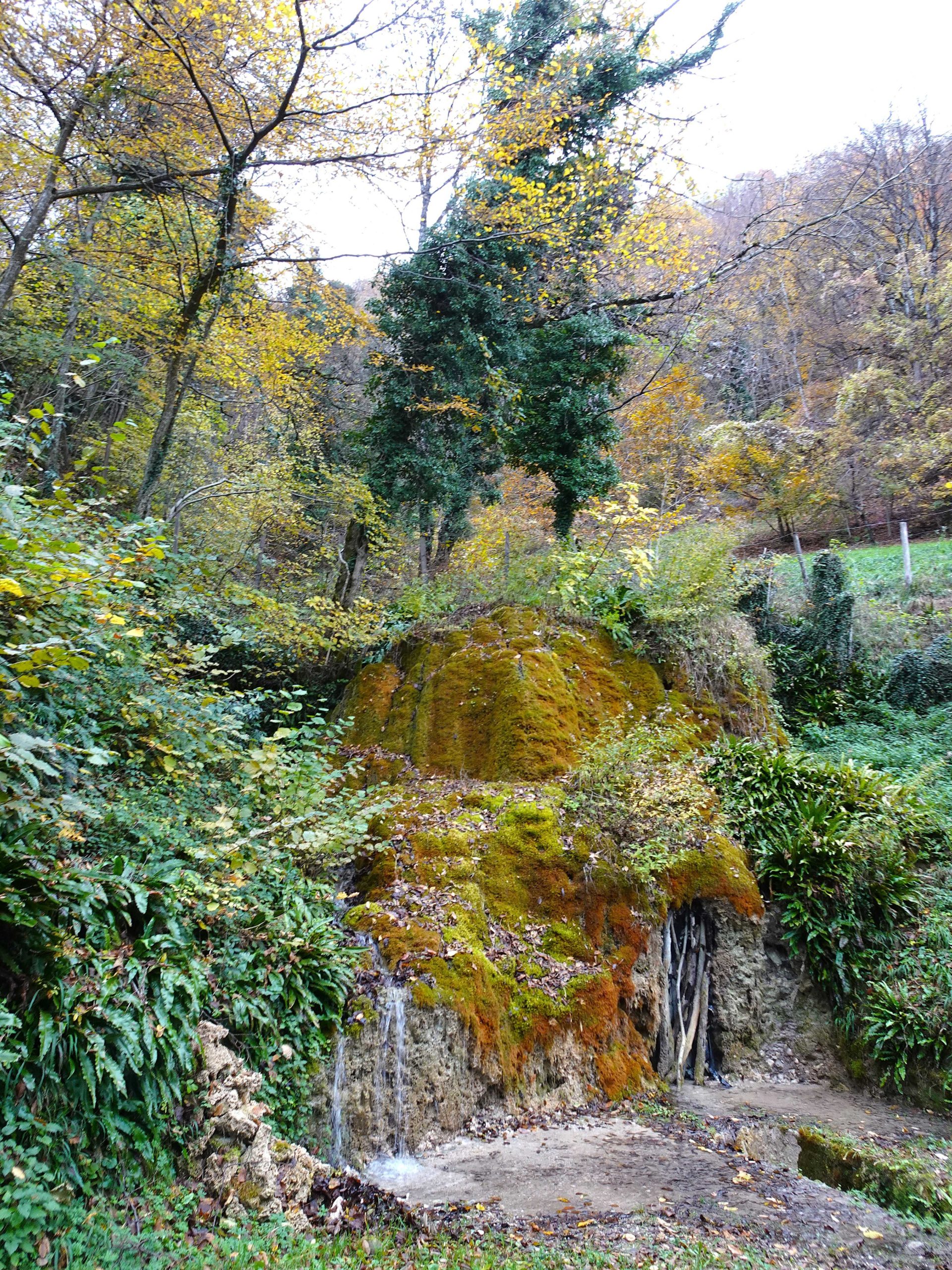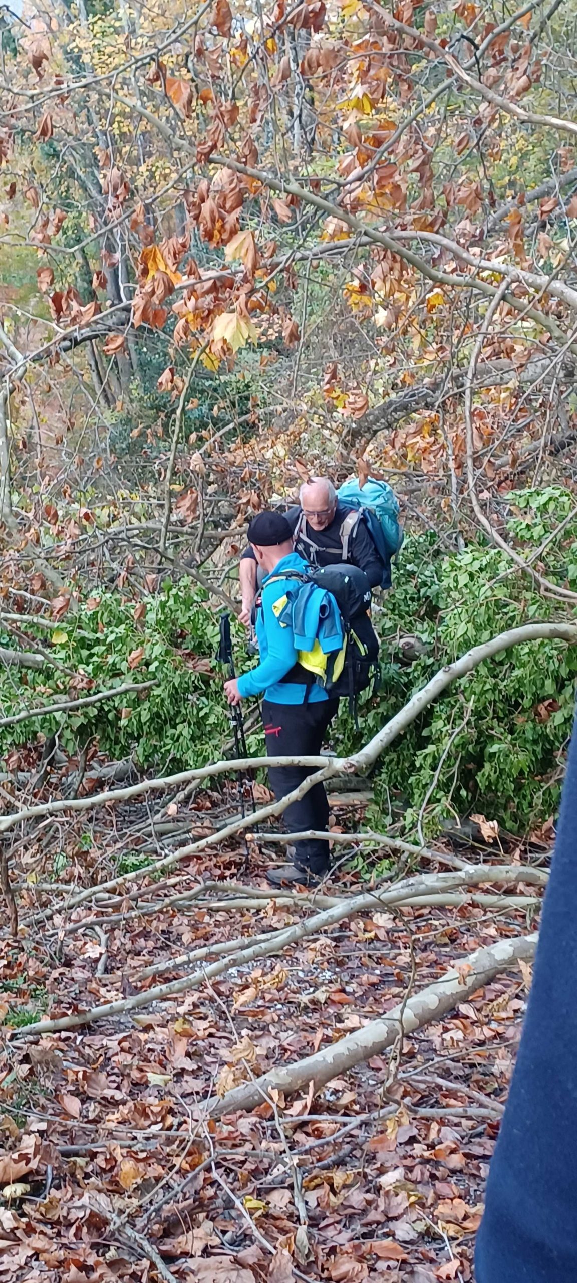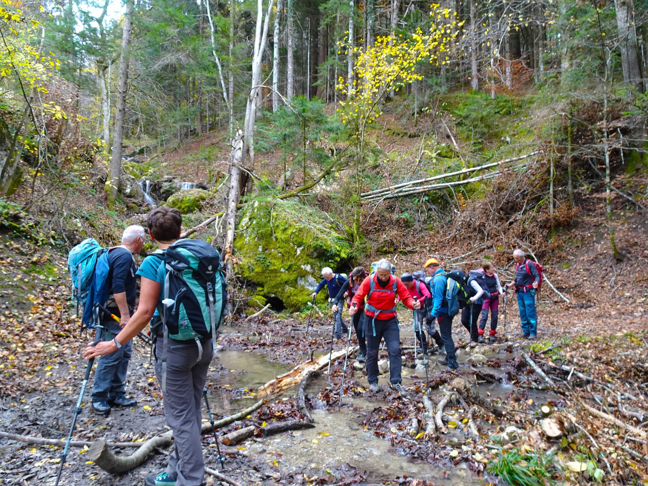 Une rude montée dans une belle forêt automnale , raidillon qui affûte les mollets et ouvre l’appétit – avant de redescendre vers la Grange du Pissou. Nous ne sommes plus très loin de notre objetctif – un petit promontoire – Attention, danger !