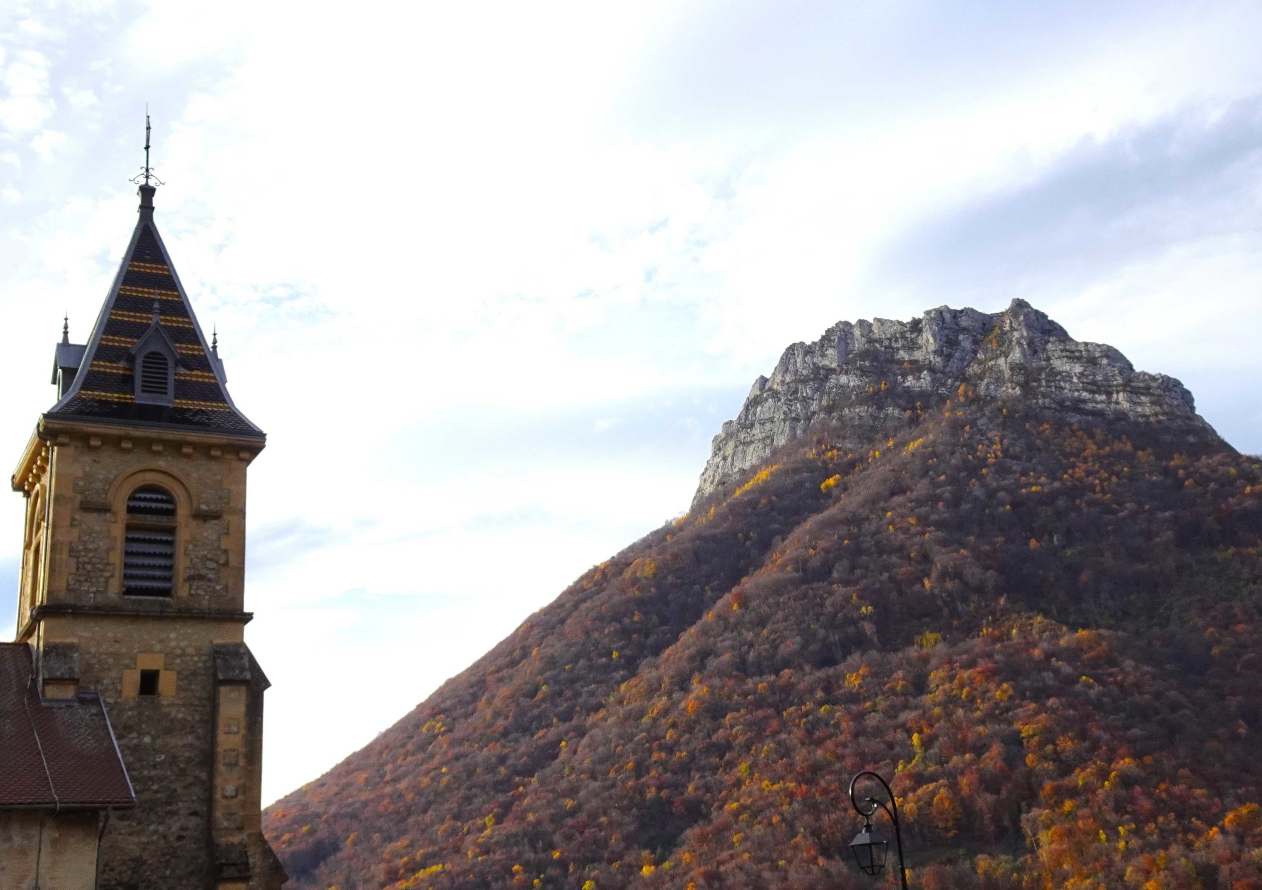 Départ de la jolie Eglise de Quaix, avec son toit vernissé, derrière, domine l’impressionnant Néron, c’est l’effet qu’il fait – bien que 1300m d’altitude . omniprésent ainsi que l’Aiguille de Quaix (1140m)