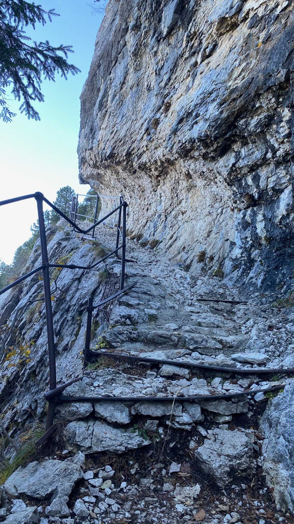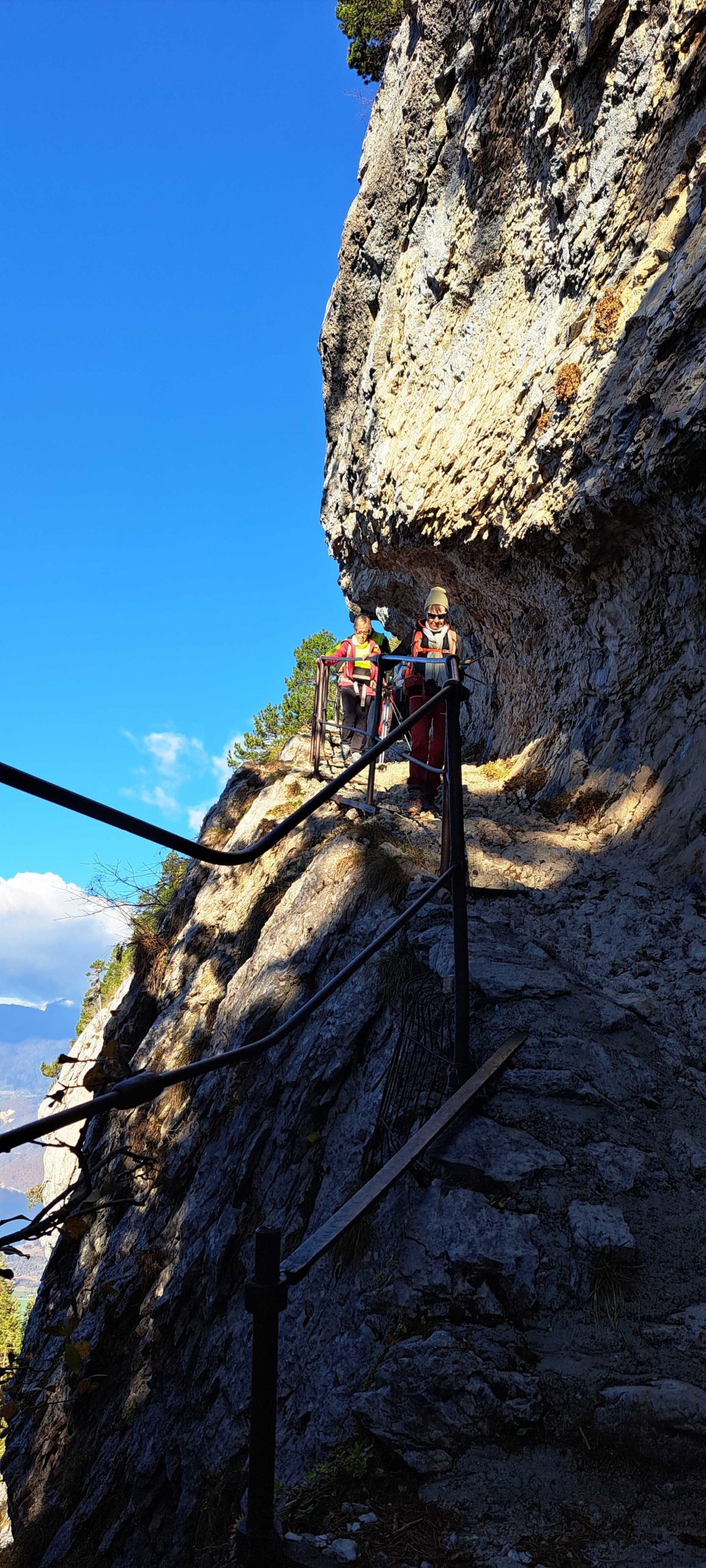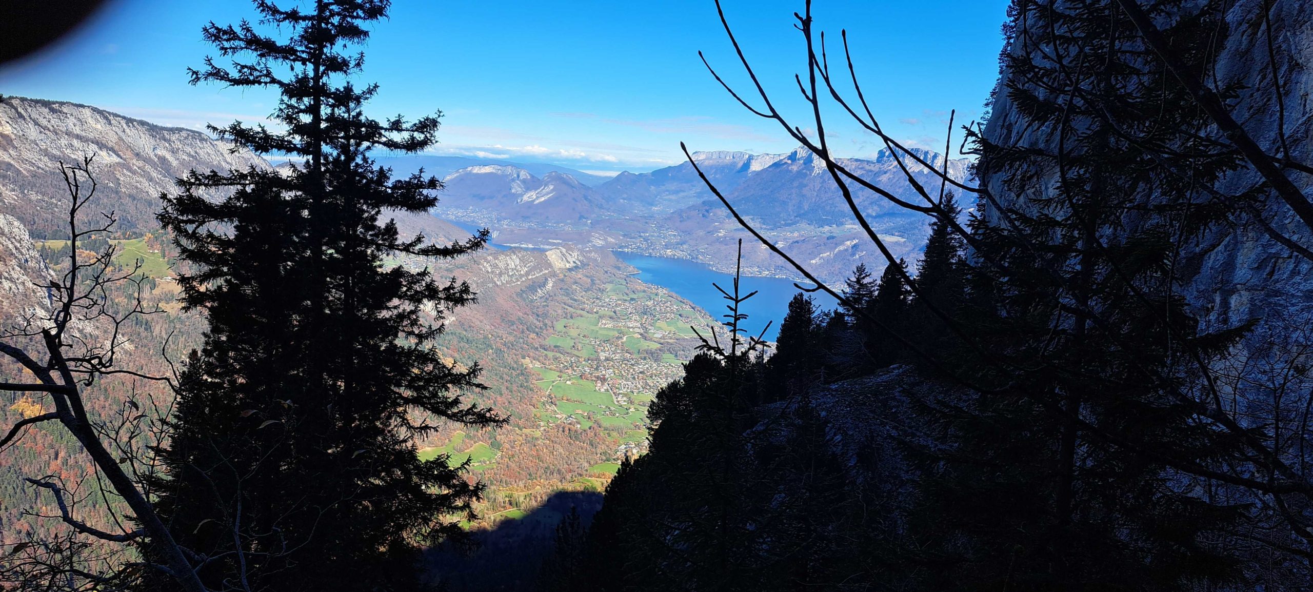 Puis nous quittons la large piste pour nous enfoncer dans une belle et longue forêt très vallonnée. Nous sommes maintenant au pied des falaises qu’il va falloir franchir. Une montée en lacets nous mène à un surprenant passage… Taillé dans la roche en 1893 et muni de barres de protection, cet impressionnant passage large de 1.50m permettait à l’époque l’accès à l’alpage de La Combe des hommes et du bétail. De nouvelles vues sur le lac, quelques hameaux environnants et le massif des Borgnes et des Bauges s’offrent à nous mais il ne faut pas s’attarder !