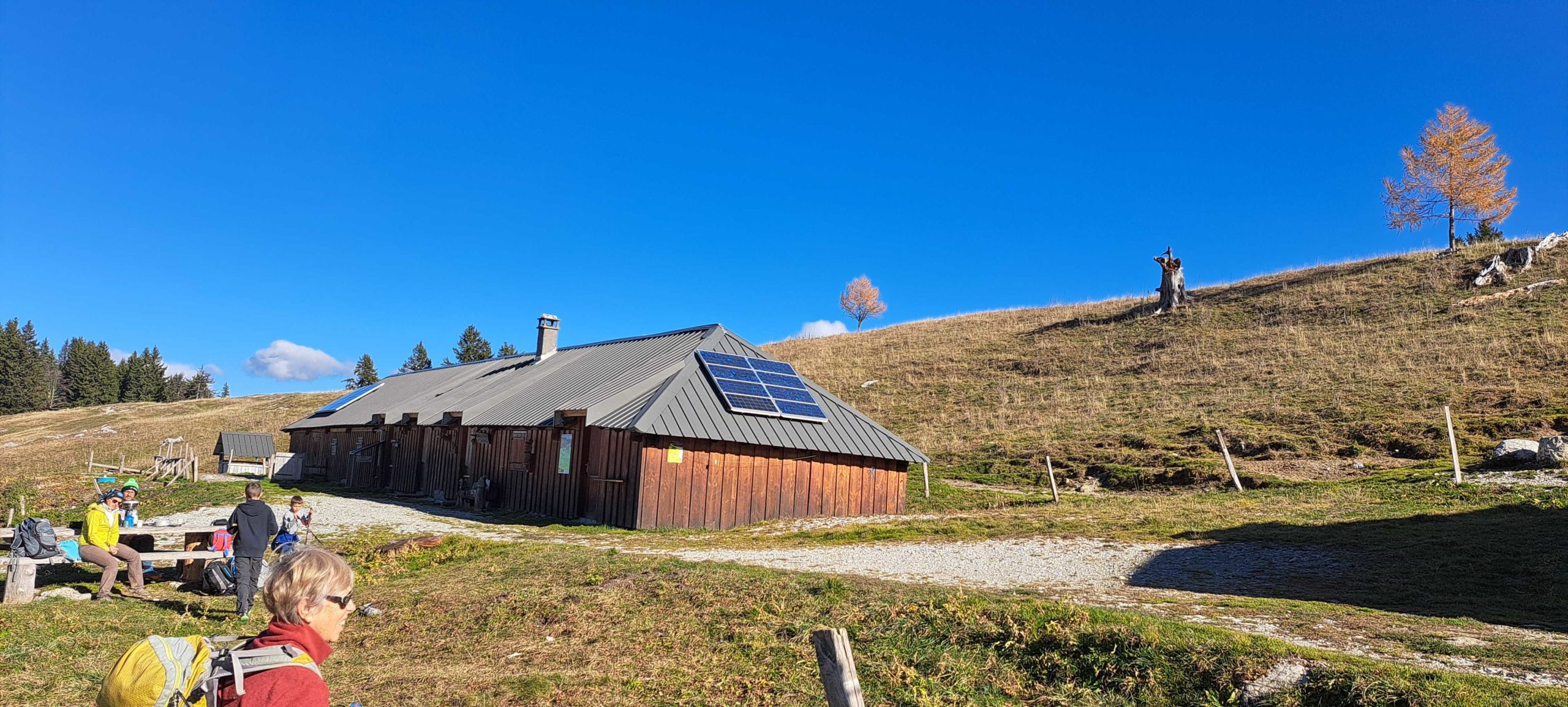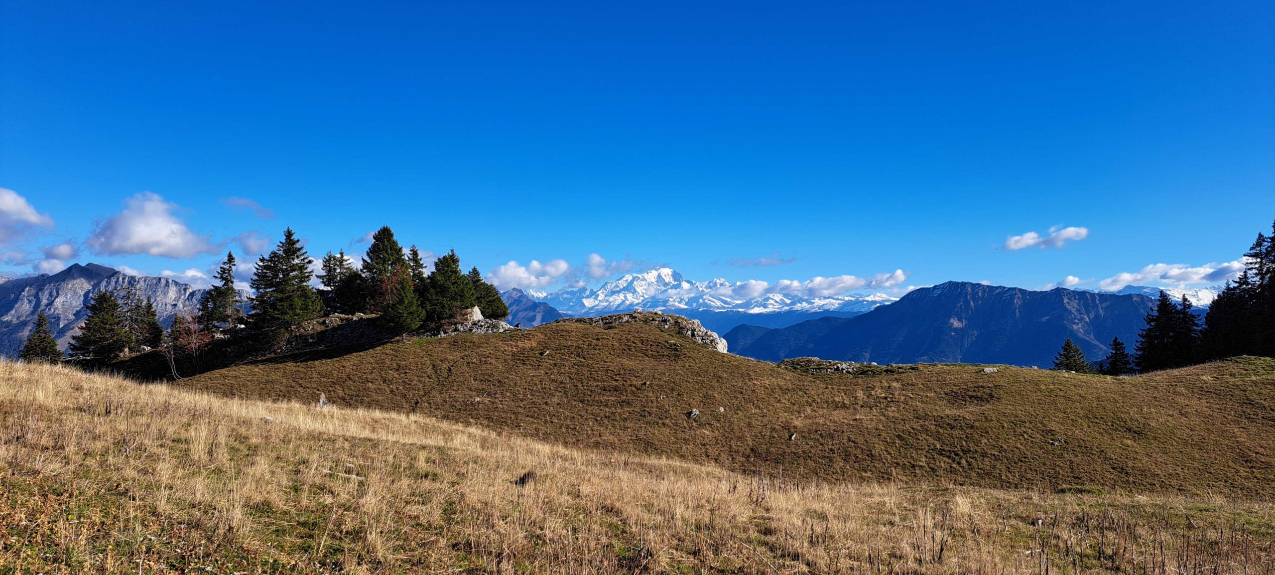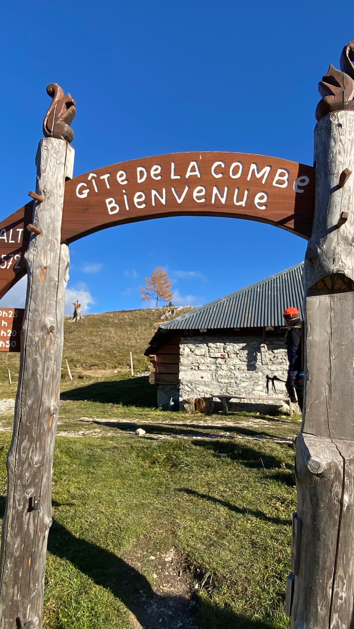 Une fois la falaise franchie et l’adrénaline redescendue nous débouchons sur le plateau où se trouve l’insolite Chalet de la Combe avec son entrée qui rappelle un ranch. Chèvres et brebis passent l’été dans ces alpages. Nous poursuivrons encore 30min en direction du chalet du Charbon en laissant sur la droite le chemin qui mène à la Pointe De Banc Plat. Les nuages jouent à cachecache avec le Mont Blanc. C’est là que nous posons nos sacs pour un repos bien mérité avant d’entamer le retour par le même chemin.