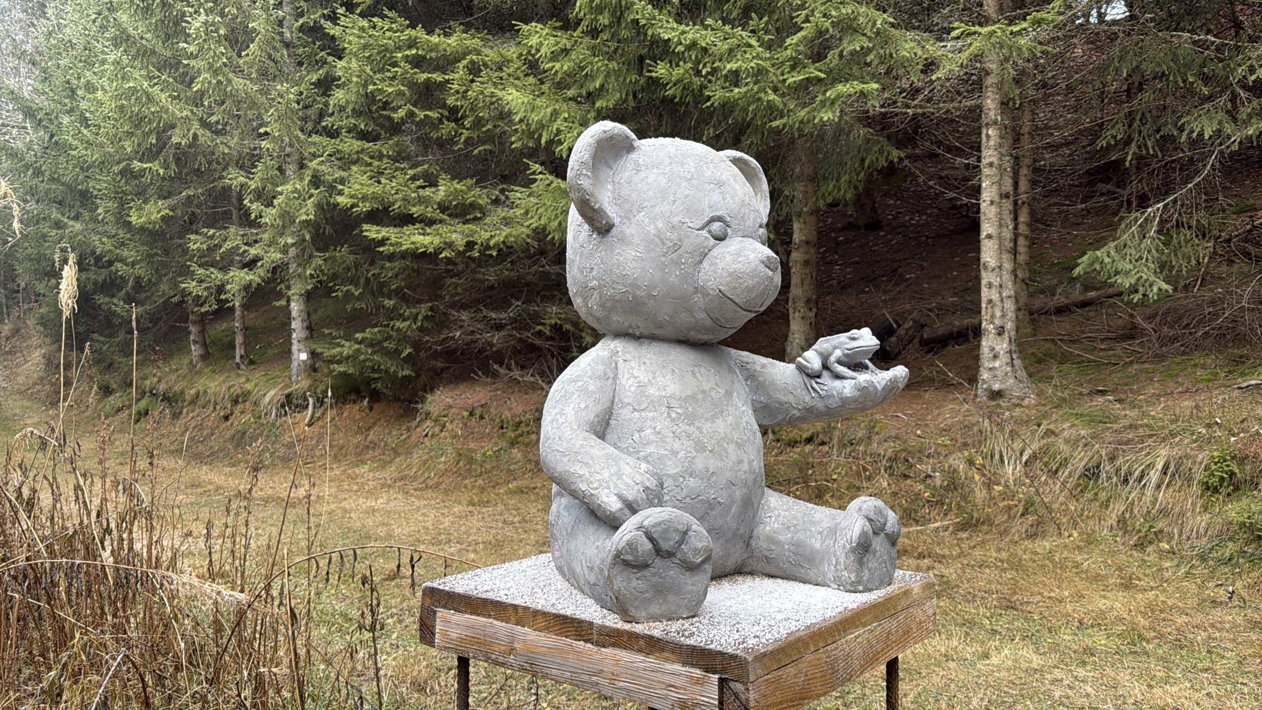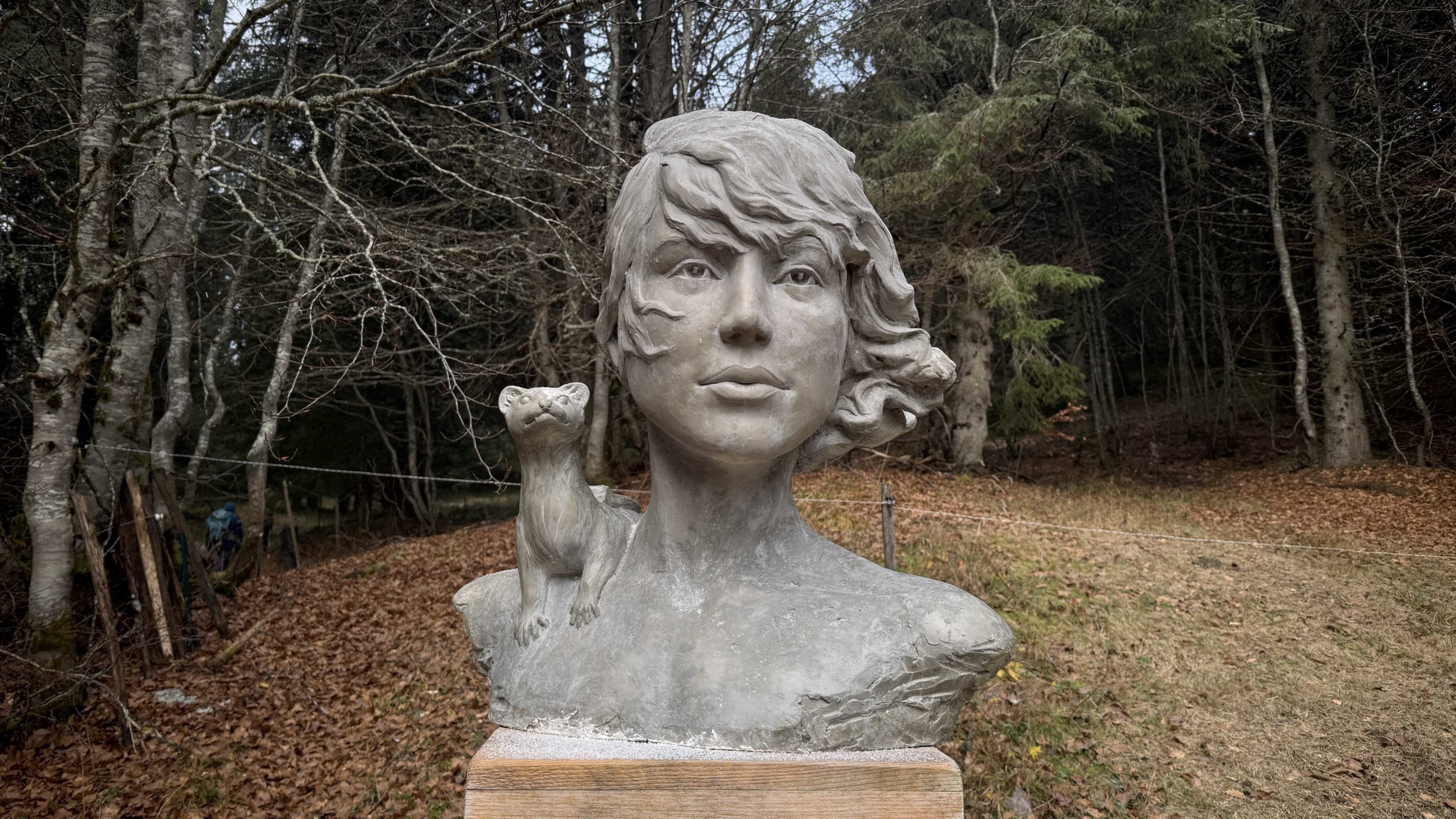 Nous sommes neuf au parking de La Féclaz où la foule des tout petits jours ne se presse pas d’autant que « ça pèle sévère » et que le grand soleil annoncé se fait attendre. Des transfuges de la rando douce, notamment notre vaillante Aline prête à en découdre pour attaquer sa nouvelle décennie. On y va Polé-Polé avec moults arrêts. Nous sommes interloqués par l’emprise des propriétés privées désormais entourées de hautes clôtures pour empêcher les différents promeneurs de pénétrer et peut-être de causer des incivilités susceptibles de nuire au patrimoine des propriétaires. Il est étonnant que la faune locale n’ait pas encore manifesté son désarroi et déposé une pétition en préfecture. Le long de la piste se dressent deux statues de fort belle facture.