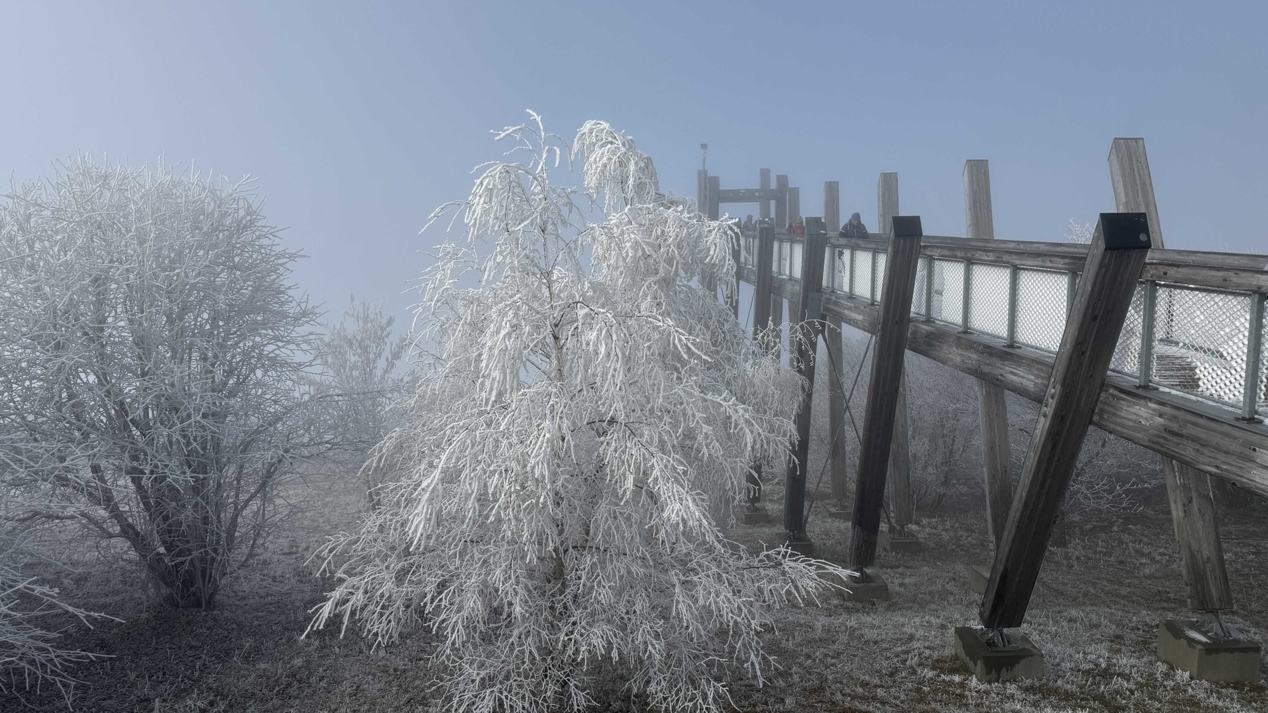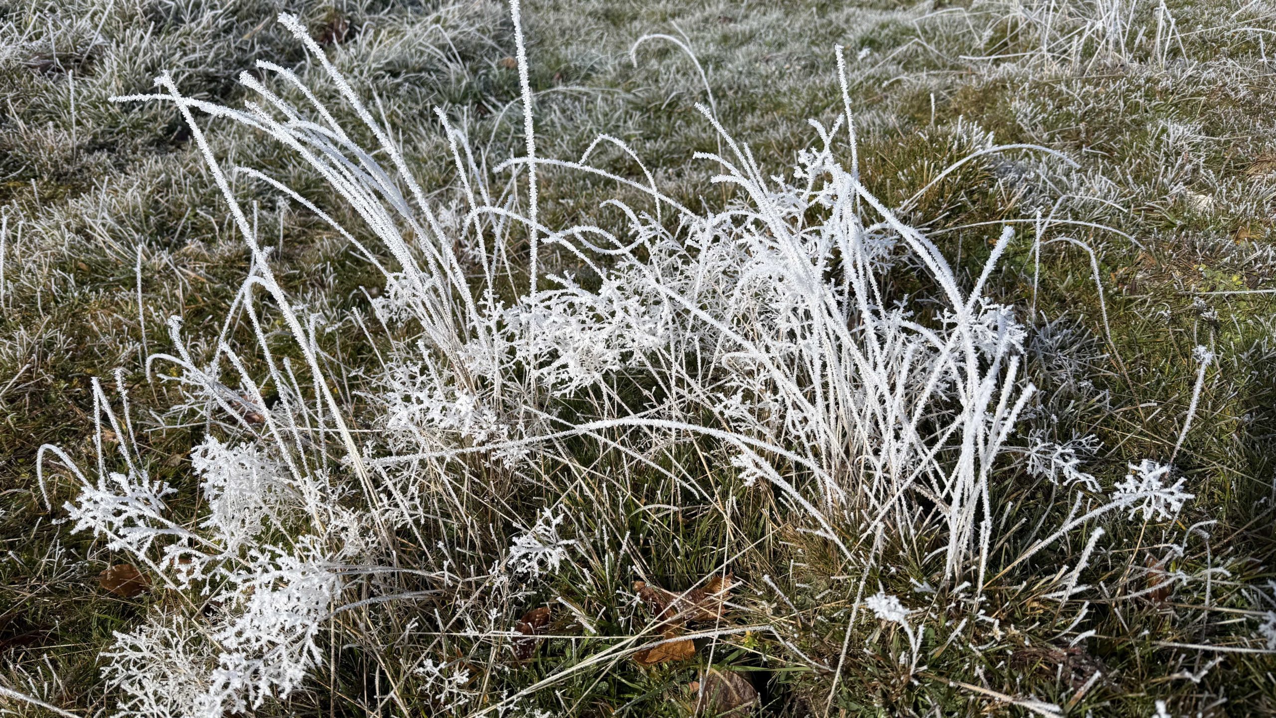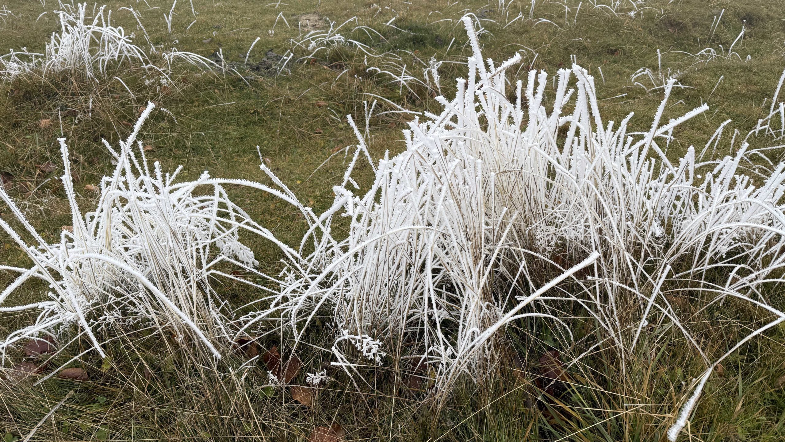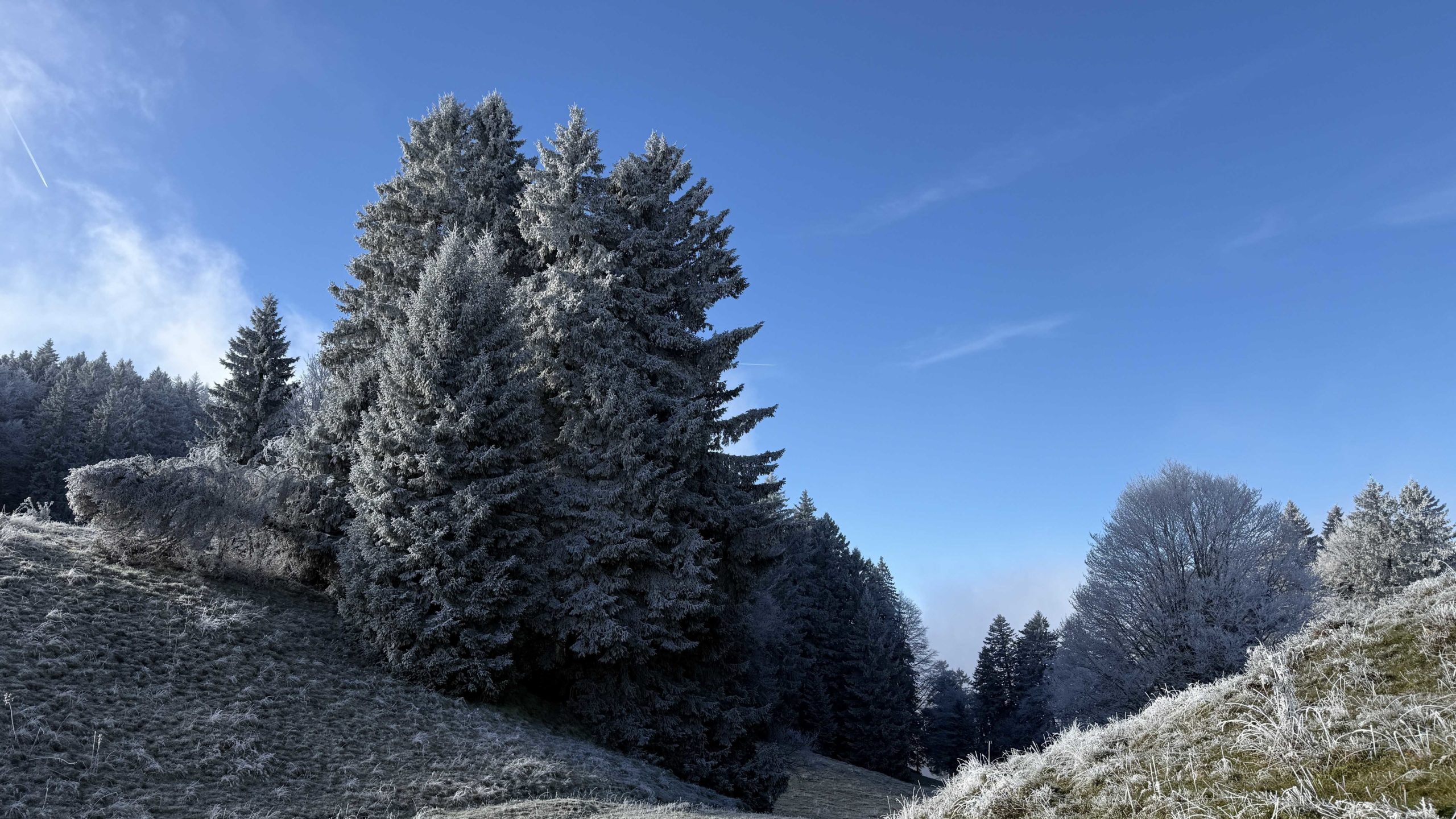 Pique-nique au Revard devant le lac qu’on ne verra pas aujourd’hui, les arbres ont pris leur décoration hivernale tandis que l’herbe est encore bien verte.