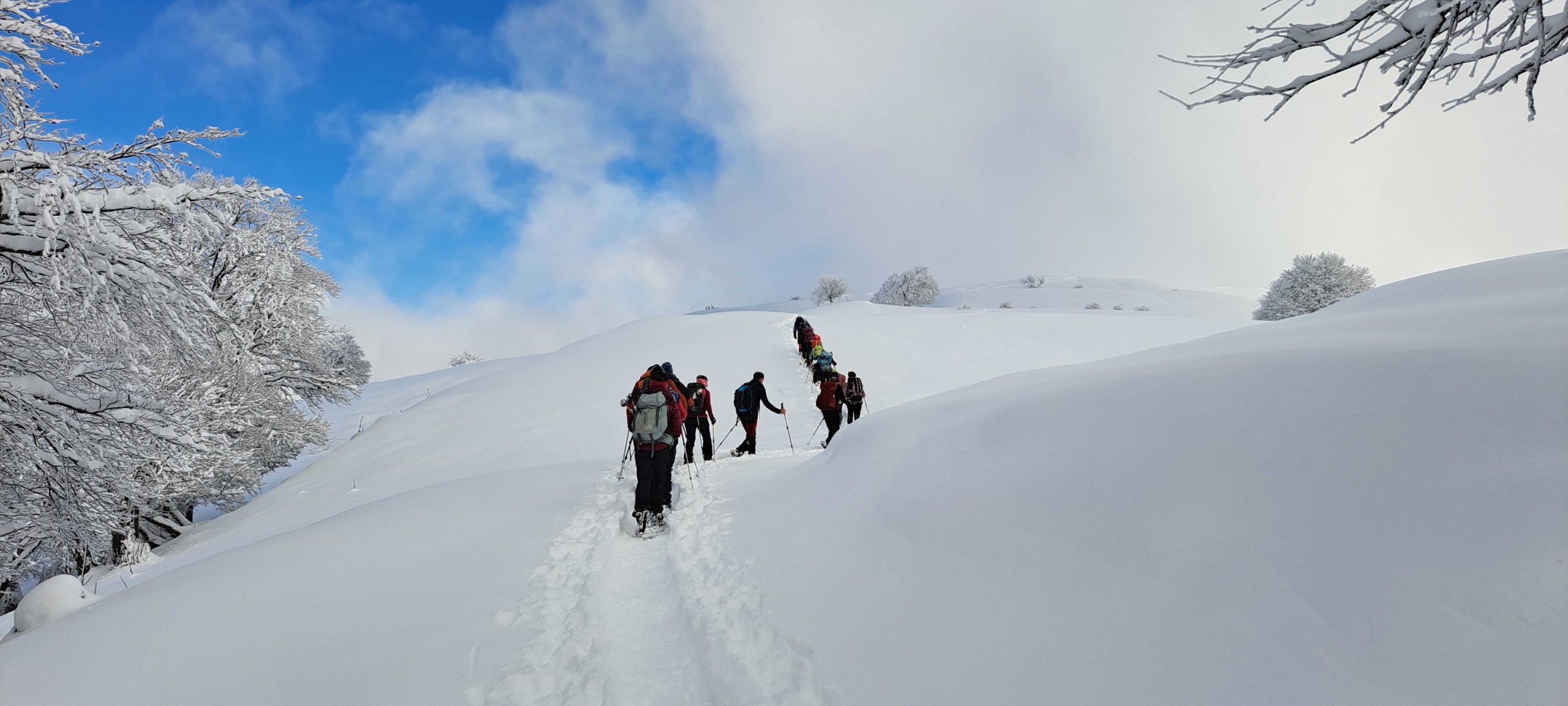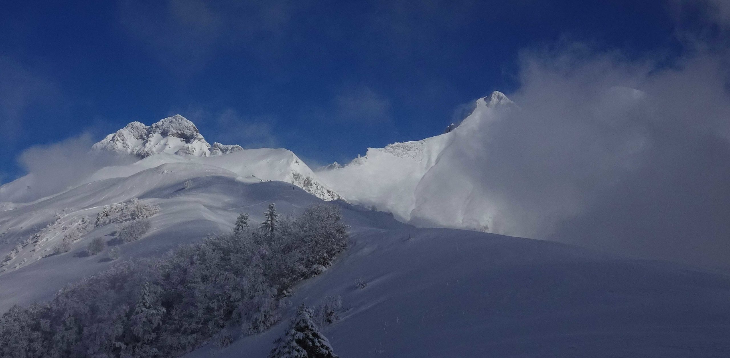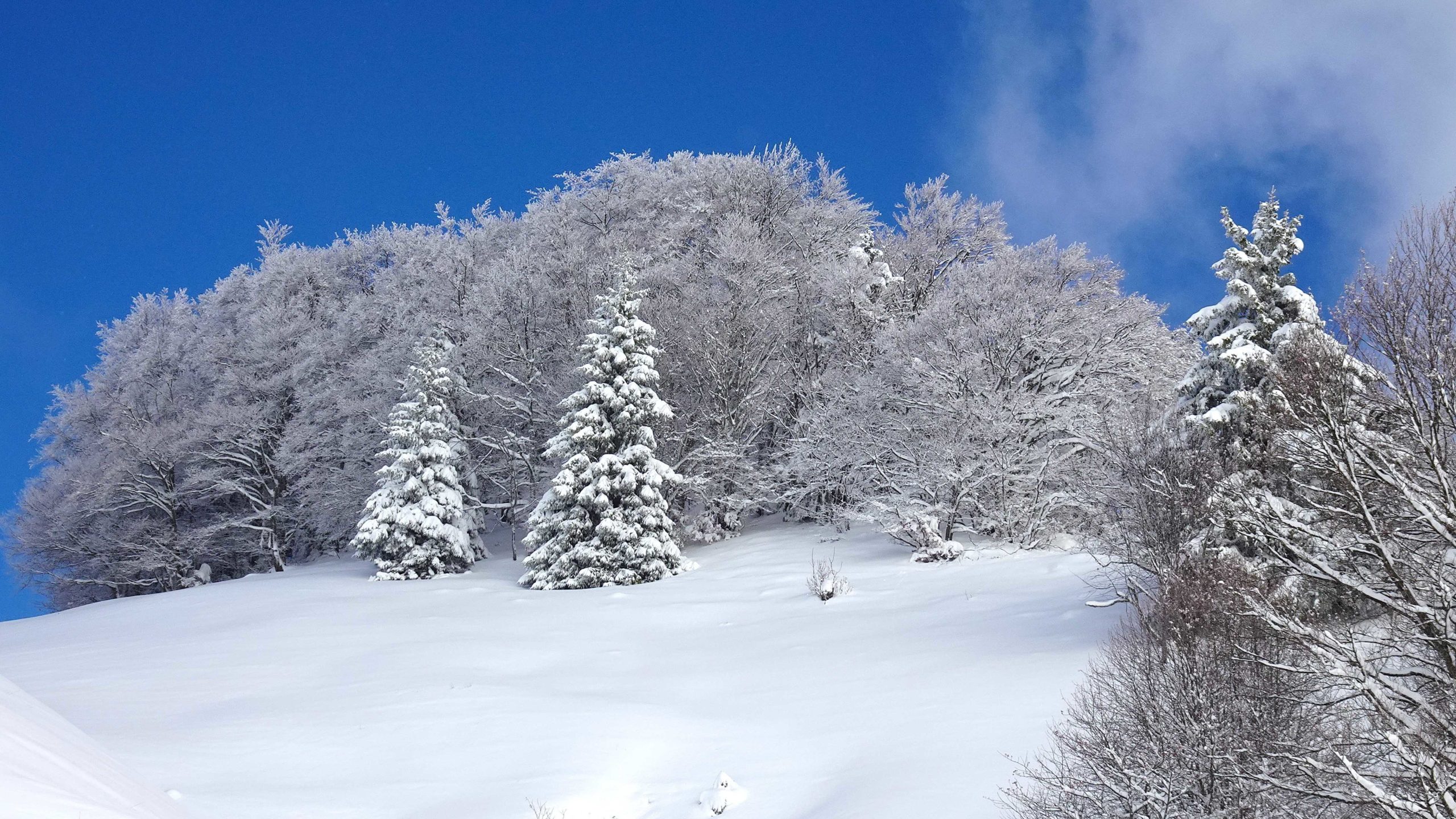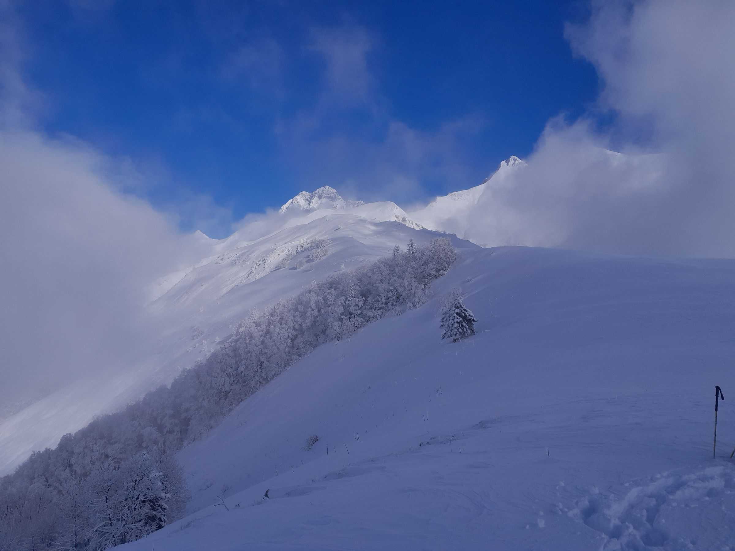 Plus nous montons plus la hauteur de neige s’épaissit : pas facile ! Nous faisons une pause grignotage car les troupes ont besoin d’énergie ! Le soleil  n’est pas encore là mais en arrivant à la Croix d’Allant , le ciel se dégage un court instant , juste le temps de prendre des photos de ce somptueux paysage hivernal !!!