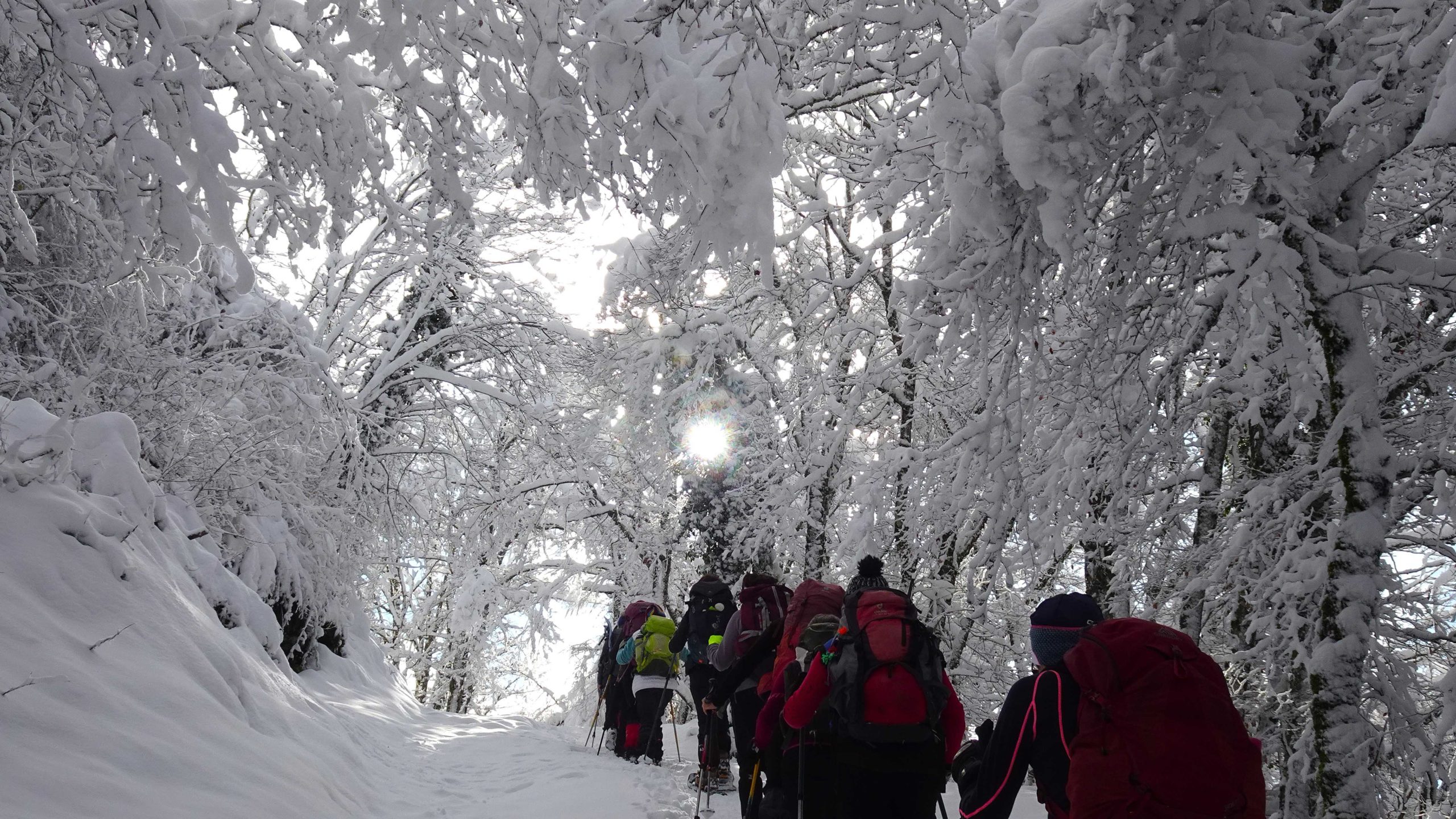 Nous faisons route vers Chapareillan, Montmélian, Saint Pierre d’Albigny, le col du Frêne et enfin Jarsy. Le départ est donné pour 10h afin que tout le monde ait chaussé les raquettes au coffre des voitures car nous démarrons en plein champ avec de la neige bien au dessus des chevilles…..