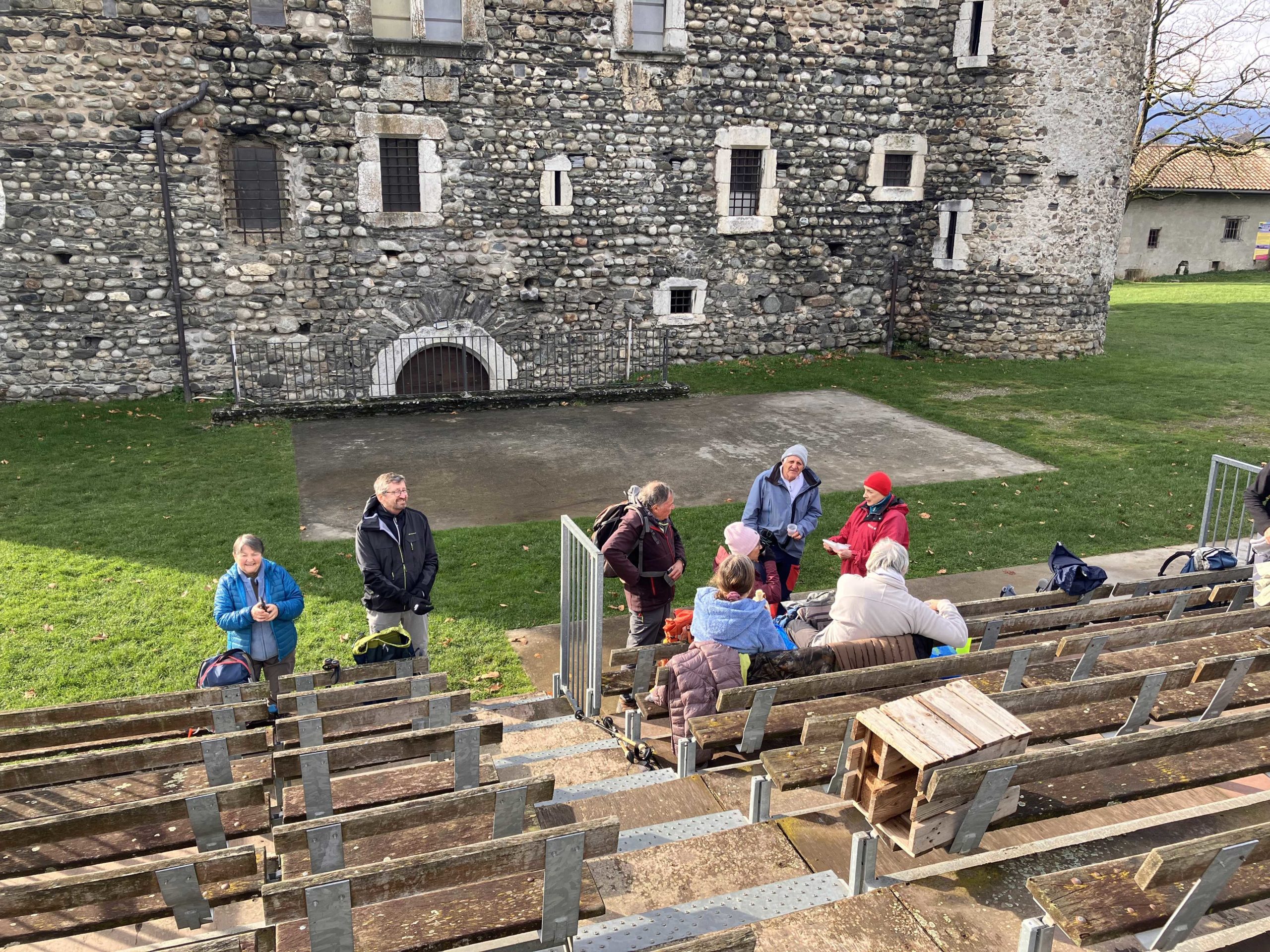 Le soleil nous honore de ses rayons. A L’arrivée au château nous prenons place au sec sur l’estrade pour déballer le pique-nique. A noter quelques modifications : les toitures des tourelles ont été restaurées mais il reste du travail sur ce château du 15ème siècle qui s’anime l’été avec des manifestations culturelles.