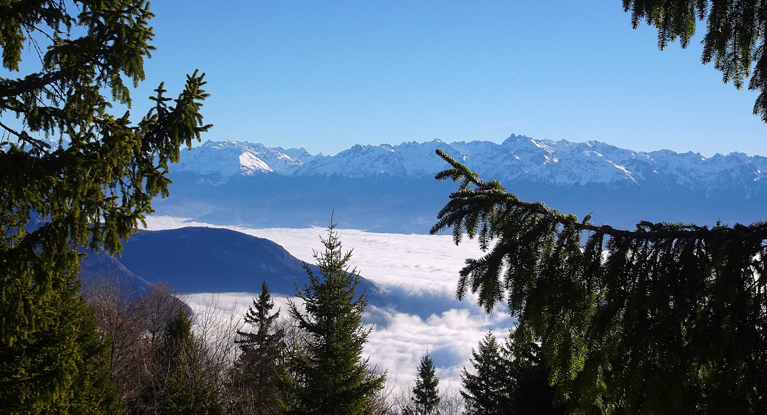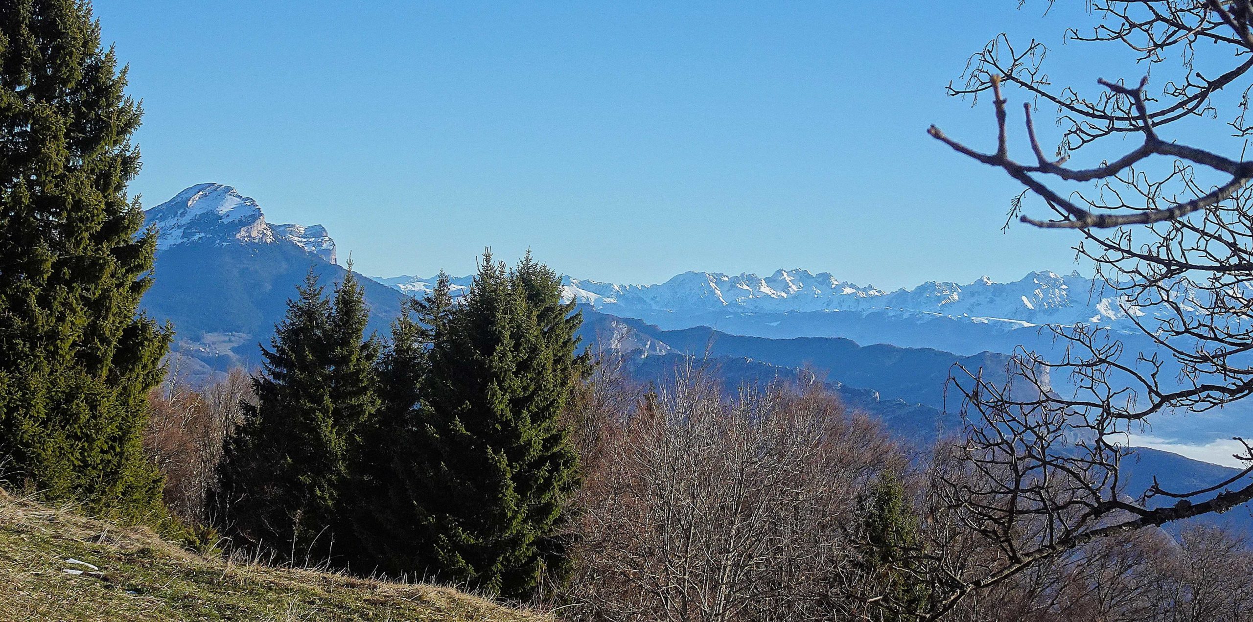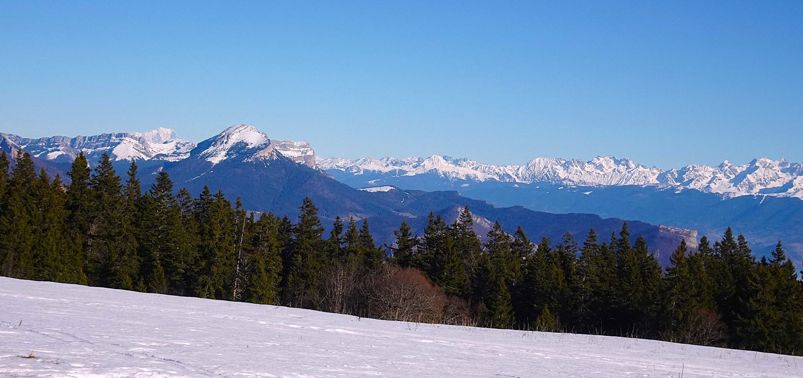Nous reprenons vers la Molière, évoluant en clairière, traversant quelques lapiaz avant d’arriver sur le plateau. Une belle vue panoramique de la Chaîne des Alpes, jusqu’au Mt Blanc, l’Oisans. Peu de monde, quelques skieurs de fond se font plaisir…sur une neige préservée pour eux.