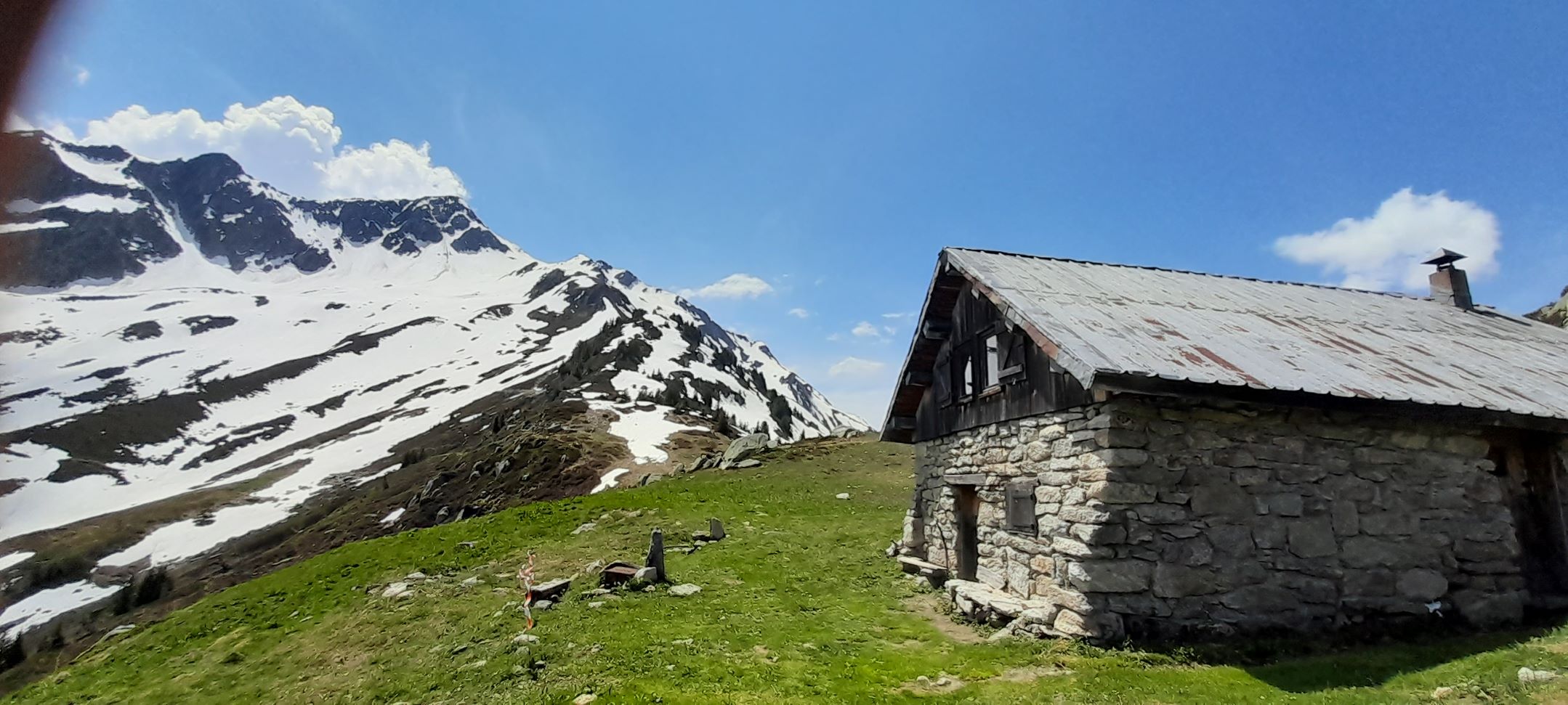 Au sortir de la forêt, des prairies parsemées de nombreuses pensées et de gentianes aux grandes corolles nous émerveillent ! La nature est toujours surprenante de beautés ! Nous atteignons un joli petit refuge au pied du Mont Bellacha dont le sommet est bien enneigé. Nous admirons un majestueux panorama formé du Mont Pourri, de La Grande Casse, des glaciers de la Vanoise….etc .