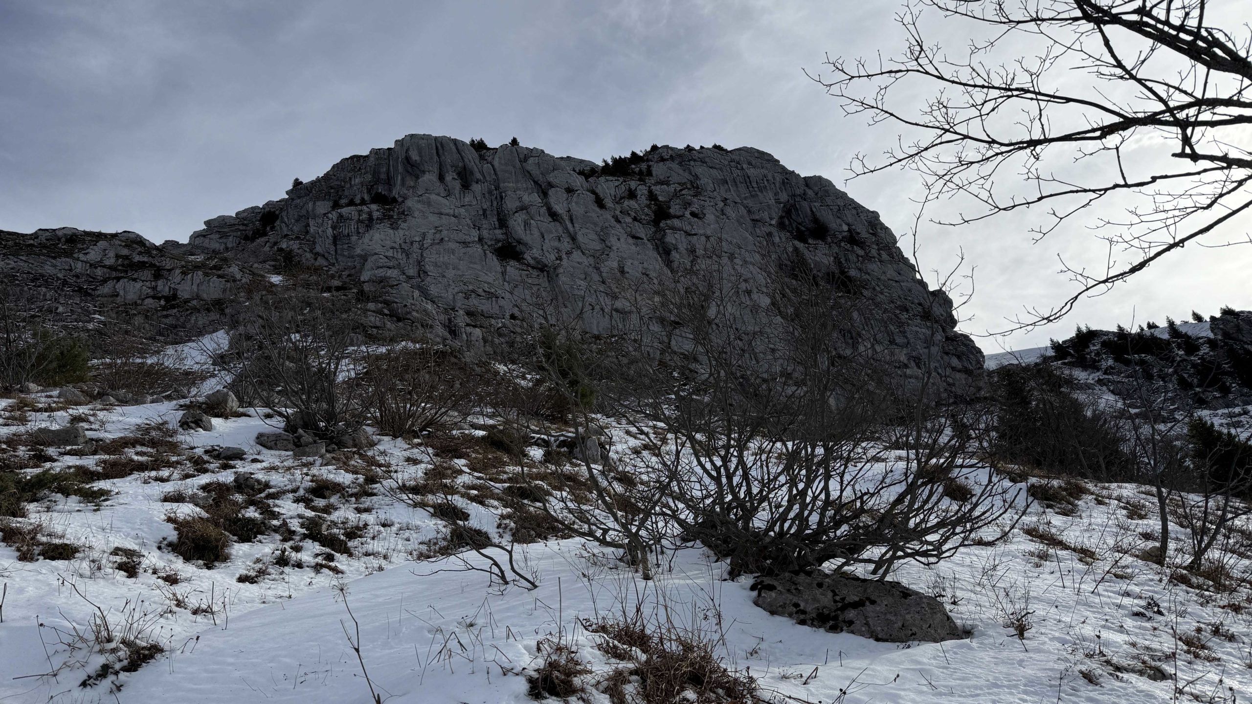 Au parking du reposoir, au vu des conditions d’enneigement observées, nous laissons les raquettes dans la voiture mais prenons les crampons. La météo est au beau fixe et la température au parking plutôt clémente à 6,5° sans vent. L’ascension commence dans des pentes débonnaires et très régulières, au Chalet du Golet on attaque la pente terminale avec l’objectif bien en vue. C’est à cet instant que l’on décide de chausser les crampons, la neige recouvrant l’ensemble du sentier désormais. Le groupe s’élève régulièrement pour finalement atteindre le pied du sentier d’accès à la Dent des Portes enneigé mais non tracé. Le vent est maintenant fort. Compte-tenu de la configuration du terrain, de la neige, 25cm, et du vent, il est plus raisonnable de ne pas faire l’ascension finale et de se contenter de l’Aller Retour à la crête surplombant le Trélod et offrant la vue sur le Mont-Blanc.