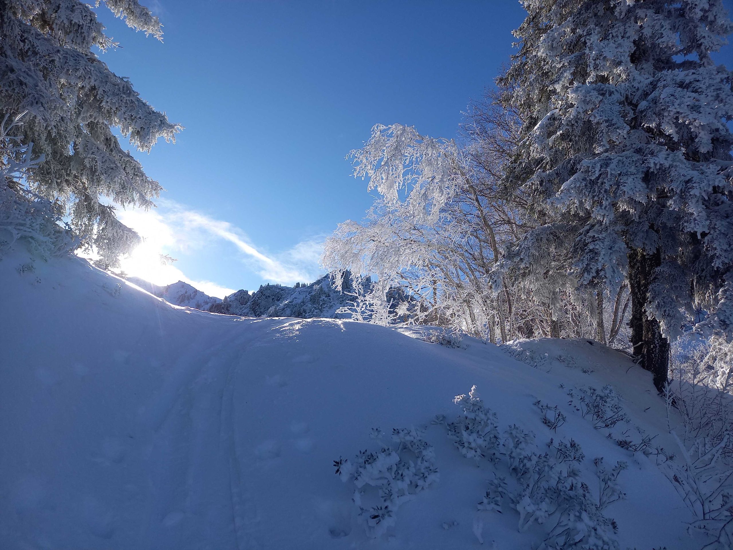 Avec un panorama sur « Les Grands Moulins », puis sur Le Massif des Bauges entre autres, chacun a son rythme a vaincu cette montée ardue dans la neige fraîche et arrive au Col de L’Occiput !