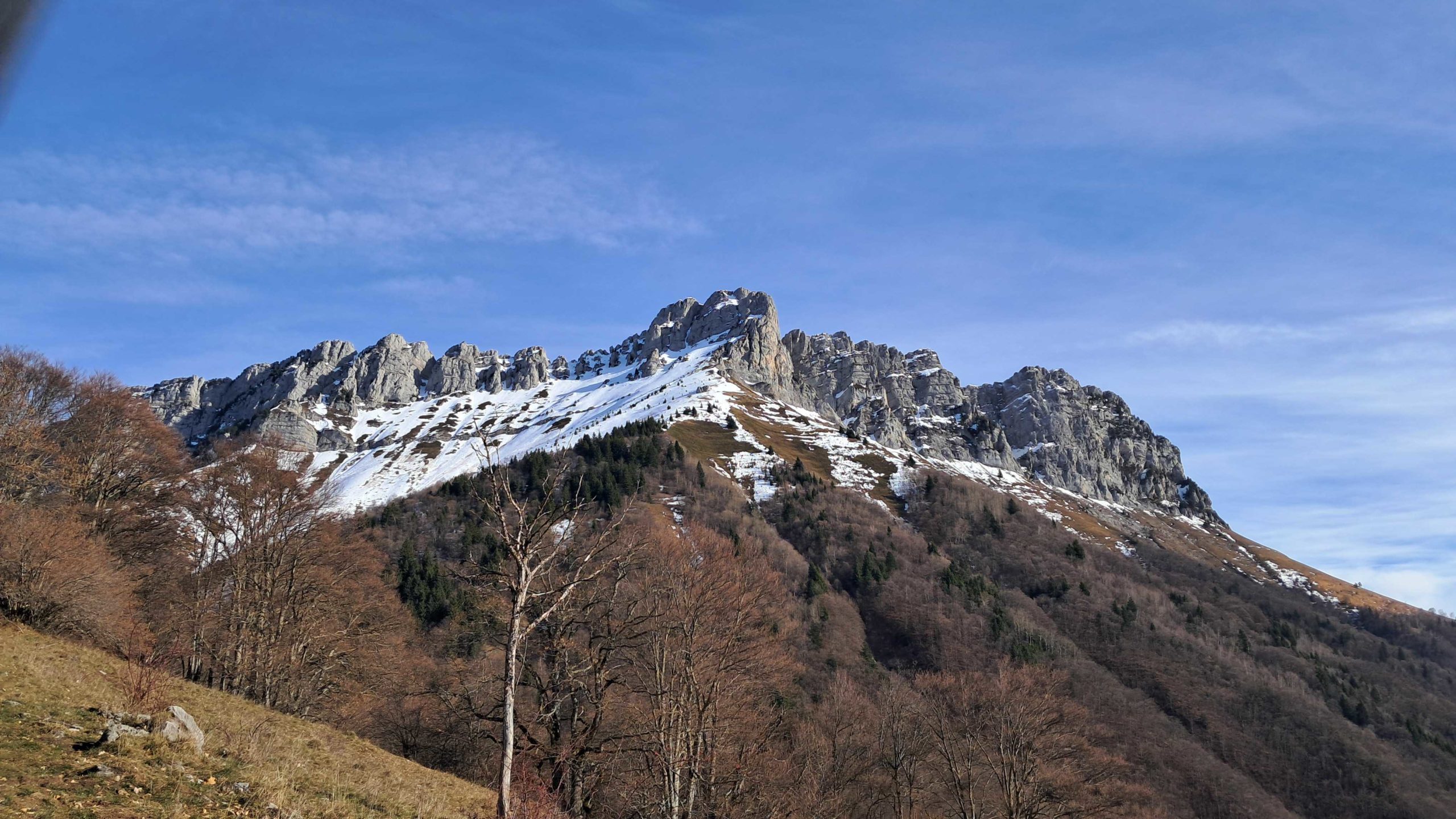 Nous montons par la piste forestière afin de profiter de la vue sur les monts environnants. Aujourd’hui , point de neige, quelques plaques par ci par là.