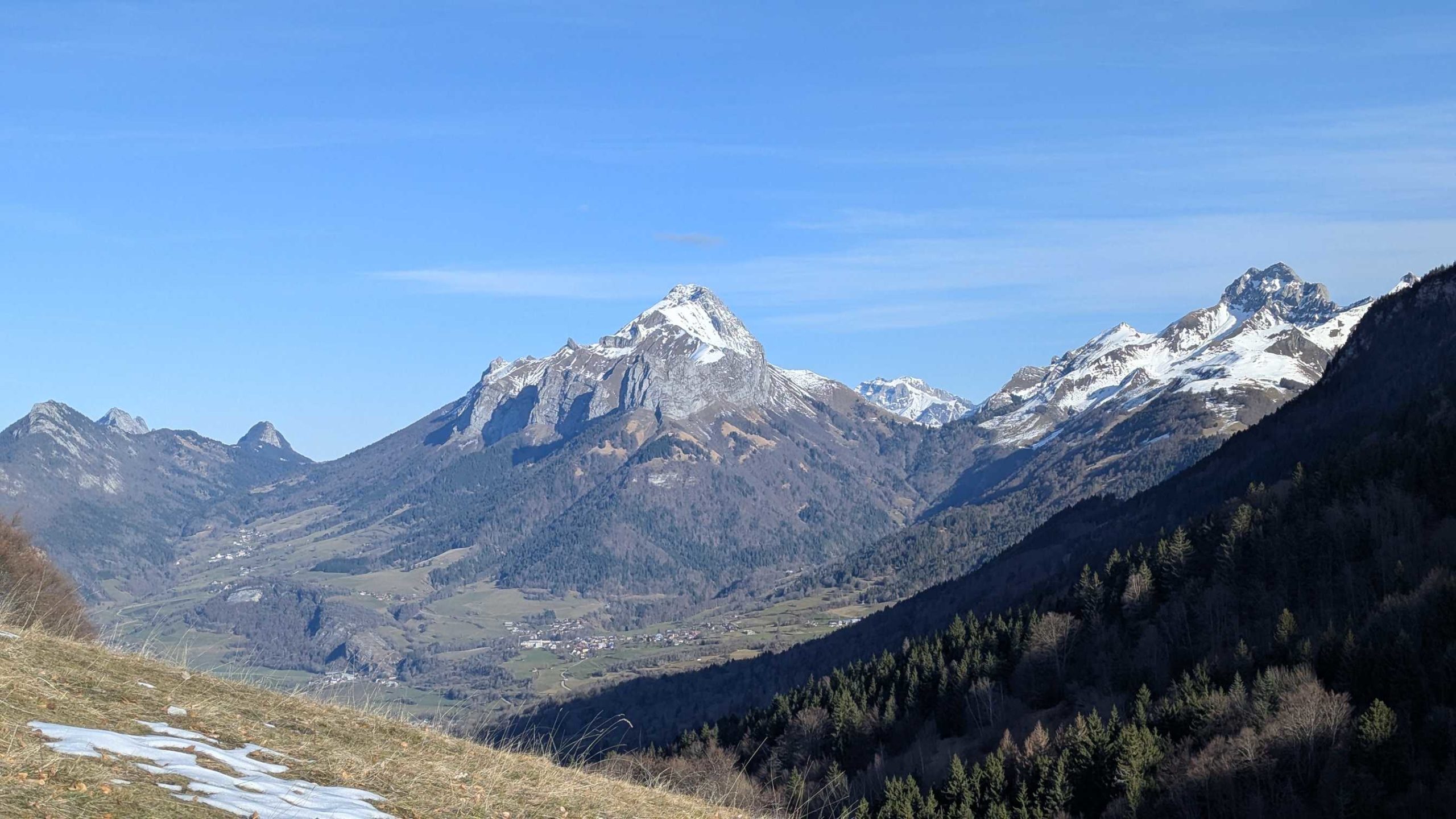 Il fait bon au soleil et nous profitons de la vue : Margeriaz et sa couche de neige, Mont Colombier, Mont Morbier et Mont Pelat.