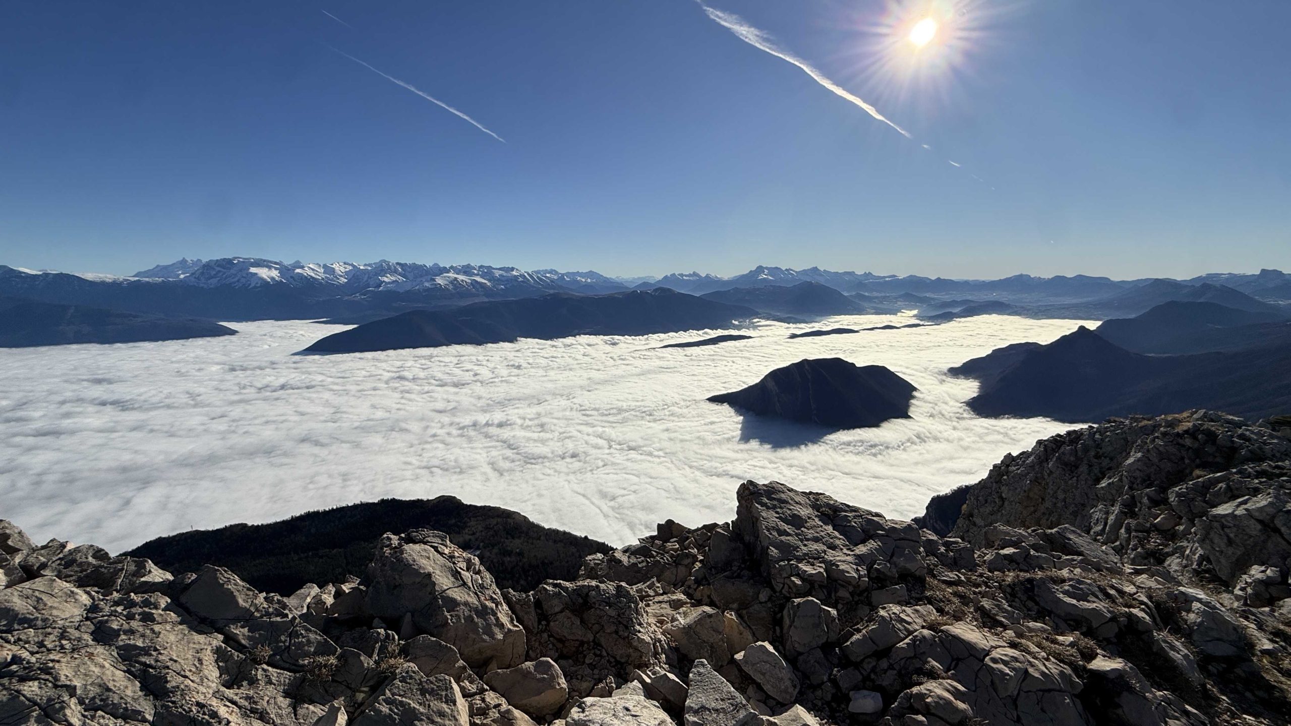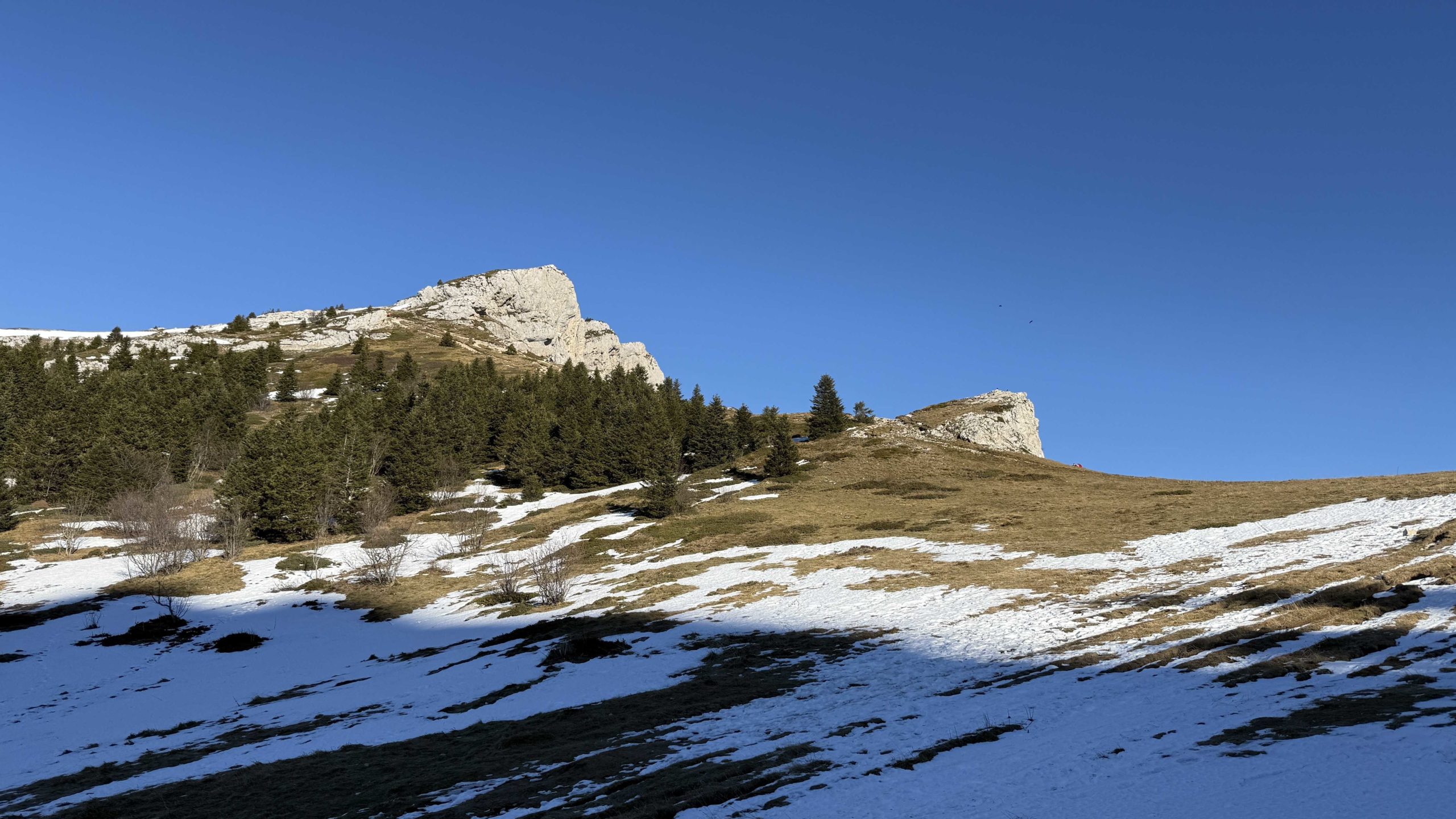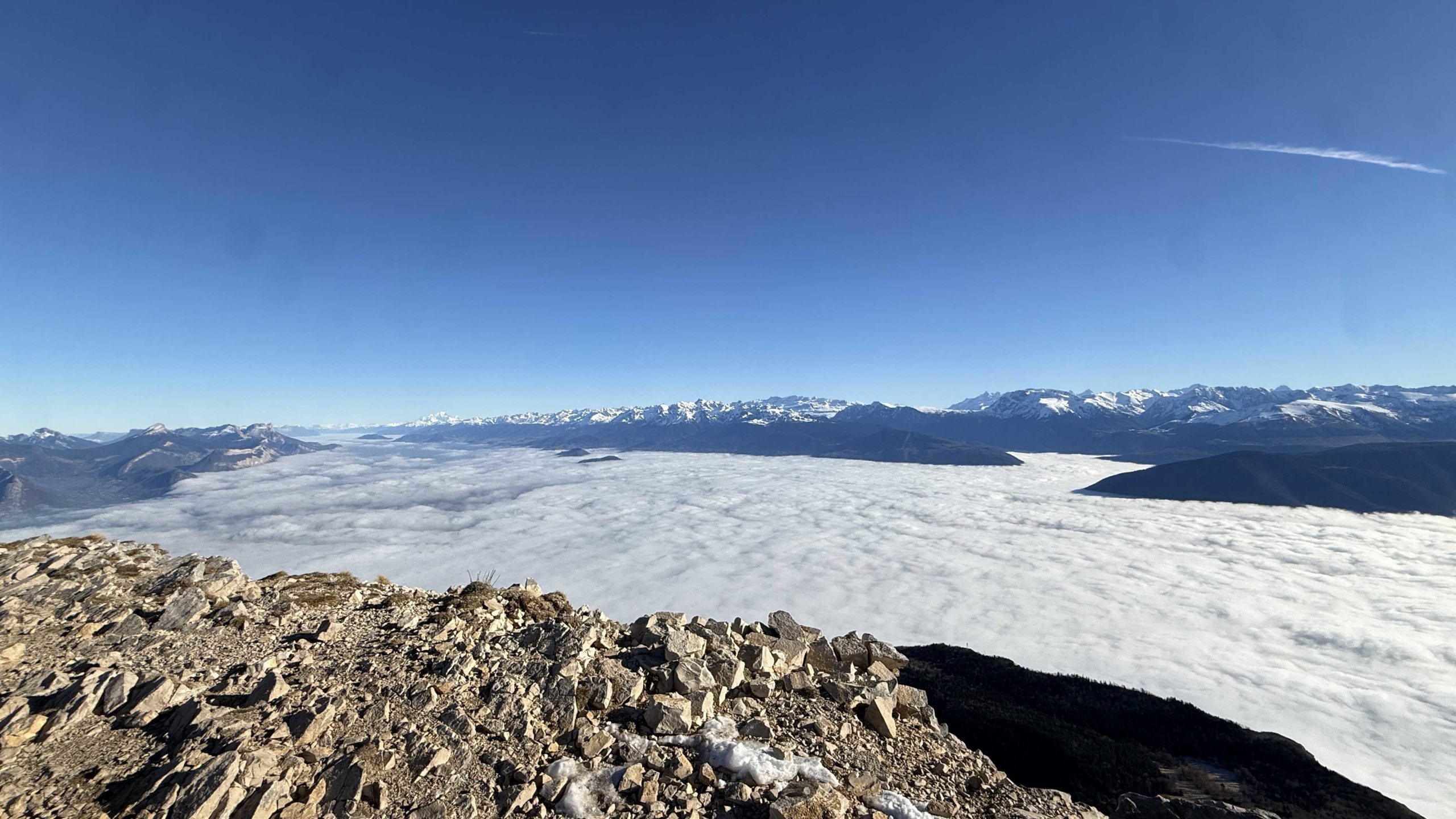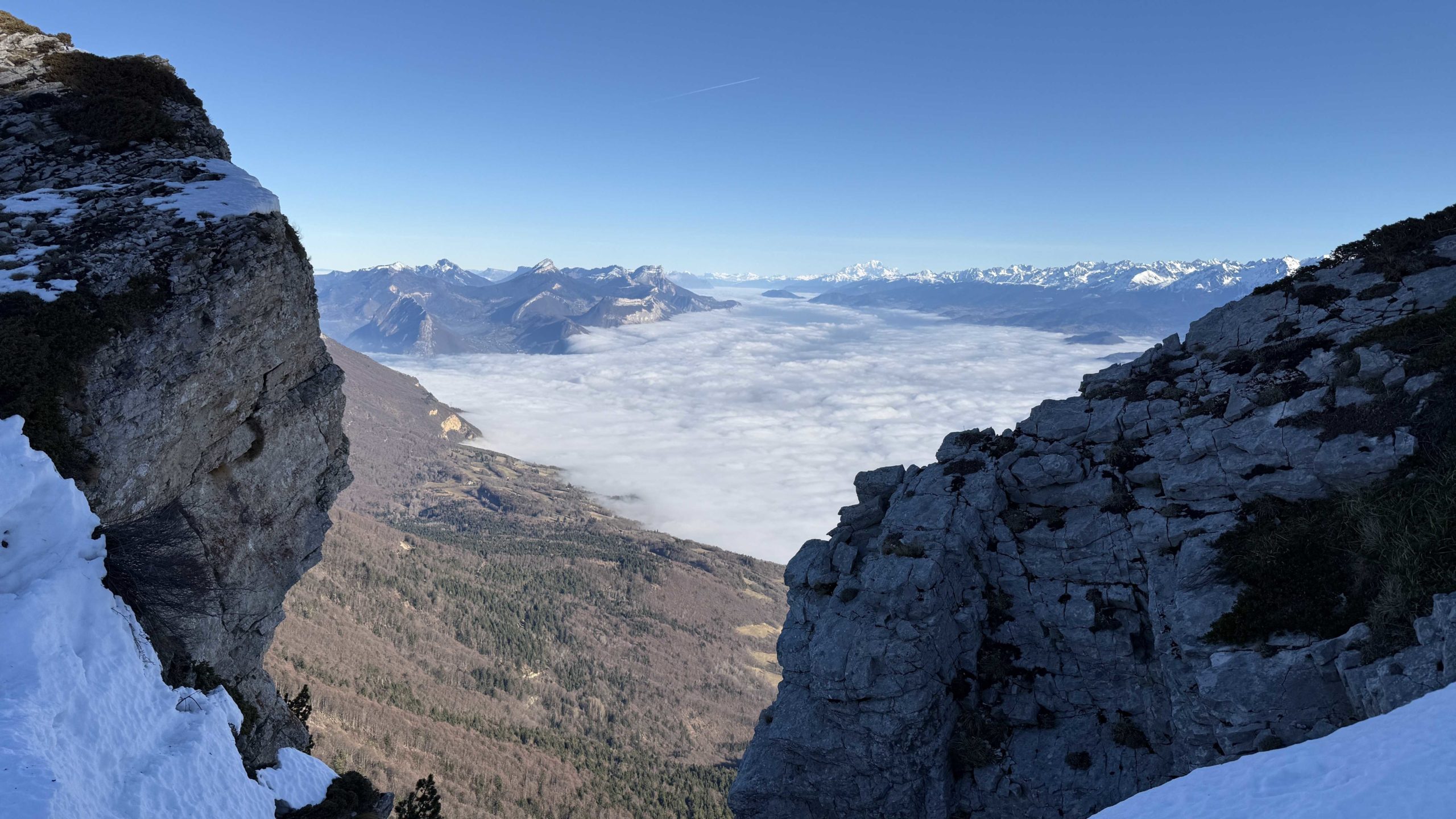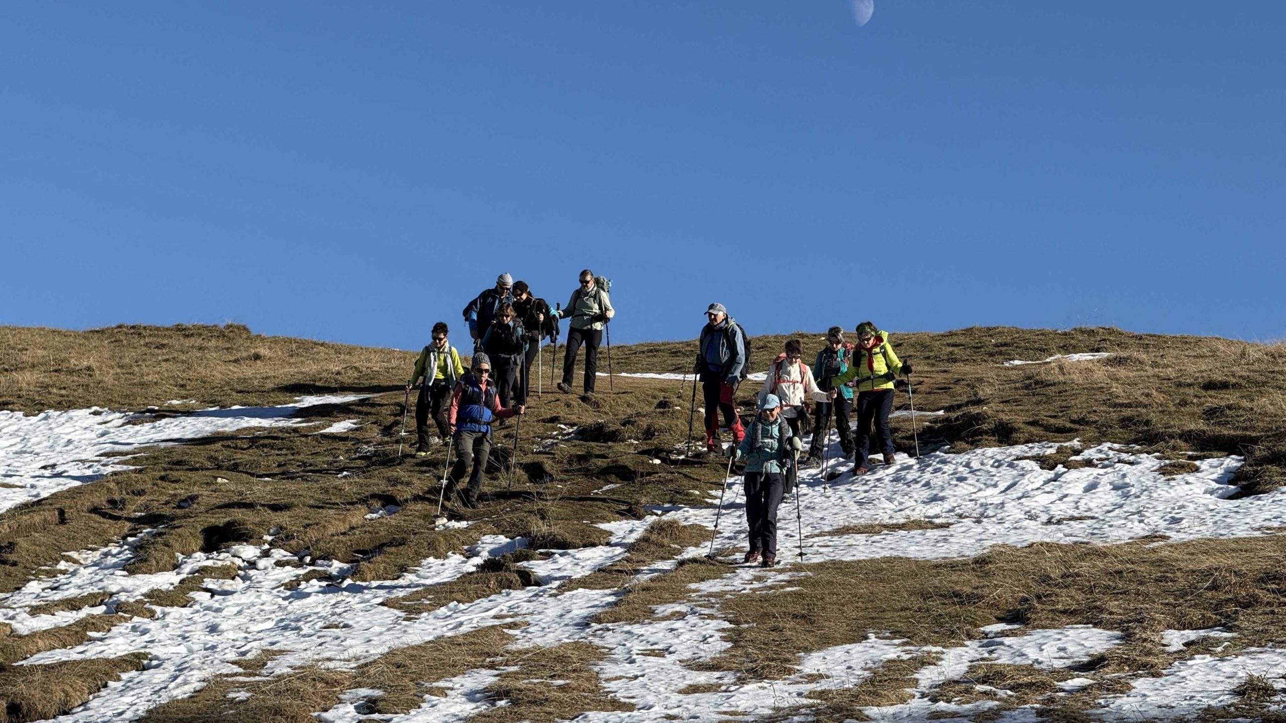 Météo idéale pour cette balade dans le Vercors sans la neige espérée évidemment, les chutes abondantes de Mi-Novembre n’ayant pas résisté aux épisodes de redoux, et c’est un plateau bien sec qui s’offre à nous après une traversée assez longue de la couche de nuage bien connue des Grenoblois en cette période de l’année occasionnant une classique inversion de température. Le groupe de douze Azimutiens ne goûte pas son plaisir et Alain qui s’était fait porter pâle pour une prétendue tendinopathie du tendon d’Achille en récidive… n’a d’autre choix que reprendre son rôle d’animateur! Assez rapidement le meneur annonce que les crampons deviennent obligatoires car la pente devient plus raide et des sections de neige bien dure se présentent rendant les choses plus sûres et confortables. Une première trouée assez vertigineuse permet d’apprécier le phénomène décrit plus haut avec une mer de nuages plutôt compacte ce jour et des ilots qui émergent de loin en loin.