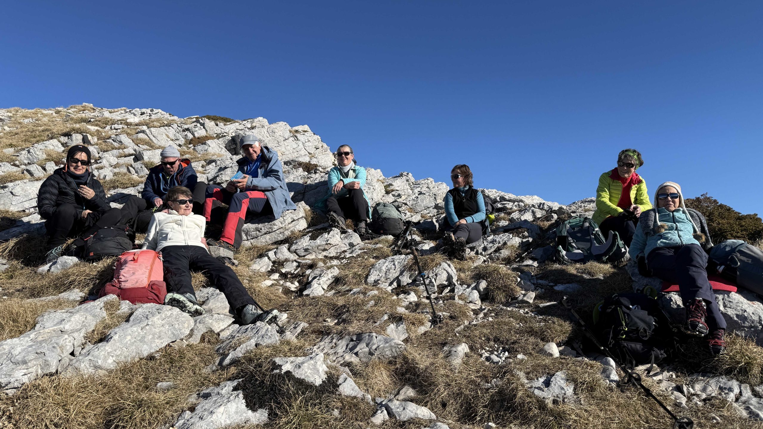 On termine l’ascension du Pic St Michel où l’unanimité se fait sur le lieu de picnic après que Brigitte, experte en voile de parapente eut assisté une parapentiste dans l’ultime gonflage de sa voile avant le grand saut, et tout s’est bien passé. Repas au soleil avec lézardage de rigueur, le changement climatique a aussi des côtés plaisant il faut le reconnaitre. Partage de douceurs de saison.