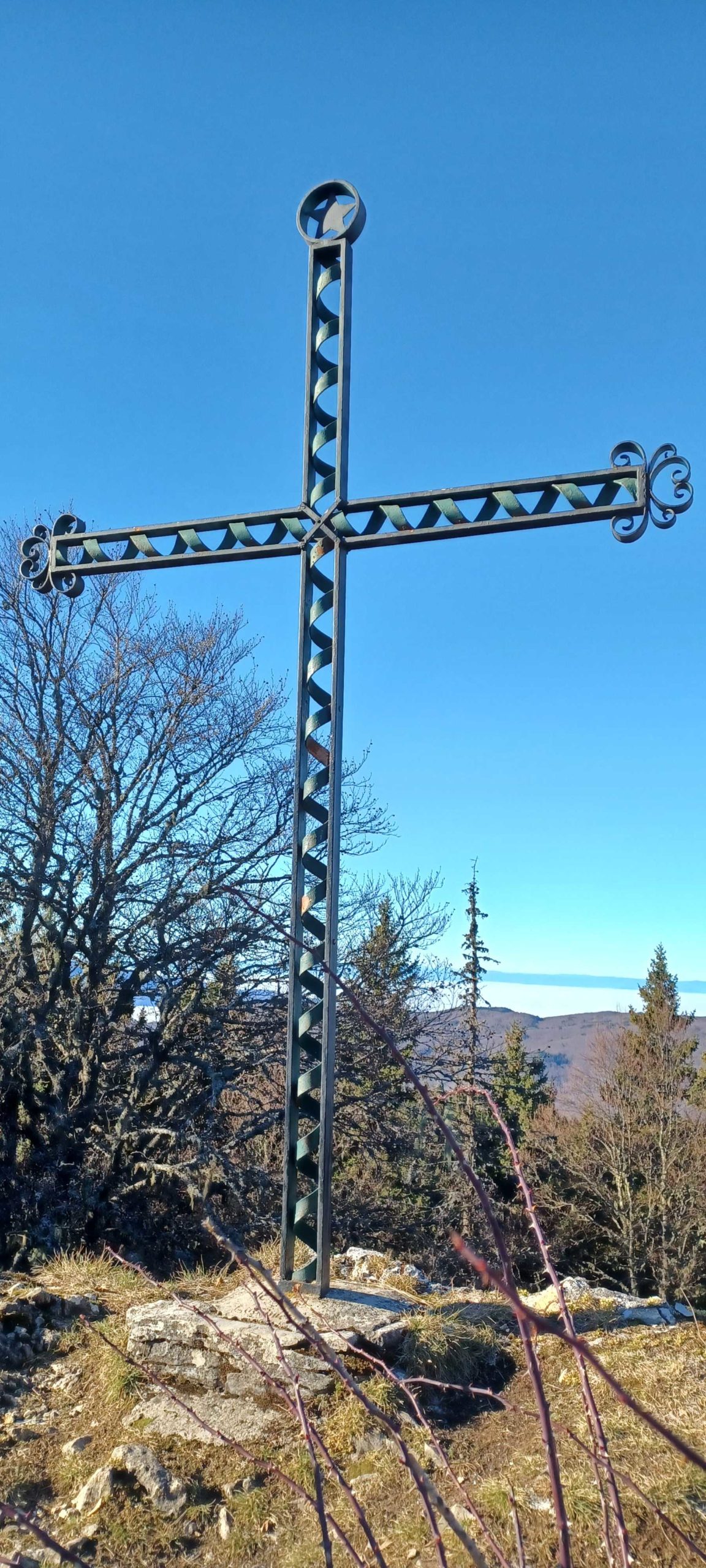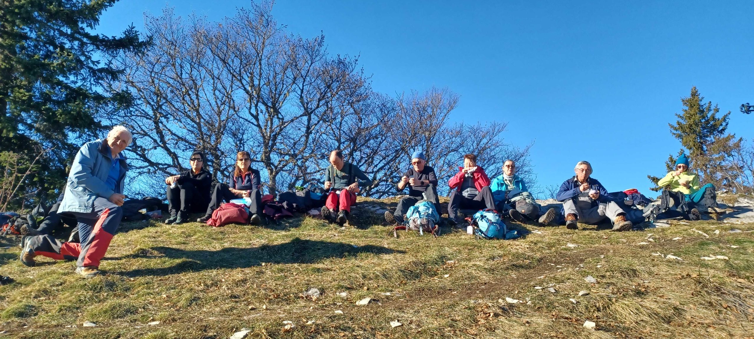 Nous voilà à la croix du sommet, nous sommes 13 à nous installer en ligne, s’il vous plaît, pour nous restaurer ! Moment agréable au soleil quand la vallée est sous les nuages !!