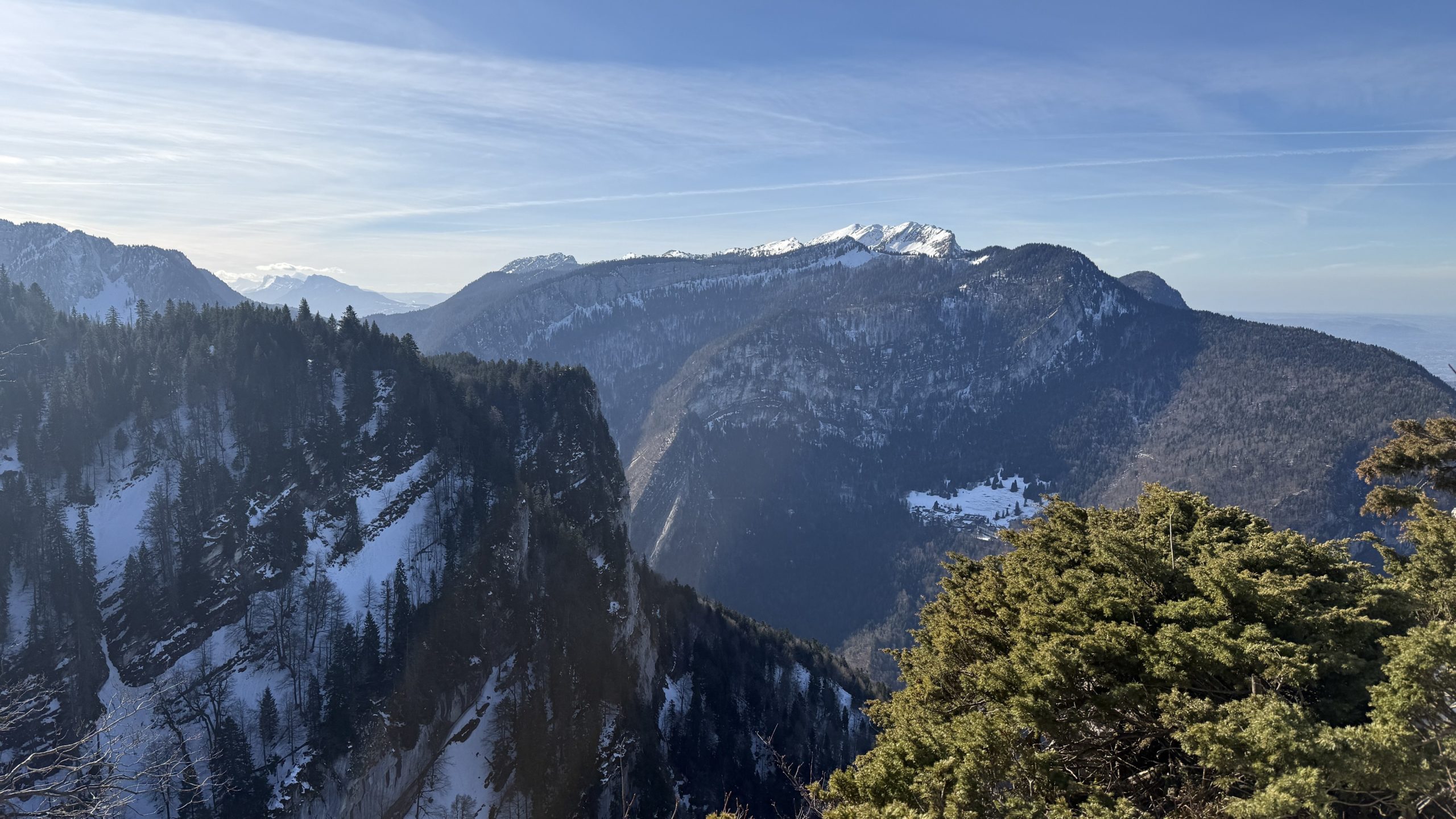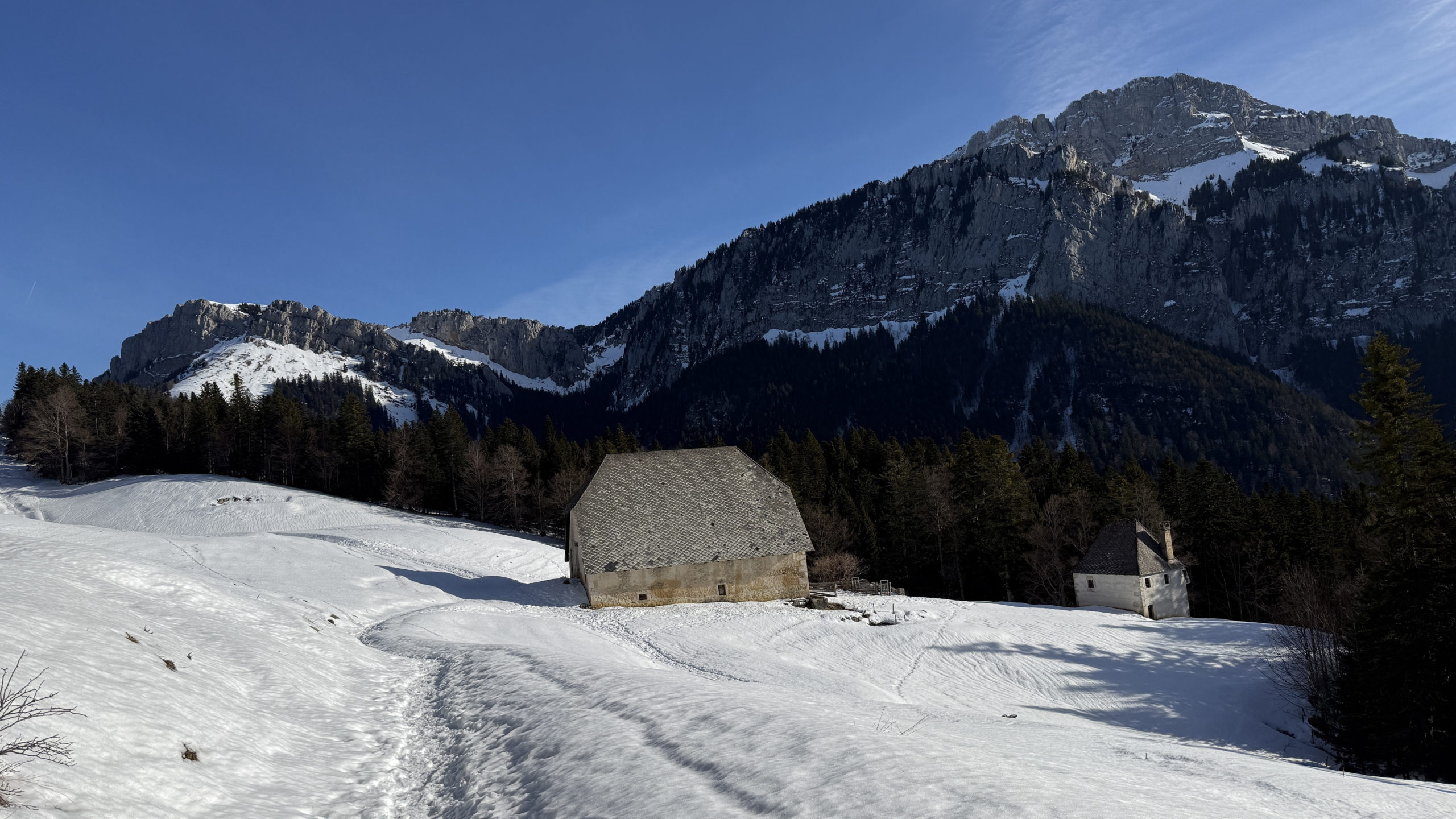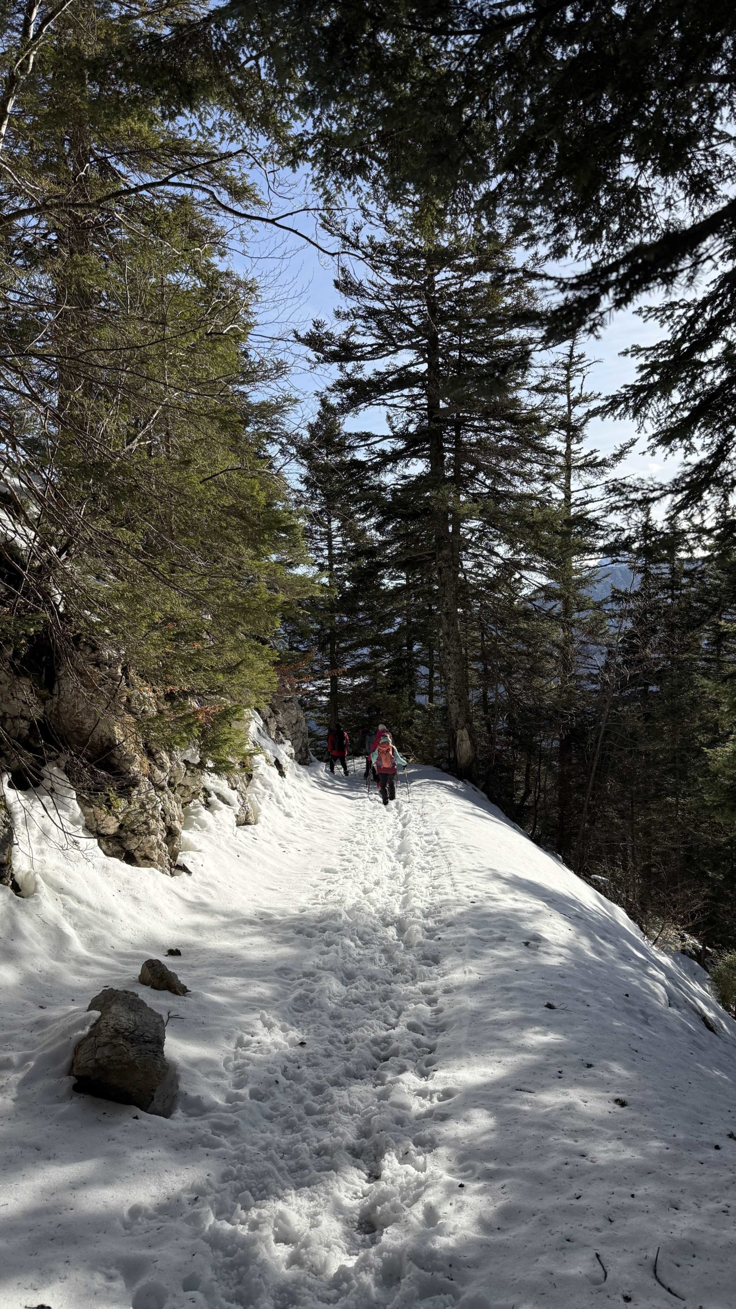 Aux voitures Alain décide de laisser les raquettes et d’assumer les possibles galères. Assez rapidement, on rencontre la neige et un peu de verglas qui nous incite à chausser les crampons derechef. Après le monastère on laisse à main gauche la route enneigée du retour et on monte allègrement en direction du Habert de Billon dans cette magnifique forêt Chartroussine. On bifurque ensuite en direction du col d’Arpison et du Belvédère éponyme. La neige est profonde, n’a pas encore transformé à l’abri des arbres et la progression devient difficile sans les raquettes qu’Alain n’a pas jugé bon de prendre, et deux choses méritent d’être mentionnées, à cet instant du récit:
