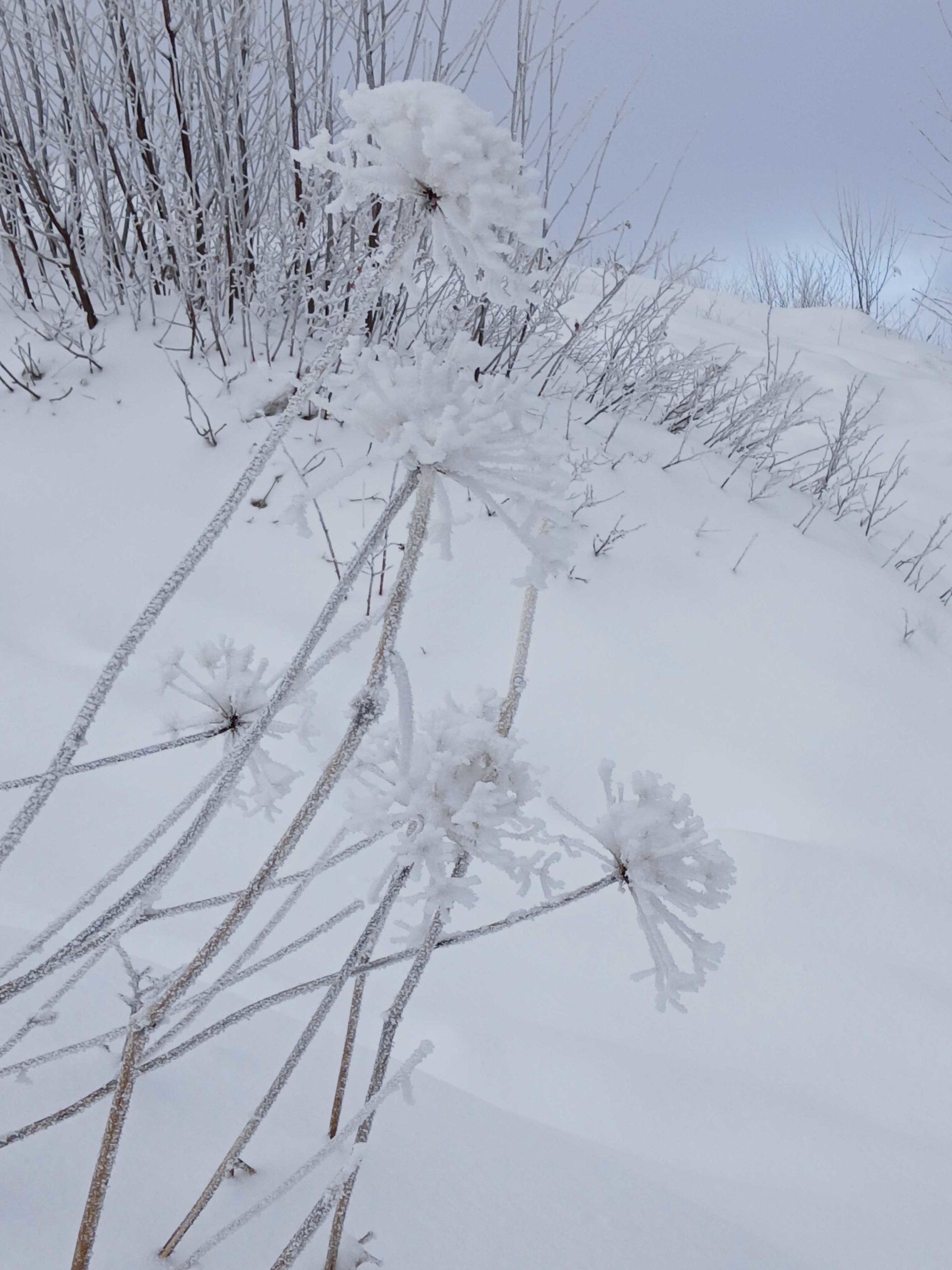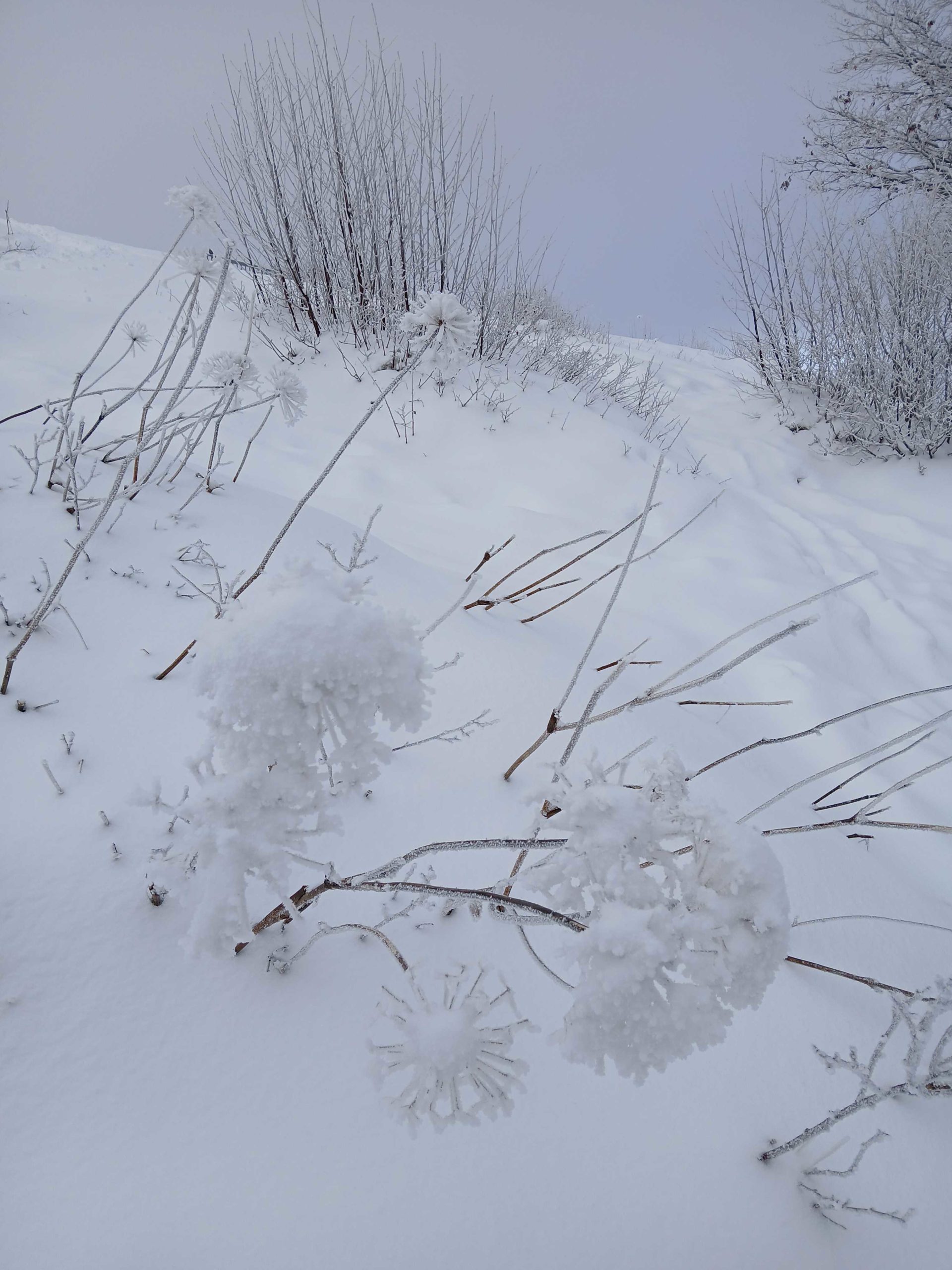 La neige est tombée pendant la nuit et un épais manteau blanc recouvre les champs. Les arbres sont chargés de neige, le soleil est timide en ce début de matinée.