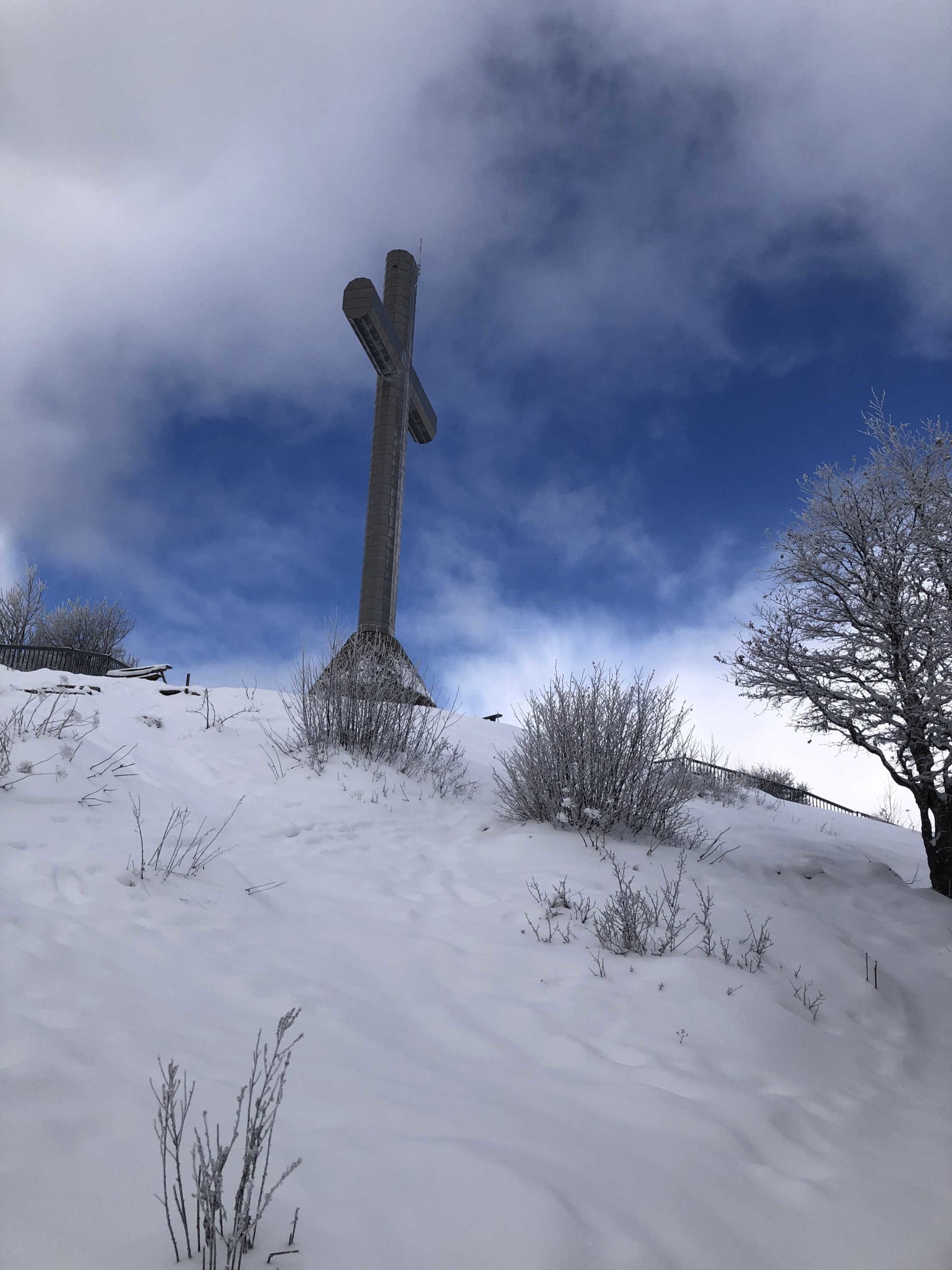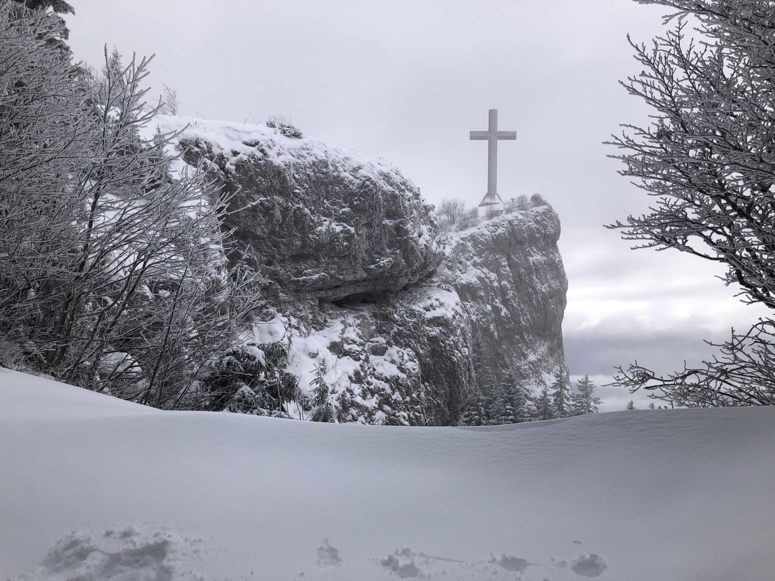 Nous chaussons nos raquettes et commençons notre progression vers le sommet à 1538 m. Le temps brumeux nous cache la Croix. Nous montons jusqu’au sommet , un petite éclaircie nous permet d’entrevoir le lac du Bourget.