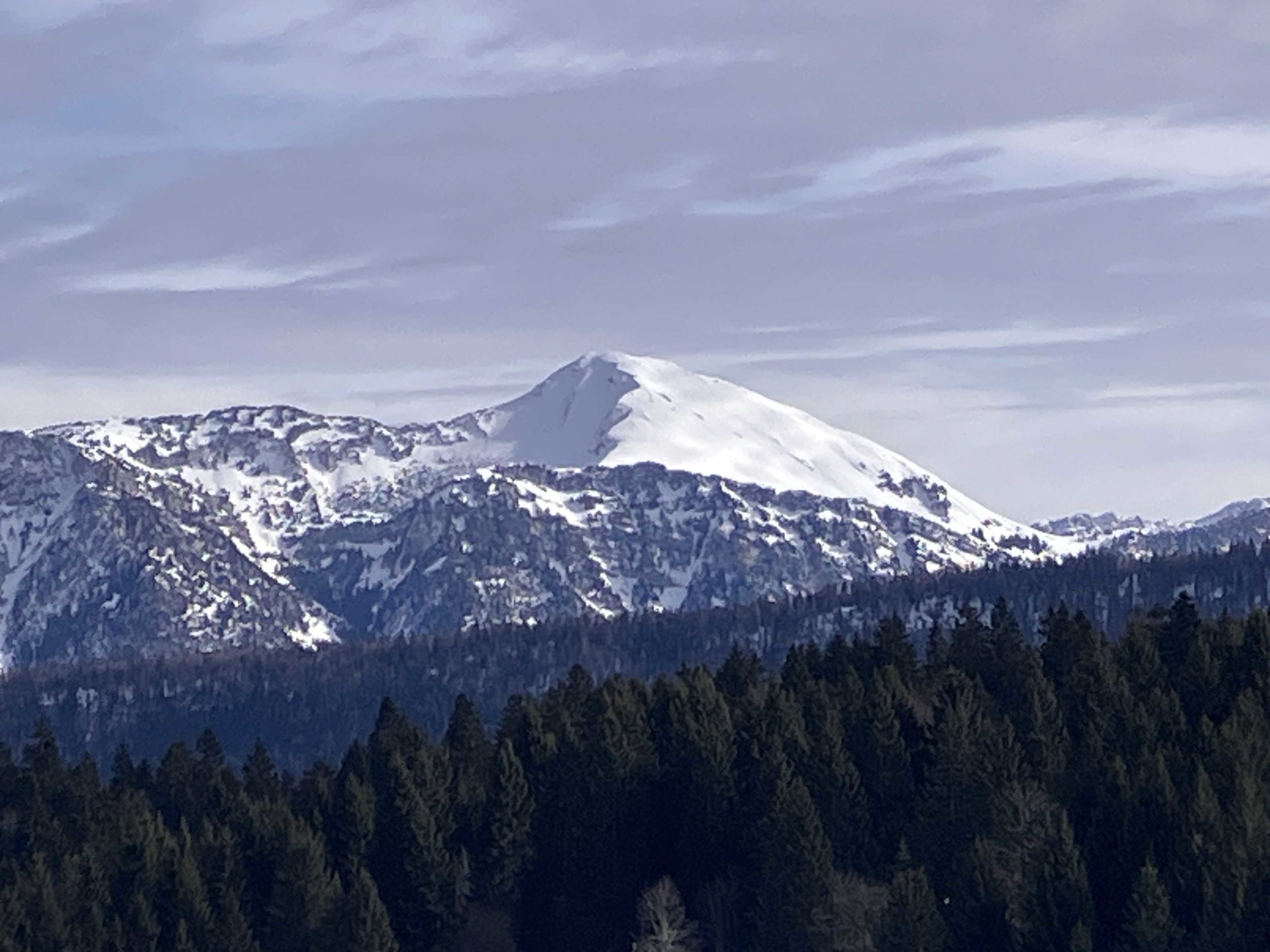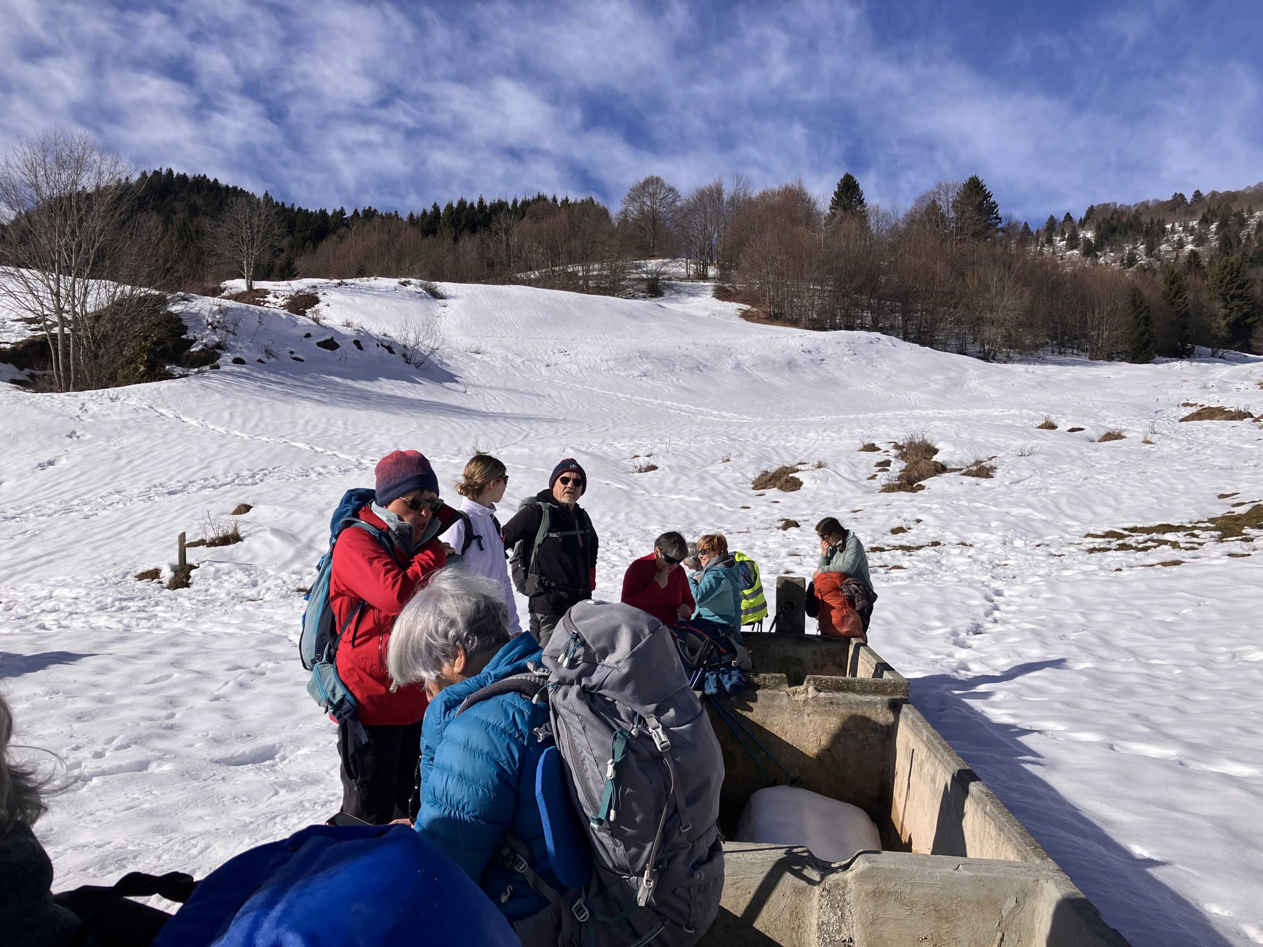 Il s’agit de bien se caler sur nos tapis dans la neige glacée : pas le confort de la terrasse de la Plate mais une vue magnifique… Nous reprenons notre parcours vers la croix : photos de groupe obligatoire ! Puis descente ardue vers le sentier de retour qui longe les pistes de skis dans le marais des Creusates.