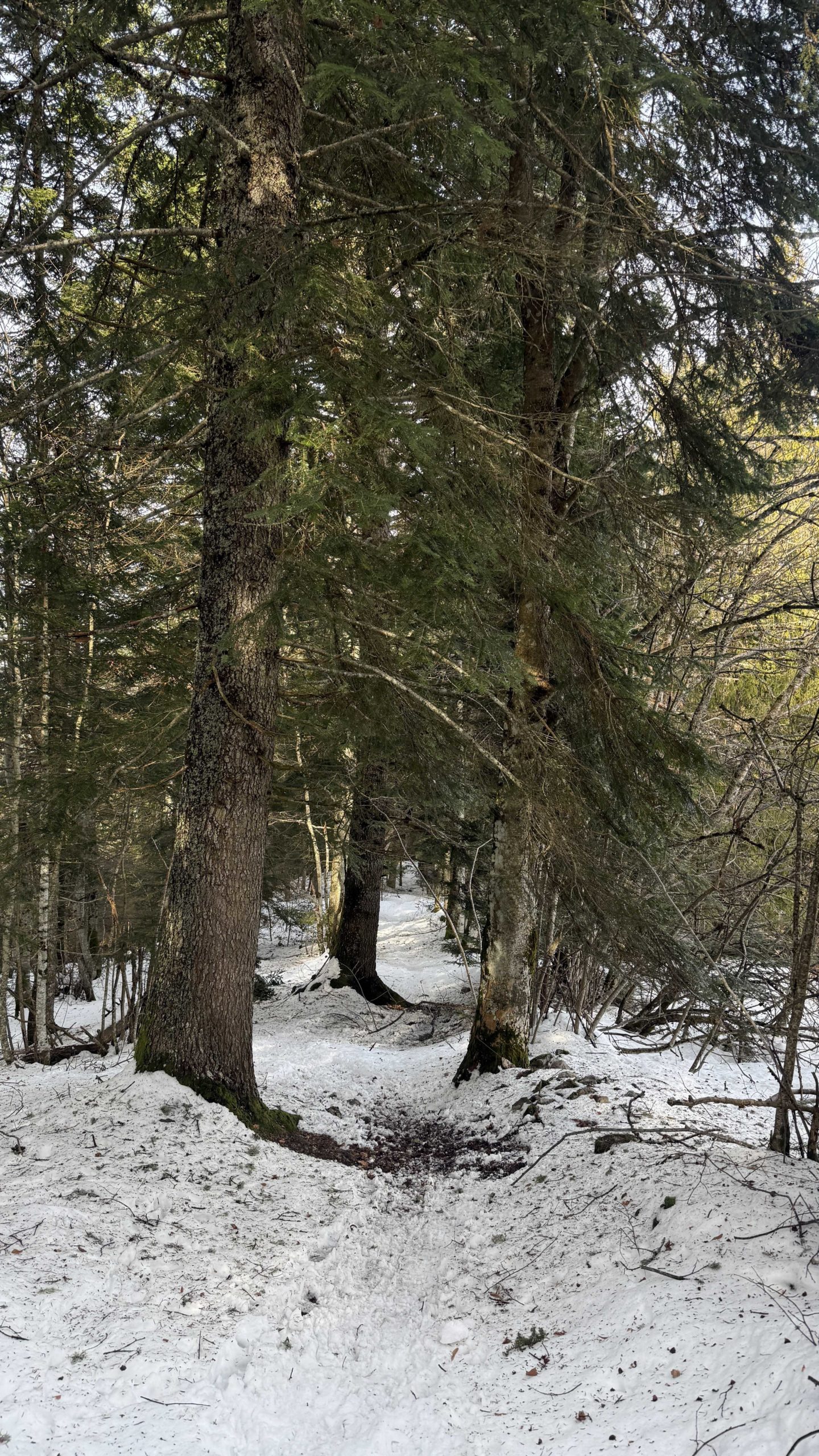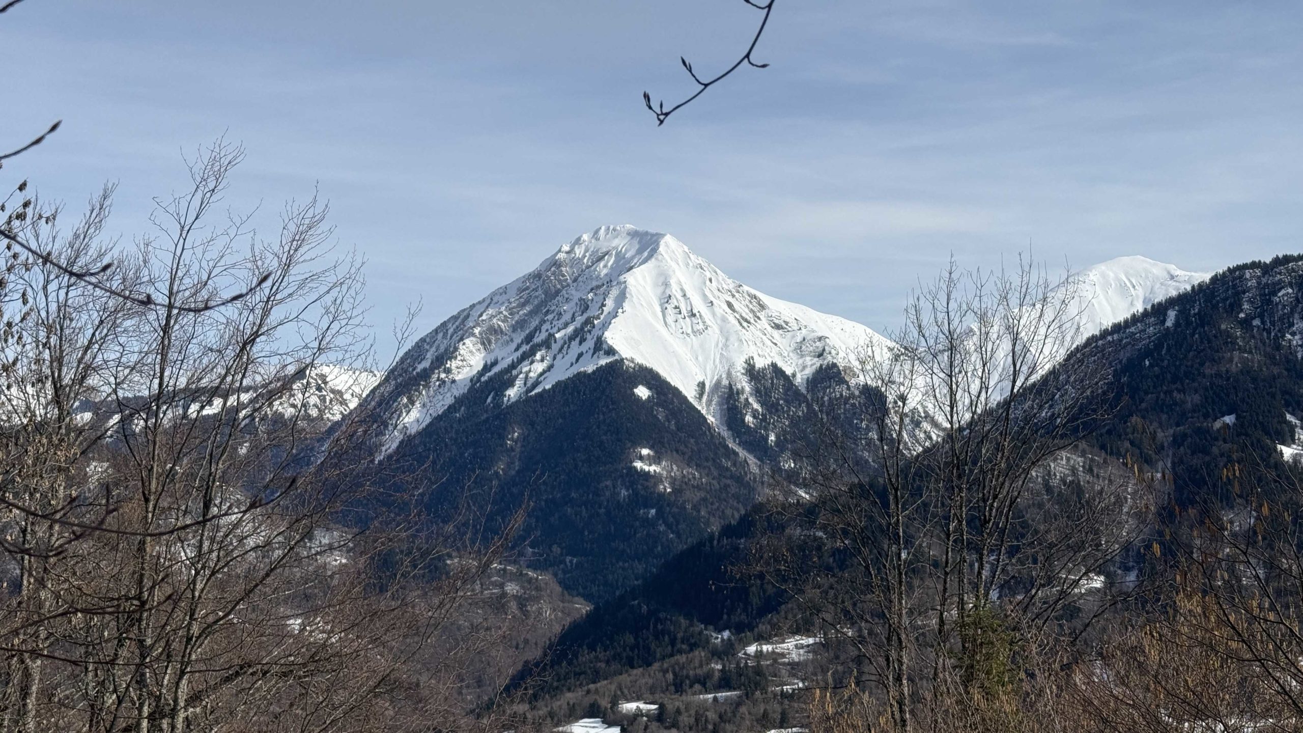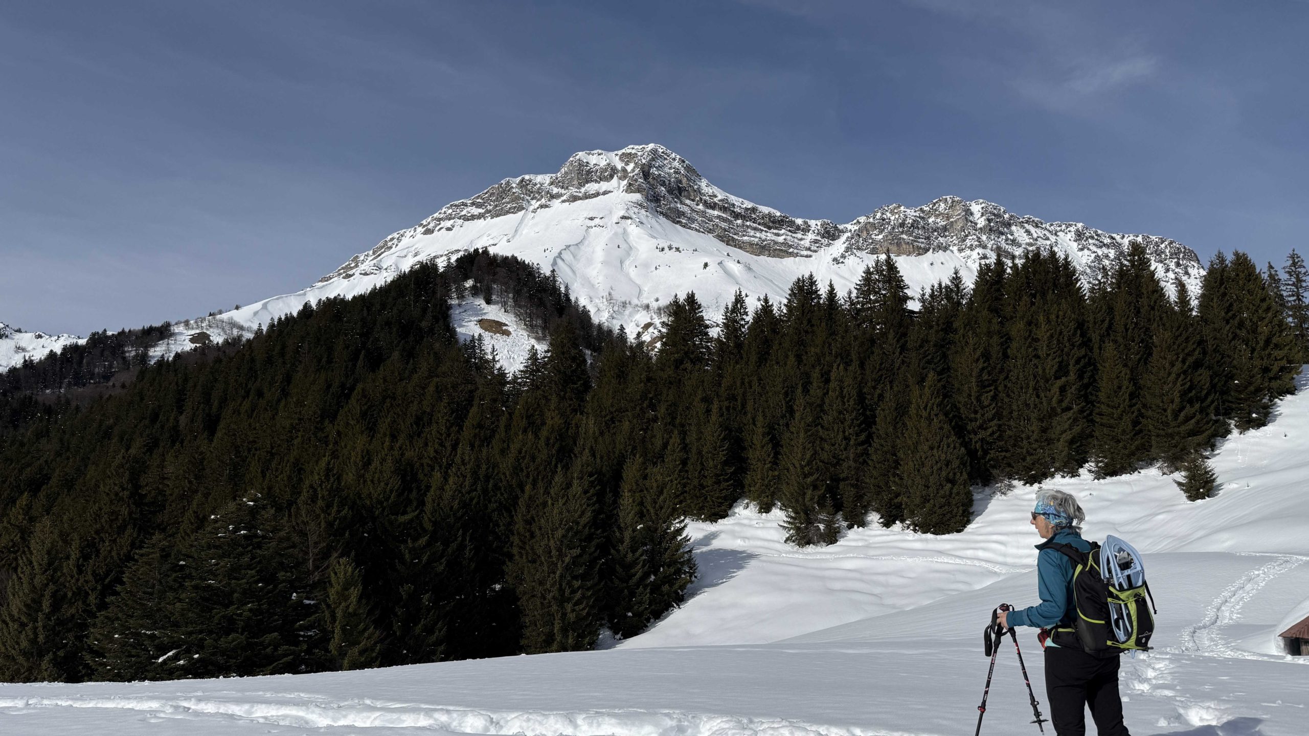 Injonction est donnée de mettre les raquettes sur les sacs ce qui au vu de l’ambiance au parking peut paraitre incongru… La première pente en forêt nous amène à la Chapelle St Bernard où apparaissent les premières zones enneigées amenant trois d’entre nous à chausser les raquettes. La progression continue sur la crête jusqu’au panneau Sous les Chalets de la Fullie à l’entrée de l’Alpage. La quantité de neige cumulée atteint maintenant plus d’un mètre et par le truchement du réchauffement diurne, la portance diminue considérablement rendant la progression énergivore et casse-patte étant dans l’impossibilité d’anticiper la profondeur où chaque pas va se terminer, pour les ceusses ayant préféré porter les raquettes sur le dos plutôt qu’aux pieds… LOL. Fin du parcours vers les fameux chalets avec une vue à 360° comme on les affectionne, même en l’absence du Mont Aiguille, des Aiguilles d’Arves ou du Mont Blanc. Pique-Nique dans la neige au soleil et sans vent, Michel nous octroie même une sieste bien appréciée.