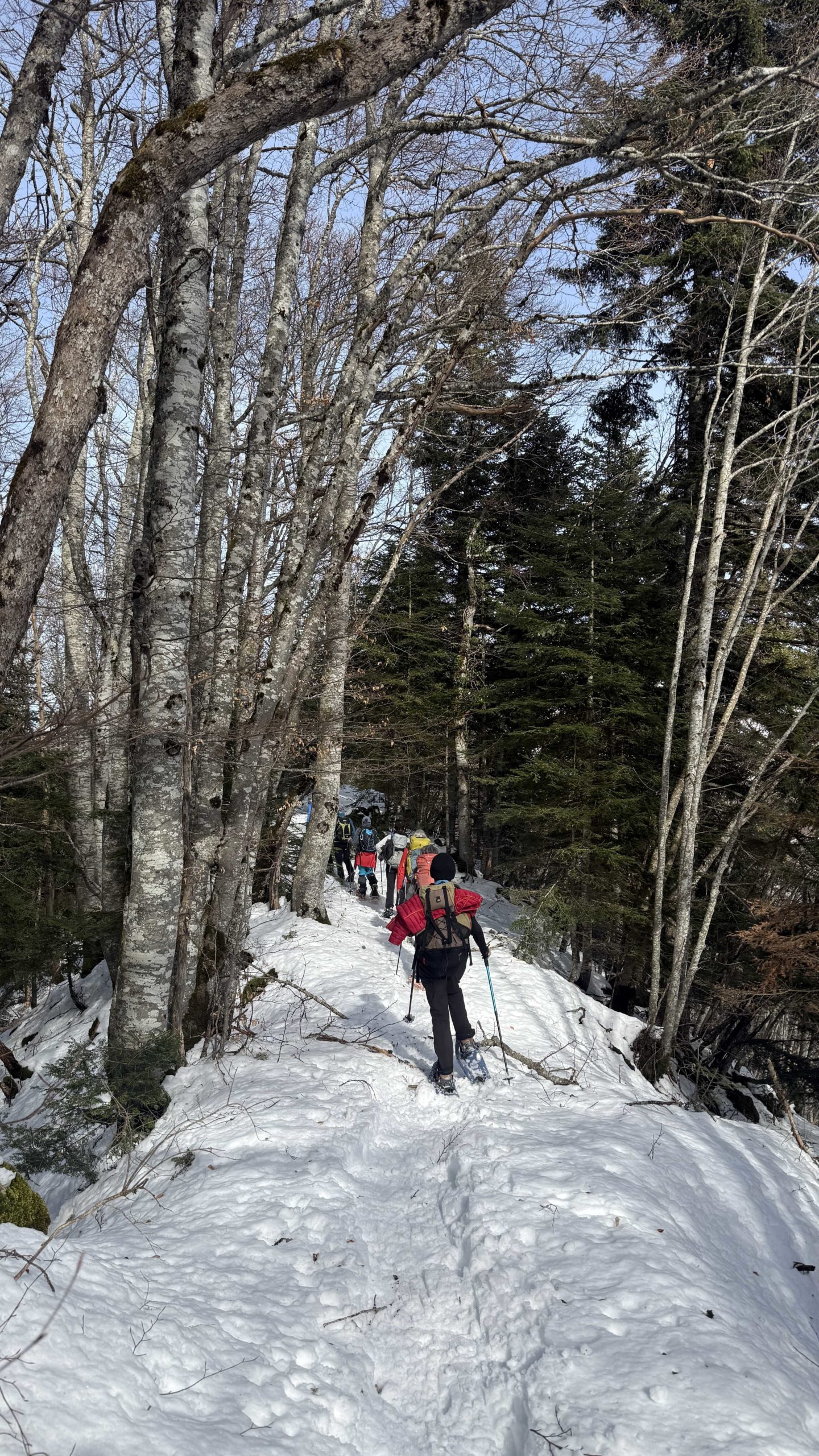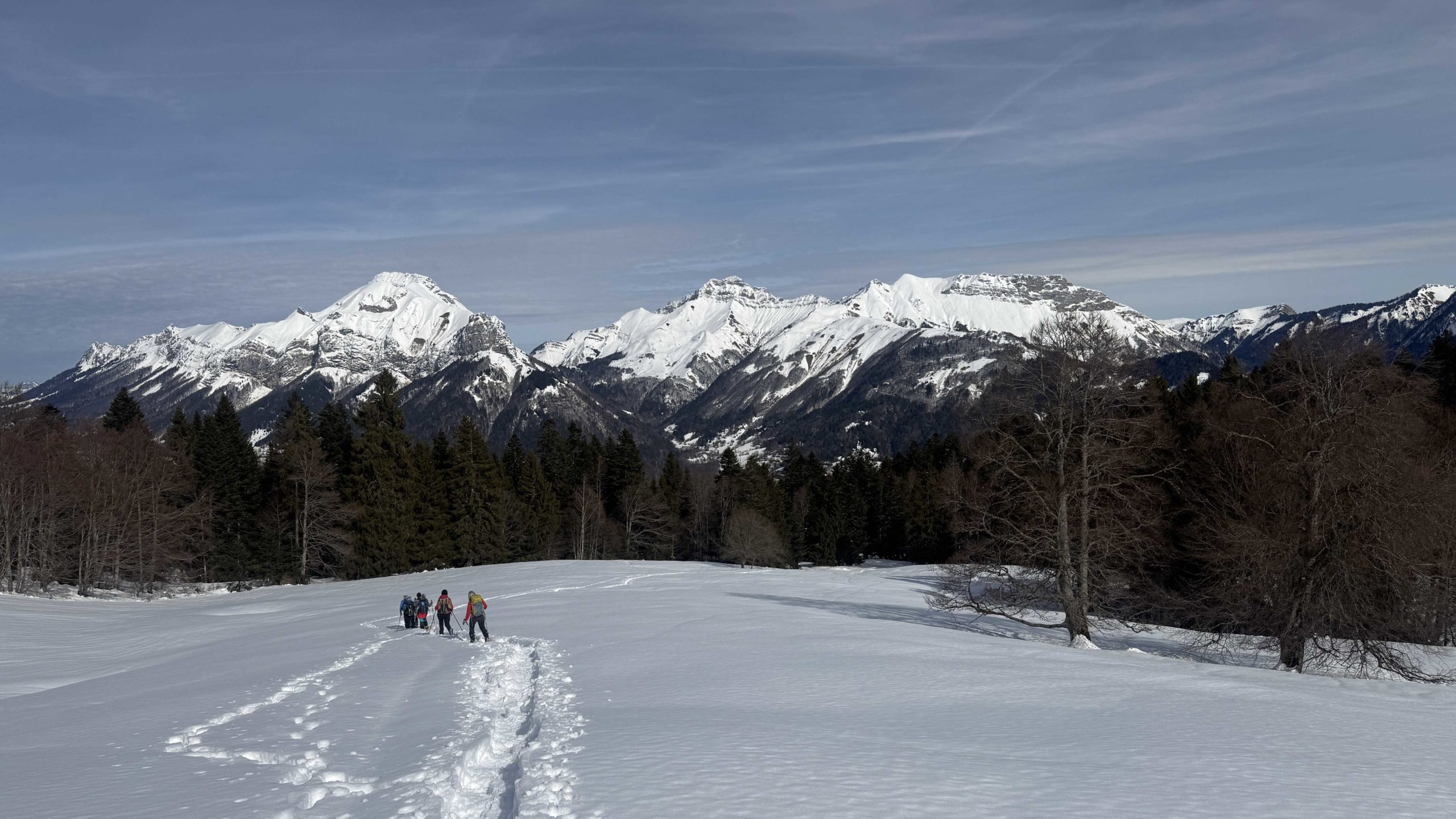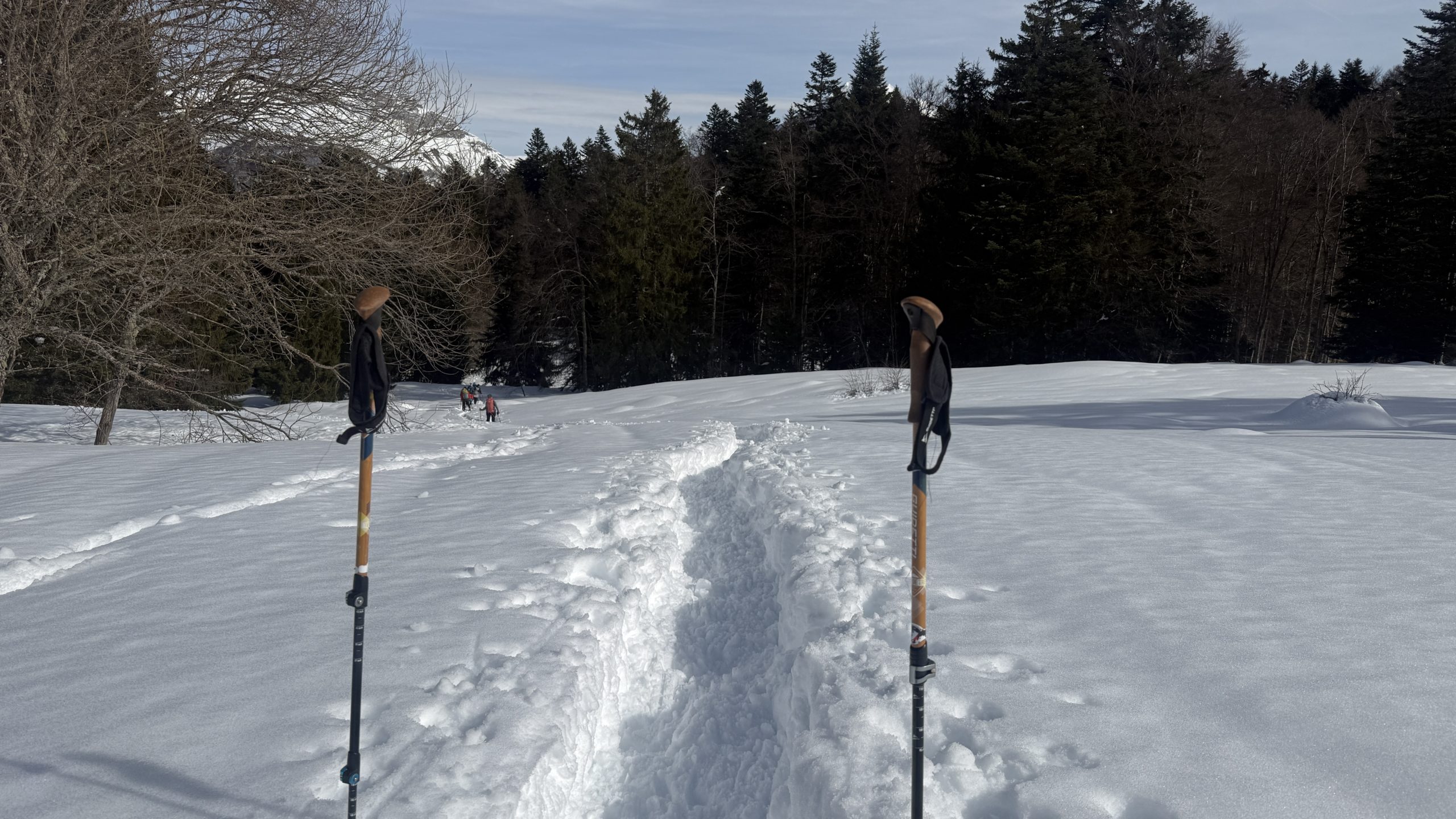Pour le retour, tout le monde chausse les raquettes, la neige porte encore moins qu’à l’aller et même les moins fans se rallient. Descente agréable bien que finalement assez raide et longue, c’est peut-être l’effet de l’AR quand dans une boucle l’effet de surprise joue à fond.