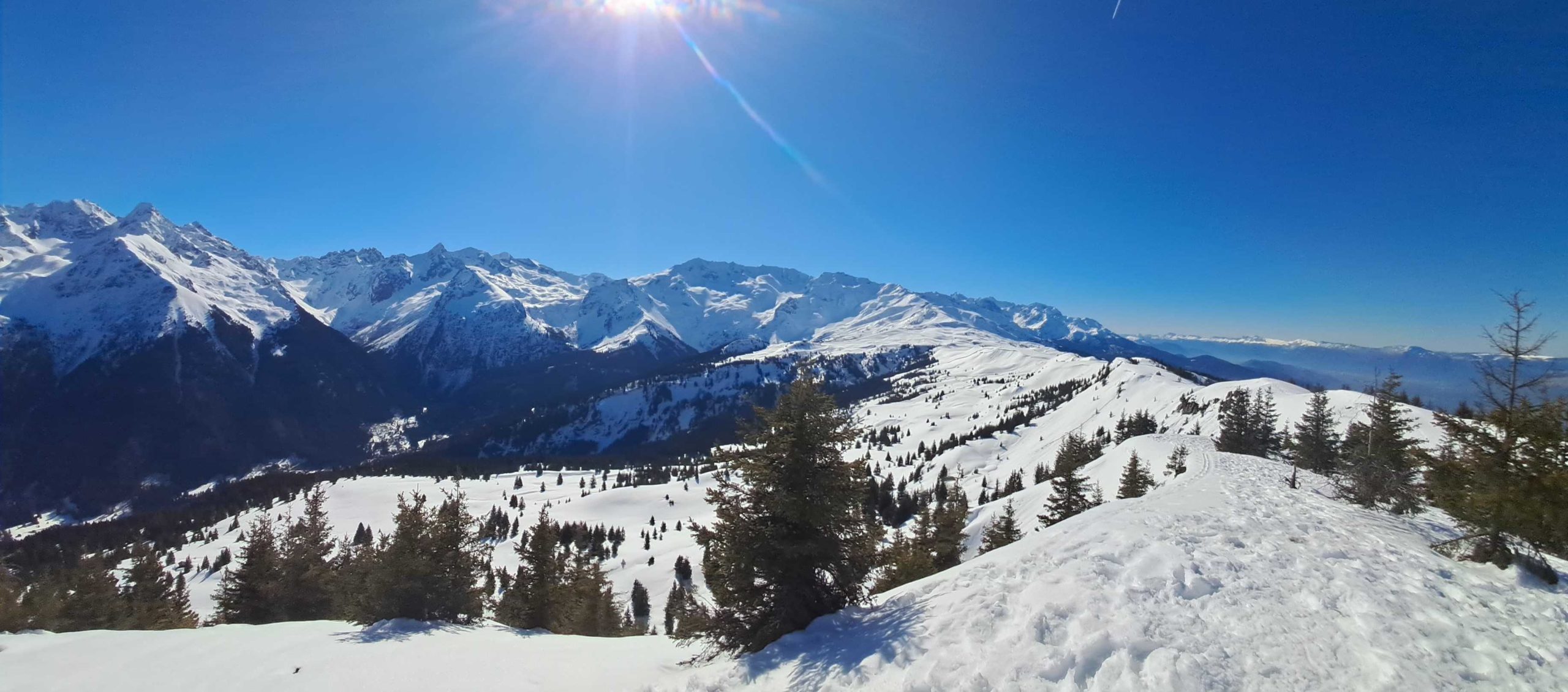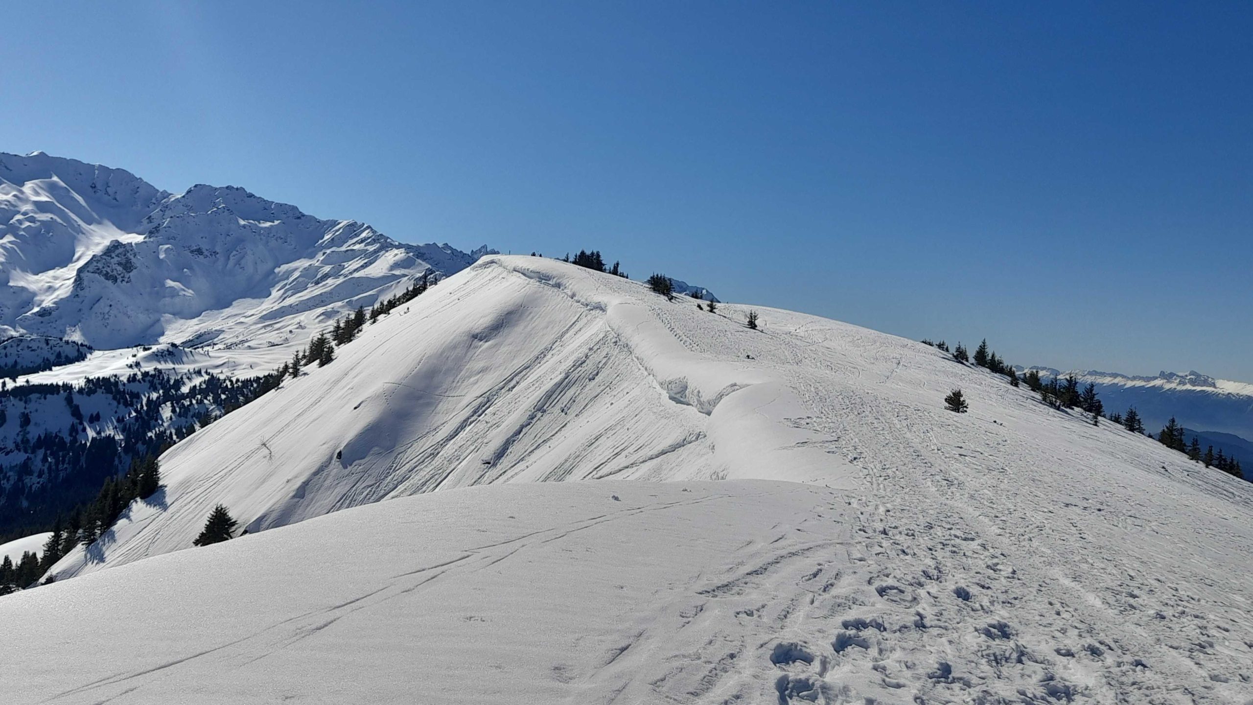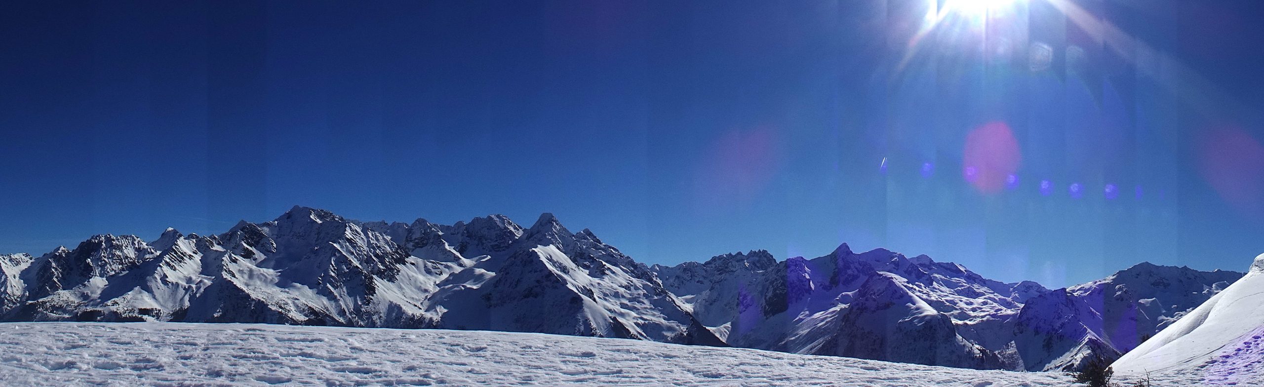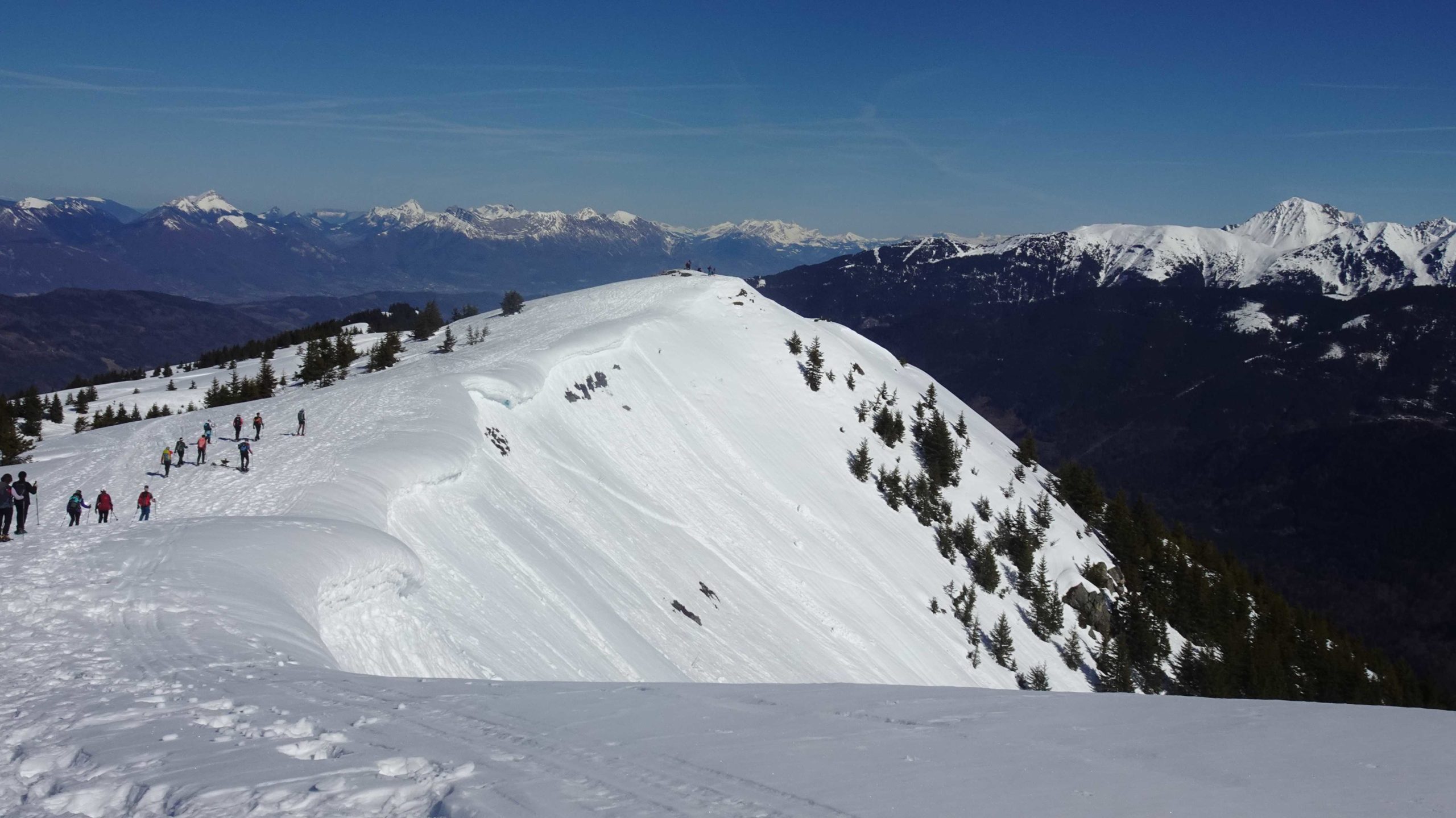Après les éléments déchaînés de la semaine précédente…inondations, avalanches…(sauf pour ceux qui ont eu la chance d’aller chercher le printemps dans le Tanneron), nous sommes tous contents de profiter de cette belle journée qui s’annonce, au plus près de chez nous, durant cette période de congés scolaires. A notre arrivée, nous ne sommes pas seuls à avoir eu la même idée ! Départ du foyer de ski de fond du Barioz, nous prenons le sentier en forêt pour atteindre le chalet Roubet. La petite station familiale semble évoluer…Un stade de tir, en vue du biathlon, a été installé, le domaine nordique s’est étendu, damé et balisé. Petite halte, sous le chalet, Michel passe quelques consignes à Patrick, qui est en formation animateur. Voici un bon exercice pratique ! Michel indique un risque d’avalanche éventuel, docilement, nous contournons. Puis, vers la droite et longer la crête. Arrivée sur un superbe espace nordique, les sommets sont à portée de main, c’est magnifique ! Nous gagnons la ligne de crête, sans toutefois trop s’approcher du bord, un bourrelet qui ne demande qu’à partir… pour arriver à la croix marquant le sommet. Magnifique vue sur Belledonne, difficile de s’en détacher..