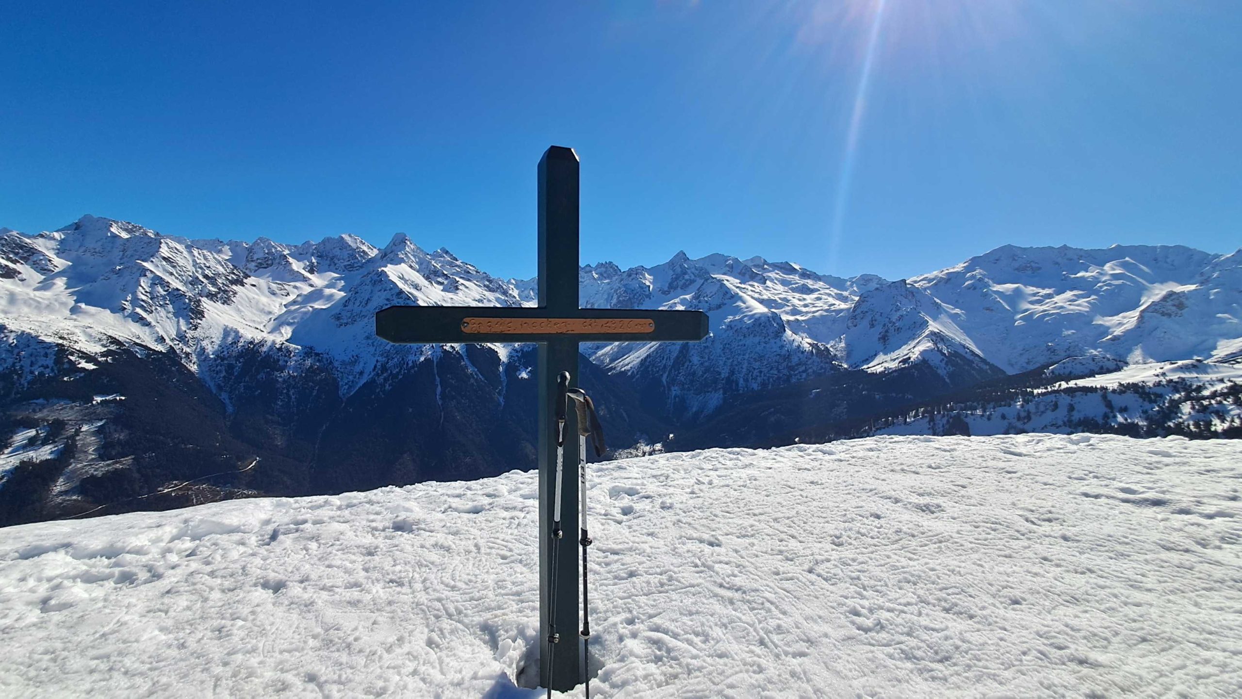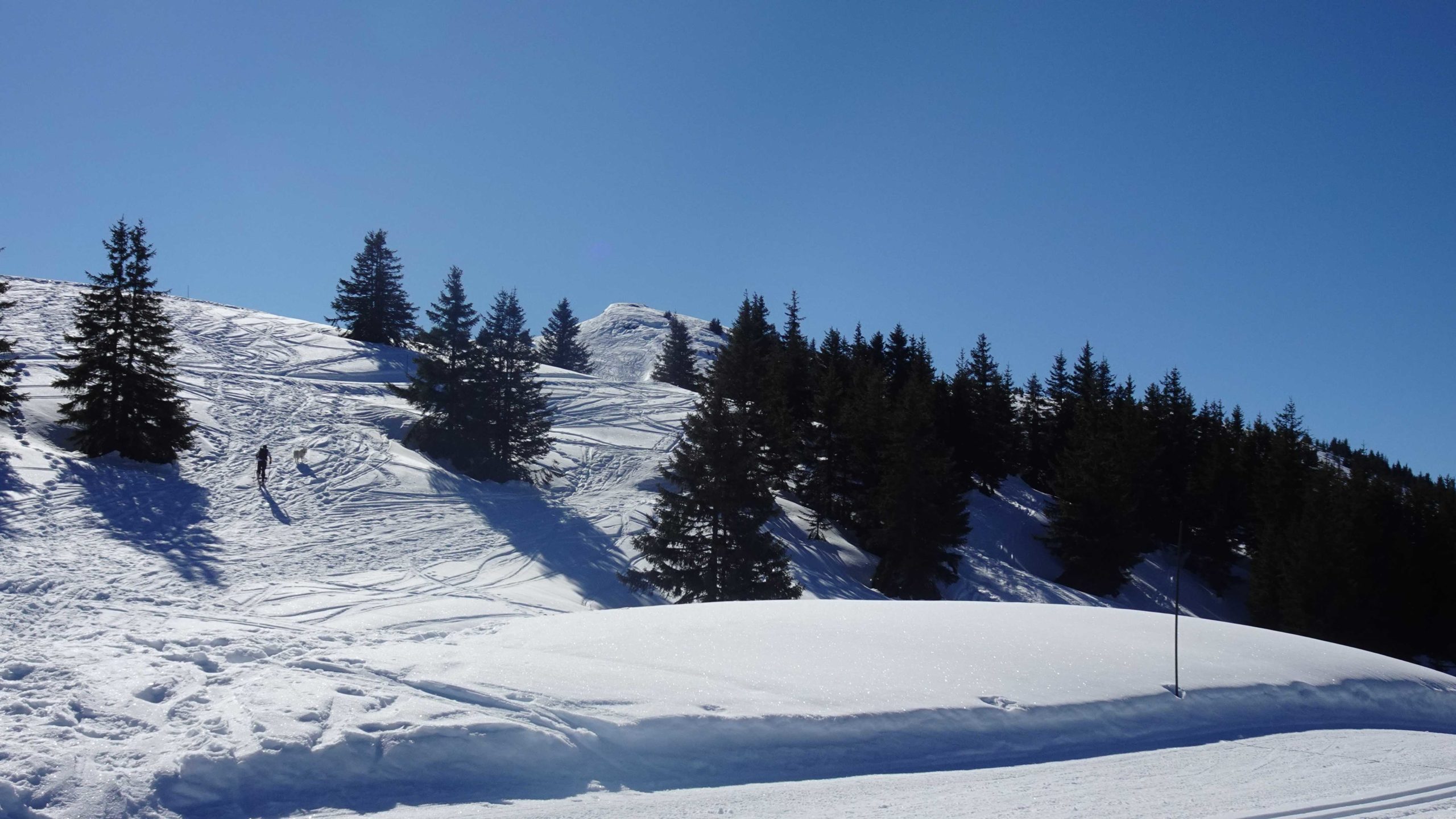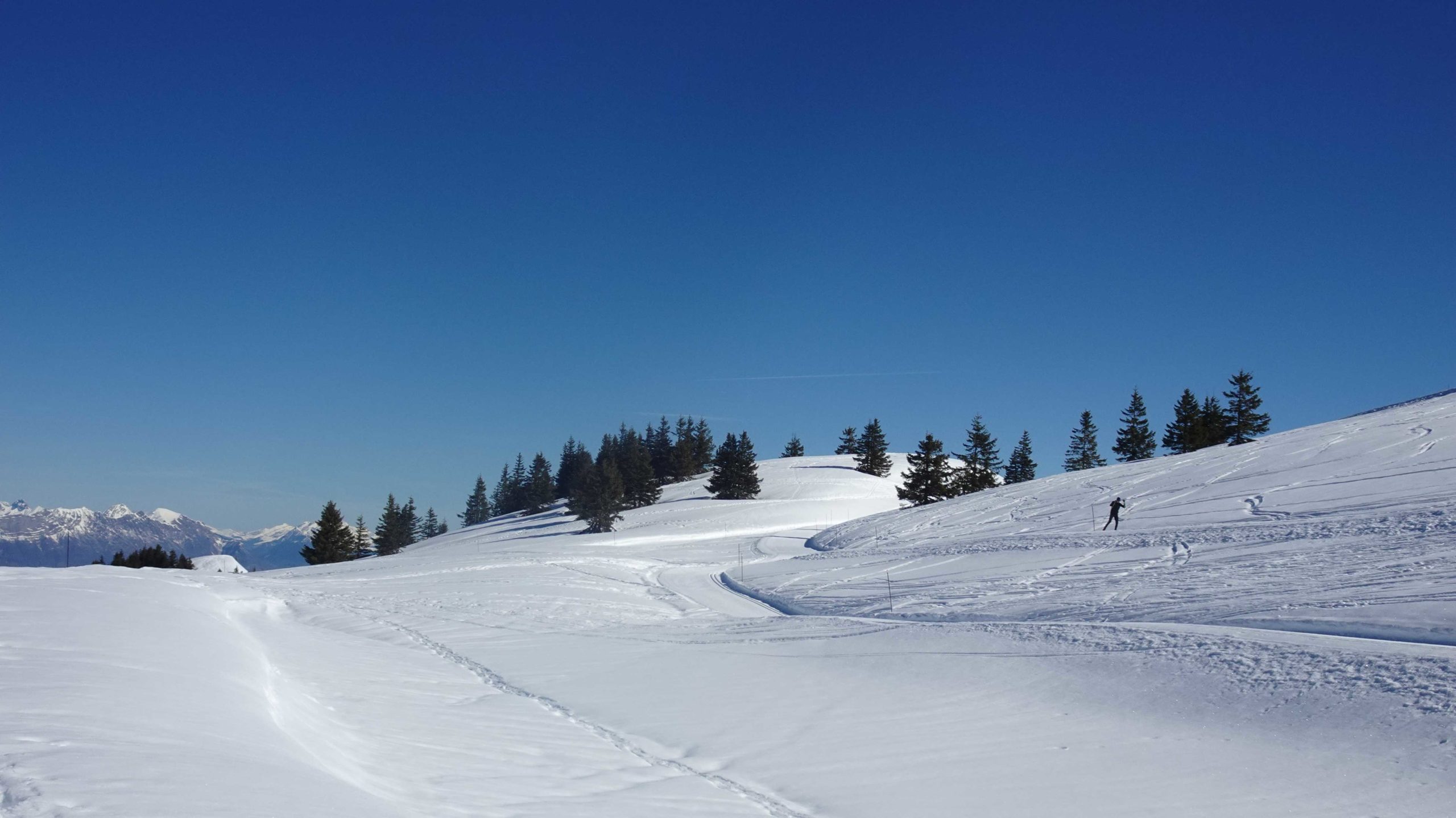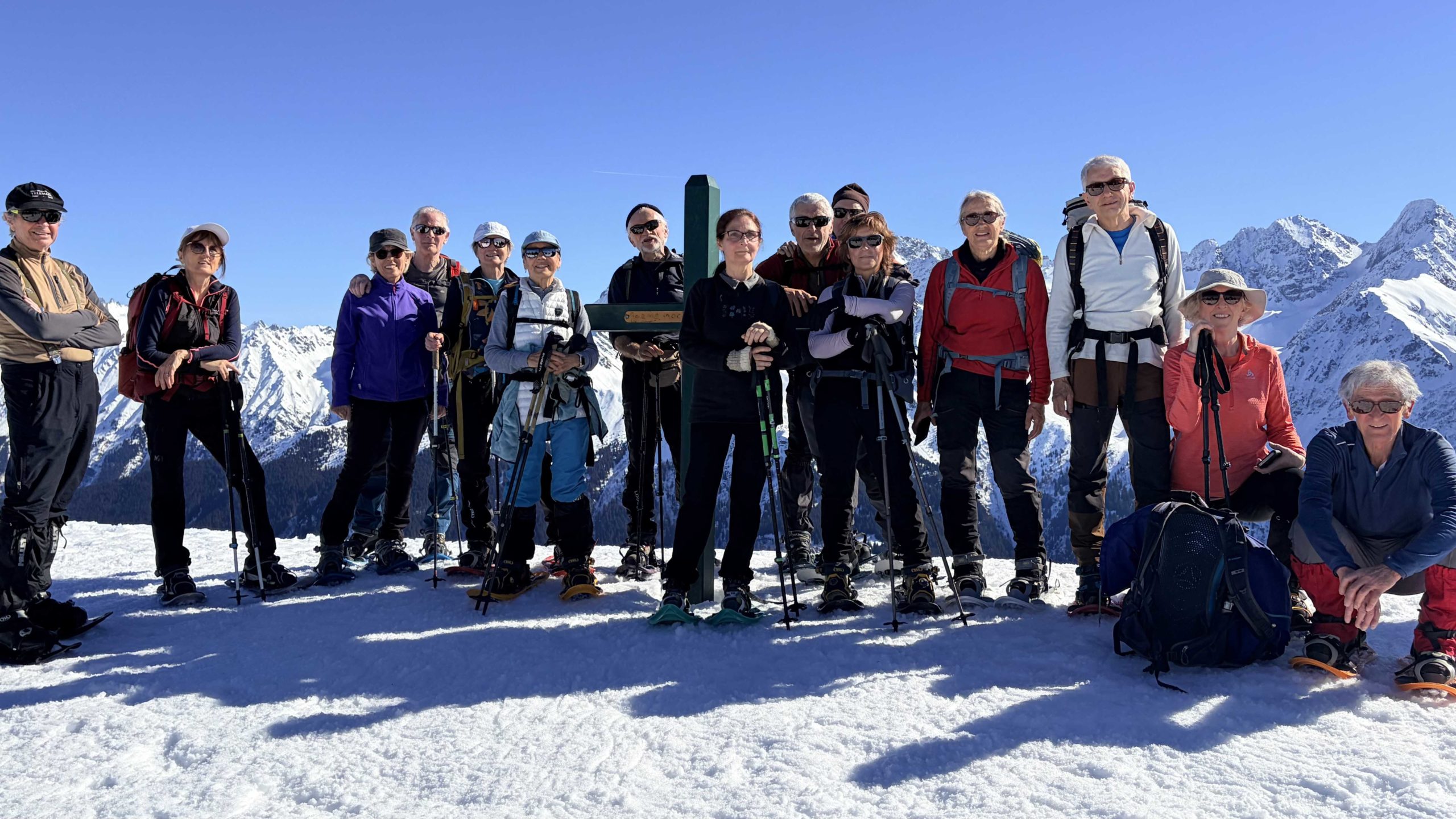 Après les éléments déchaînés de la semaine précédente…inondations, avalanches…(sauf pour ceux qui ont eu la chance d’aller chercher le printemps dans le Tanneron), nous sommes tous contents de profiter de cette belle journée qui s’annonce, au plus près de chez nous, durant cette période de congés scolaires. A notre arrivée, nous ne sommes pas seuls à avoir eu la même idée ! Départ du foyer de ski de fond du Barioz, nous prenons le sentier en forêt pour atteindre le chalet Roubet. La petite station familiale semble évoluer…Un stade de tir, en vue du biathlon, a été installé, le domaine nordique s’est étendu, damé et balisé. Petite halte, sous le chalet, Michel passe quelques consignes à Patrick, qui est en formation animateur. Voici un bon exercice pratique ! Michel indique un risque d’avalanche éventuel, docilement, nous contournons. Puis, vers la droite et longer la crête. Arrivée sur un superbe espace nordique, les sommets sont à portée de main, c’est magnifique ! Nous gagnons la ligne de crête, sans toutefois trop s’approcher du bord, un bourrelet qui ne demande qu’à partir… pour arriver à la croix marquant le sommet. Magnifique vue sur Belledonne, difficile de s’en détacher..