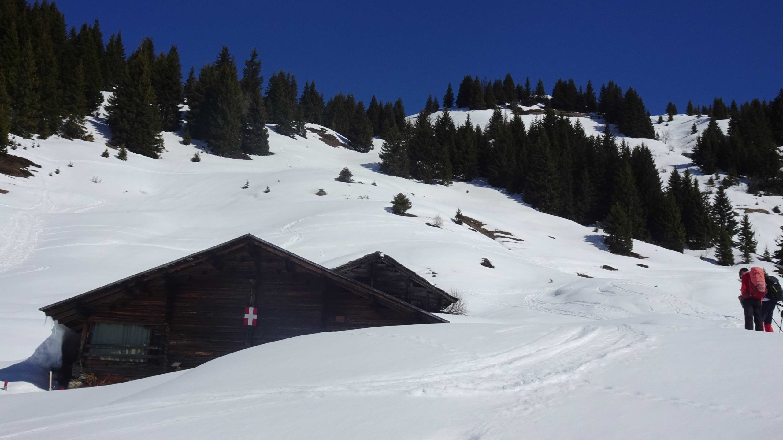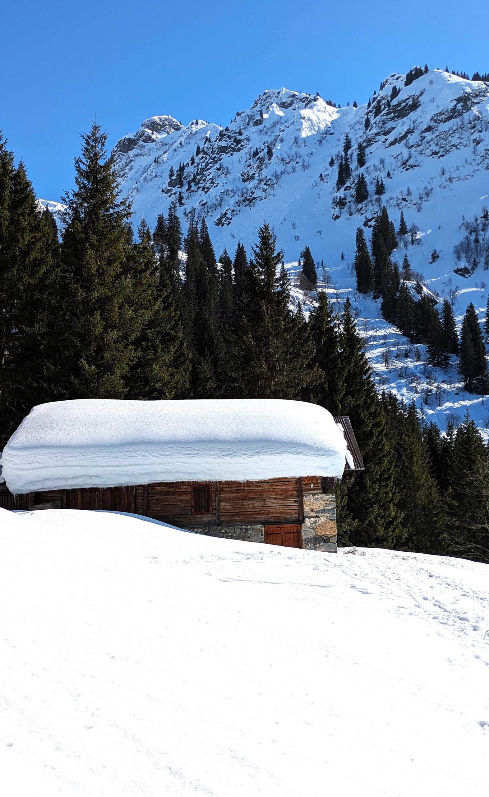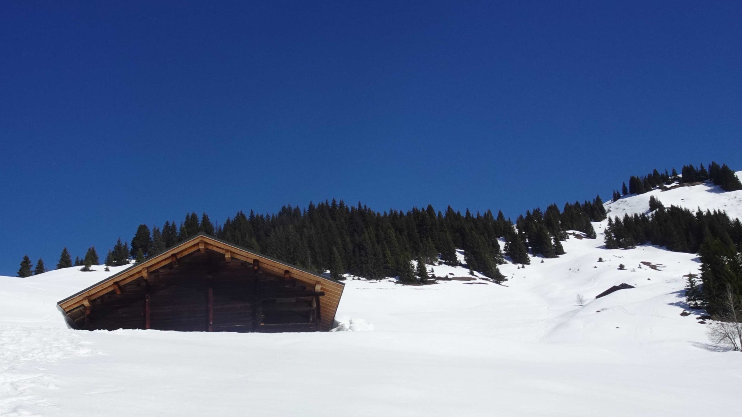 Les premiers chalets nous accueillent sur les alpages avec le soleil. La vue est magnifique, la neige profonde.