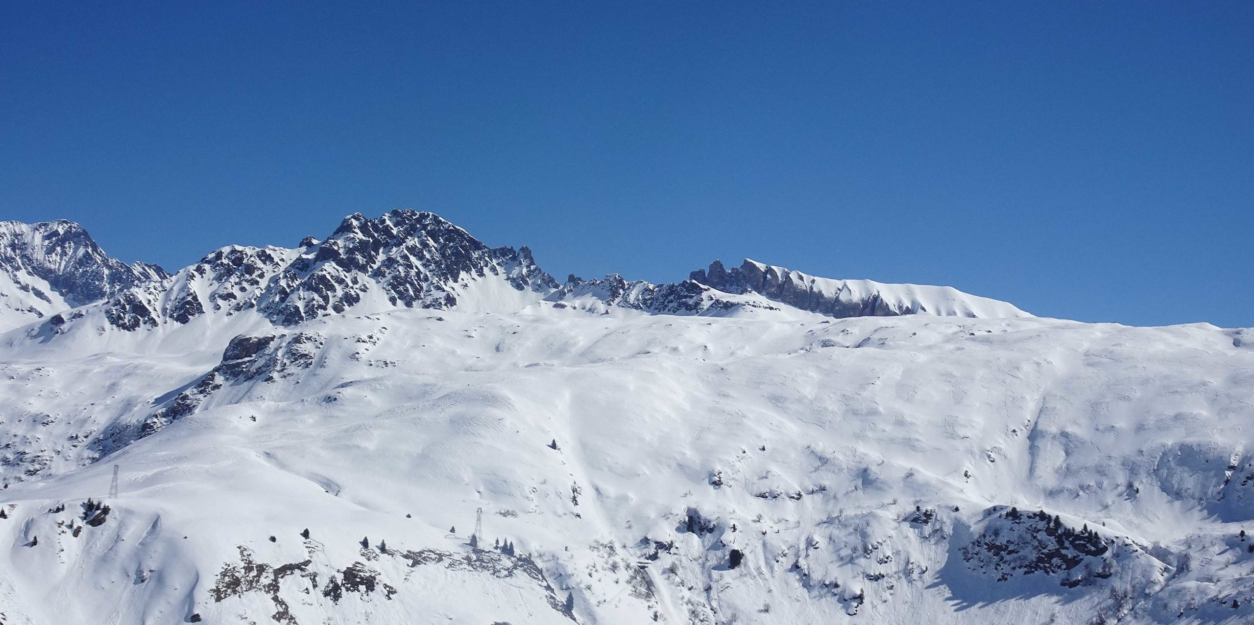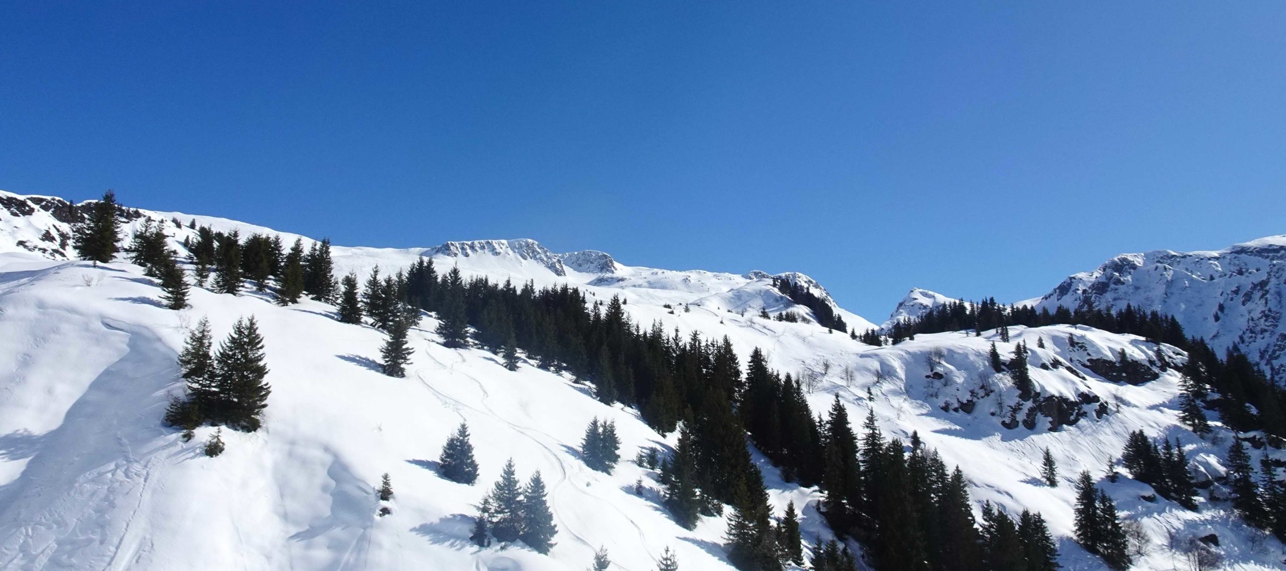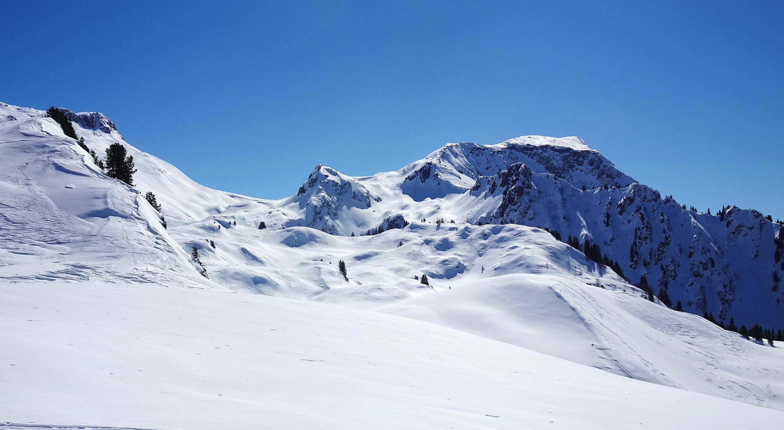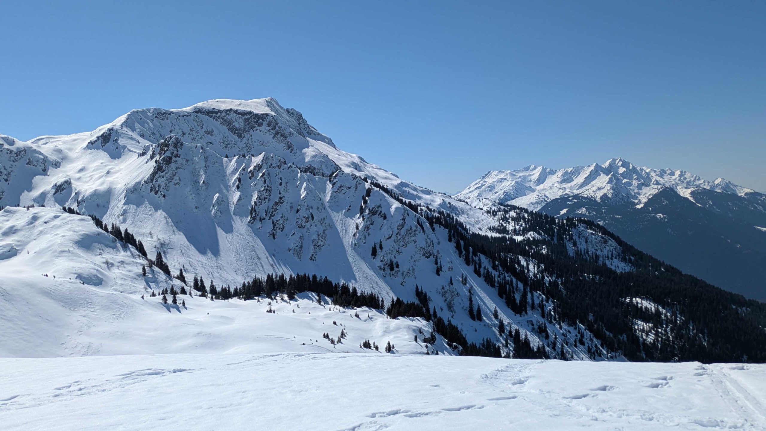 Les premiers chalets nous accueillent sur les alpages avec le soleil. La vue est magnifique, la neige profonde.