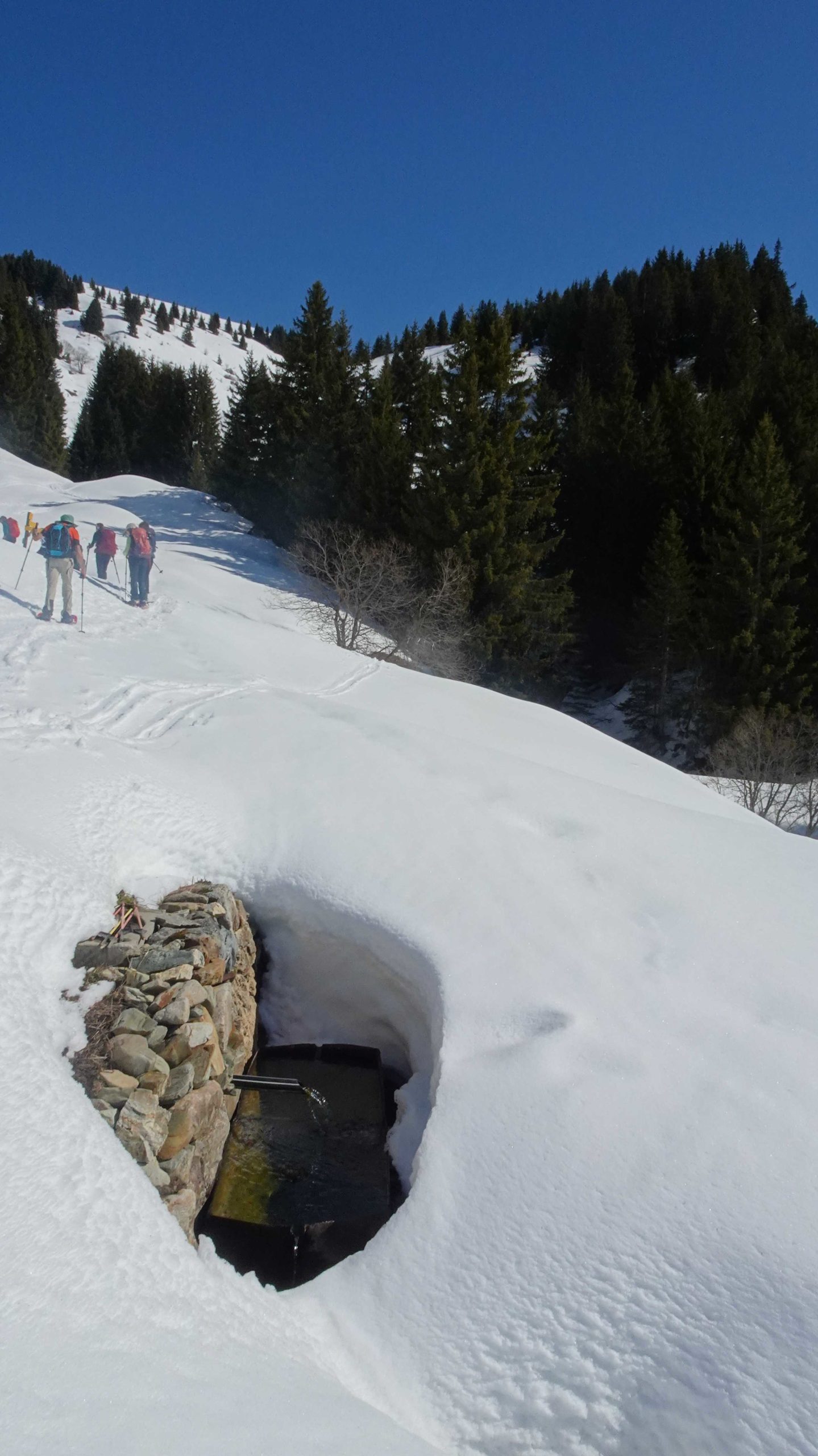Nous démarrons à 10 h au hameau des Granges de Hauteluce, raquettes aux pieds. Claudine mène l’équipe. Le début en forêt est raide, mais nous étions prévenus, donc la montée est lente et régulière.