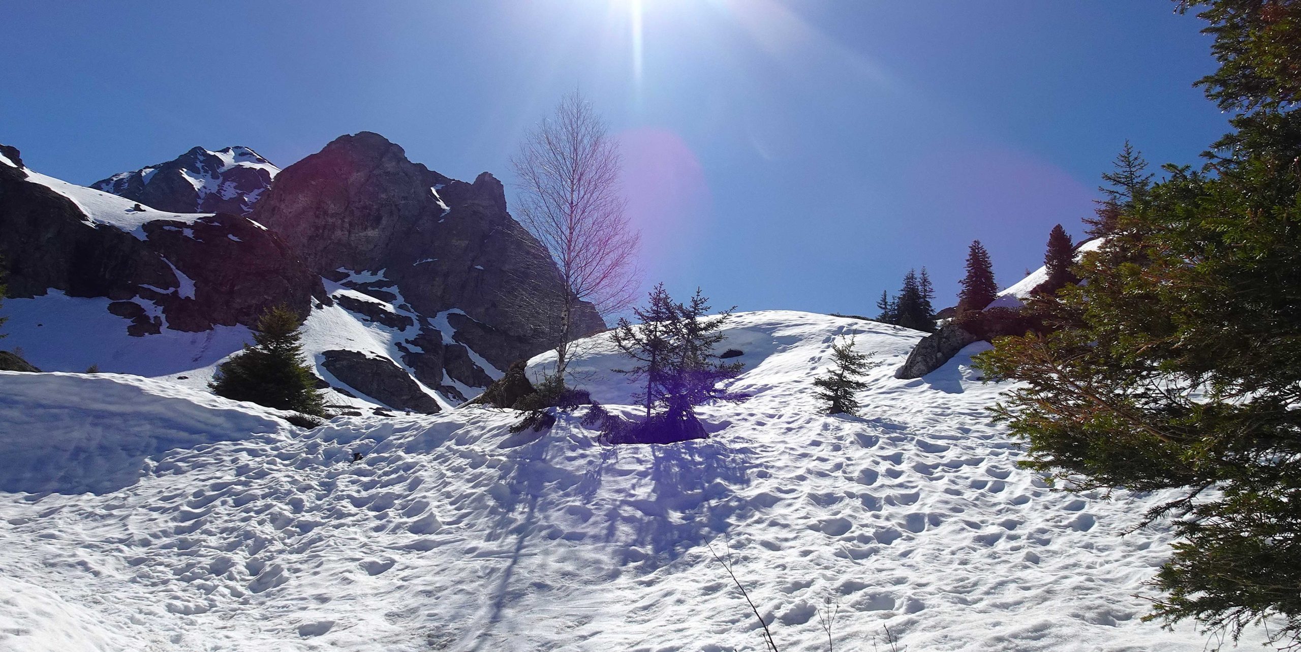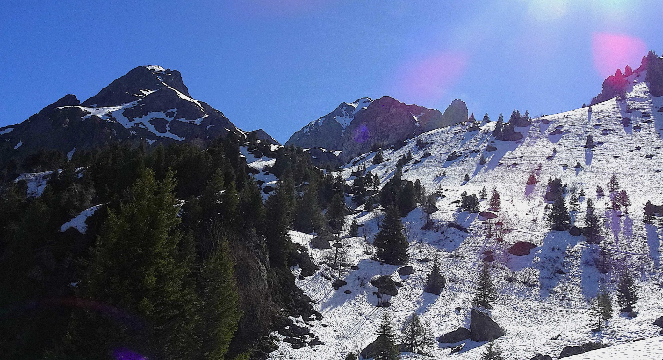 Après 1 km de piste, cahotés, nous arrivons au plus près du point de départ (1370m). Les 2 hommes, en tête grimpent assez fort, enfin…pour le diesel – que je suis – qui a besoin d’un peu plus de temps pour atteindre son rythme…(Pas le moment de péter une durite !) ! Montée en sous-bois dans une pente régulière, soutenue. Dès l’apparition d’une couche croûtée, nous chaussons les crampons, le manteau neigeux étant encore assez épais. En sortie de forêt, le chemin s’aplanit et laisse place aux sommets de Belledonne. A gauche, la Chartreuse s’étire dans toute son horizontalité. Nous traversons quelques blocs rocheux avant d’arriver sous la conduite du barrage et enfin, le fameux lac du Crozet se dévoile sous son manteau blanc !