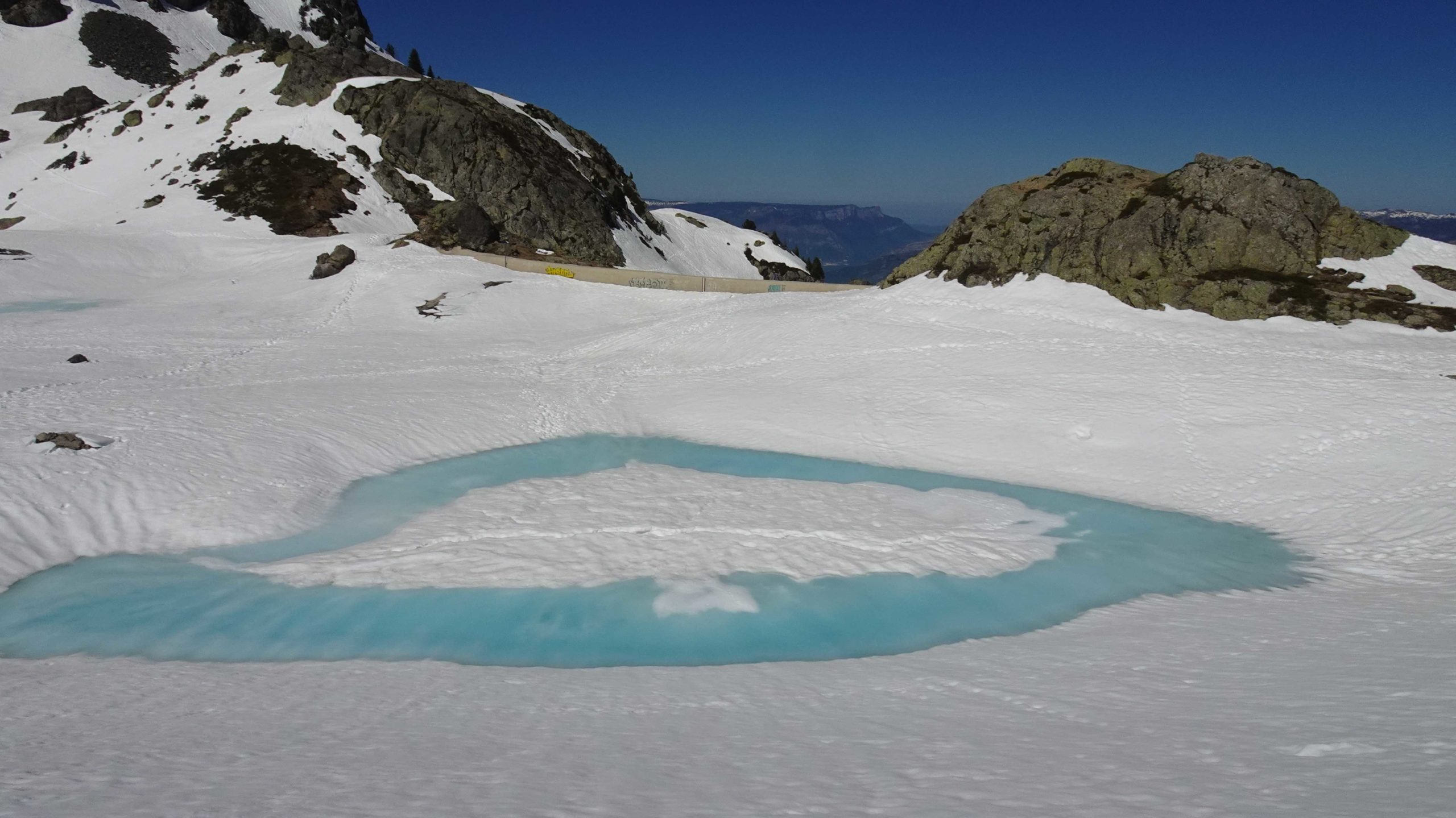 Nous ne l’avions jamais vu ainsi. J’avais tellement envie de le voir sous cet aspect, et je ne suis pas la seule ! Sous la couche de glace qui commence à fondre, des reflets bleutés, voire turquoise ! La glace se fissure, craquèle sous les températures printanières. Cette couche de neige et de glace brisée est liée à une vidange hivernale du lac. La baisse du niveau du lac a fracturé la surface gelée sur les rives (info extérieure)