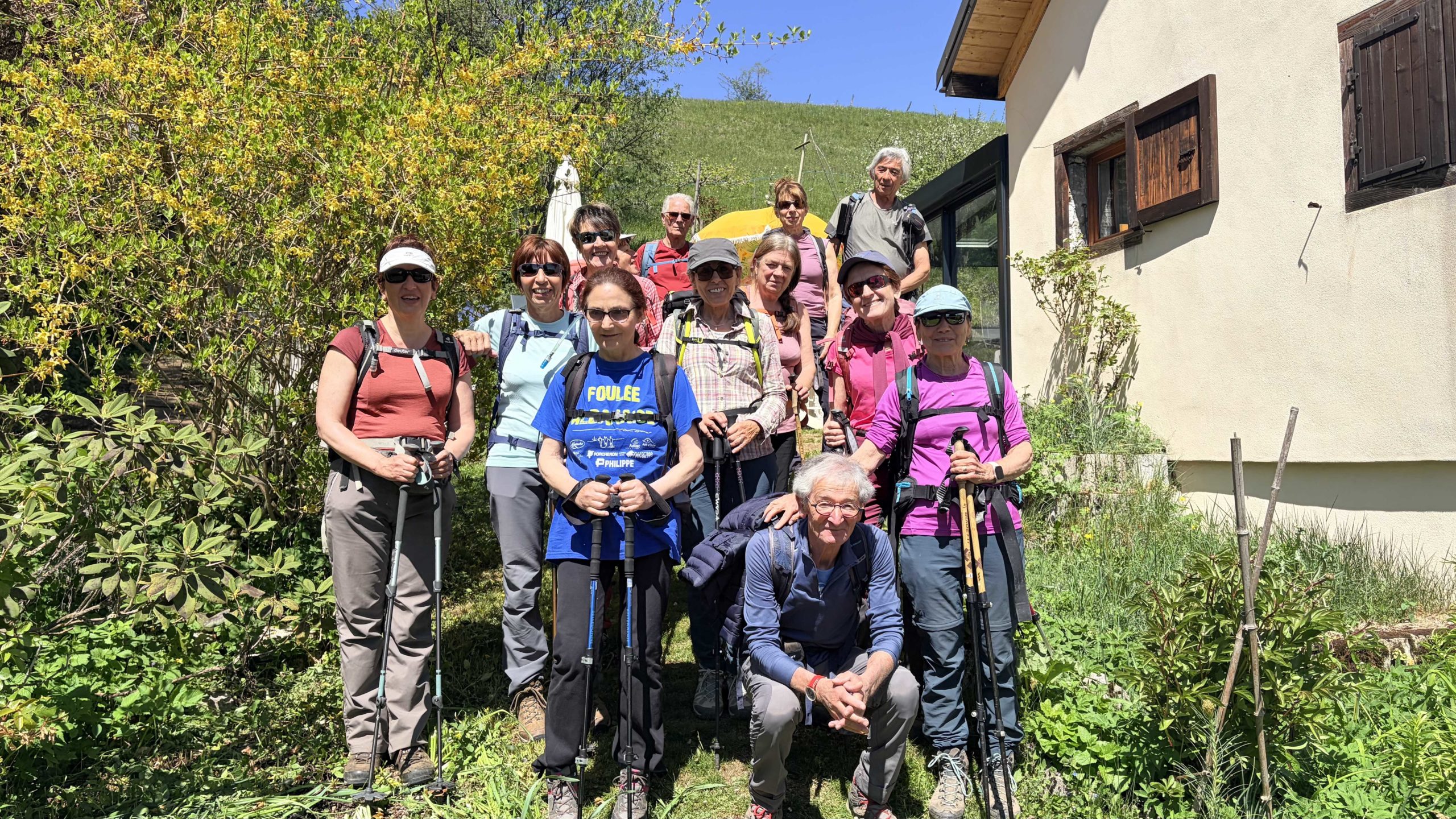 Nous sommes 14 aujourd’hui. La montée par le chemin des Dégoutés est raide et en forêt. Nous débouchons bientôt sur le plateau, à St Georges. La vue sur Belledonne est superbe.